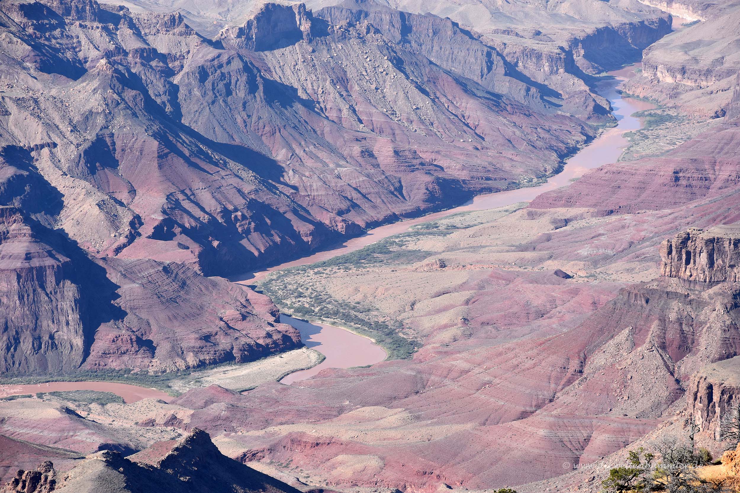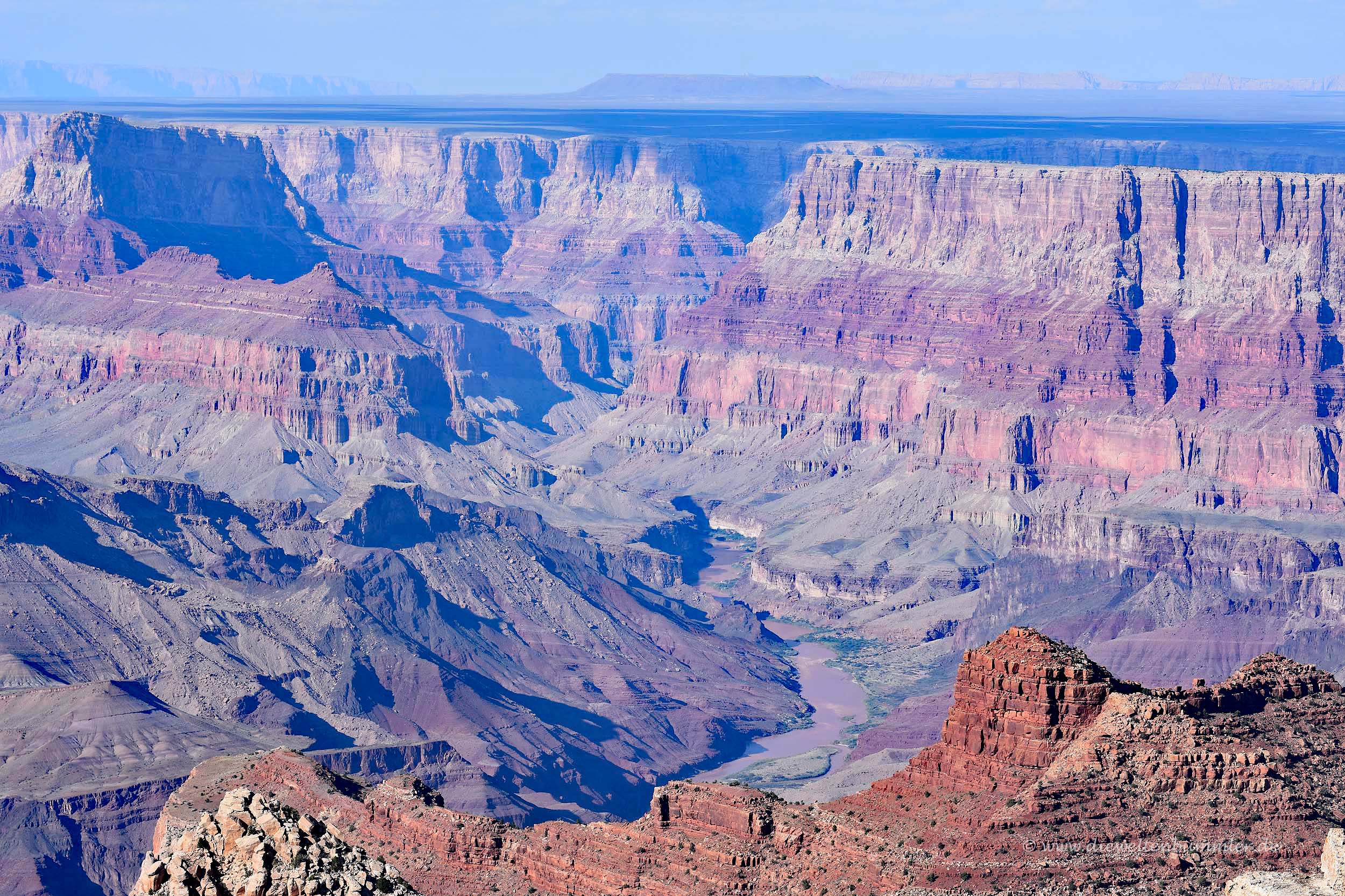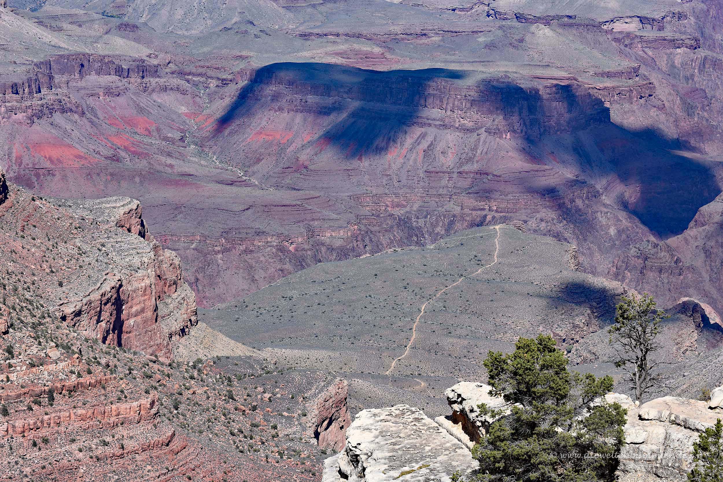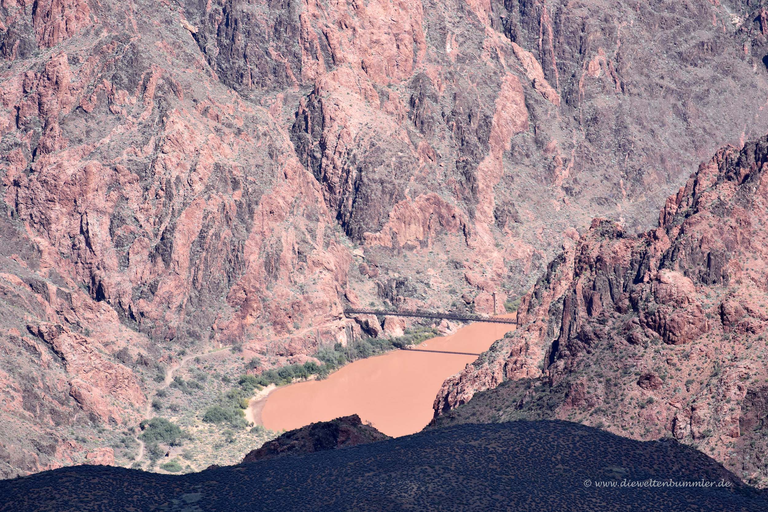Gleichzeitig steht man dort direkt an der Abbruchkante des Canyons und kann diesen weit überblicken. Idealerweise hat man dabei die Sonne im Rücken.Das Gegenstück dazu ist der deutlich überschaubarer ausgebaute North Rim auf der anderen Seite. Beide Plätze liegen ca. 17 km Luftlinie auseinander und sind durch den Rim Trail bzw. den Bright Angel Trail miteinander verbunden. Das heißt, man kann dem Wanderweg in den Canyon hinein folgen, weit unten den Colorado River überqueren und auf der anderen Seite den Aufstieg angehen.