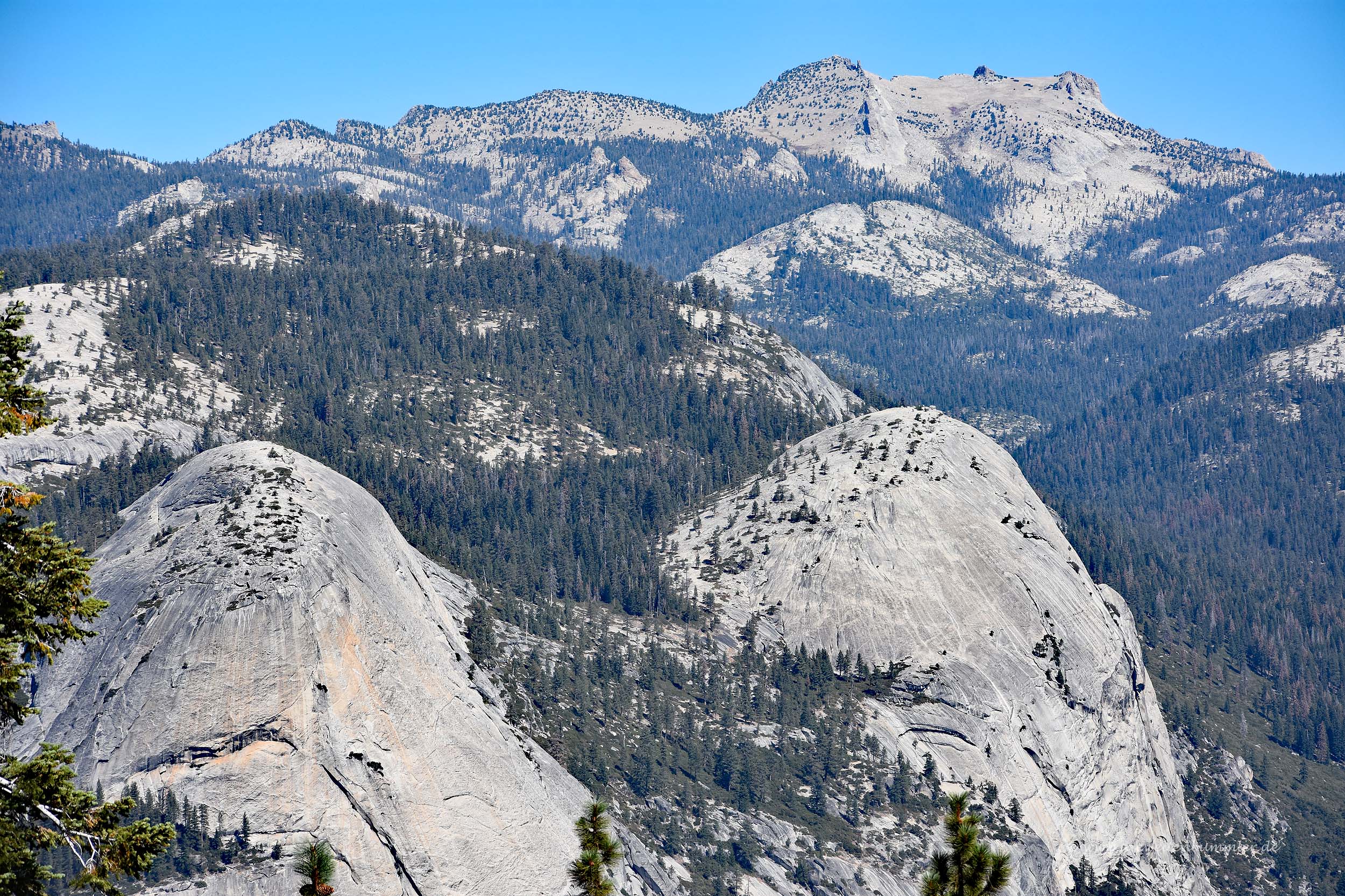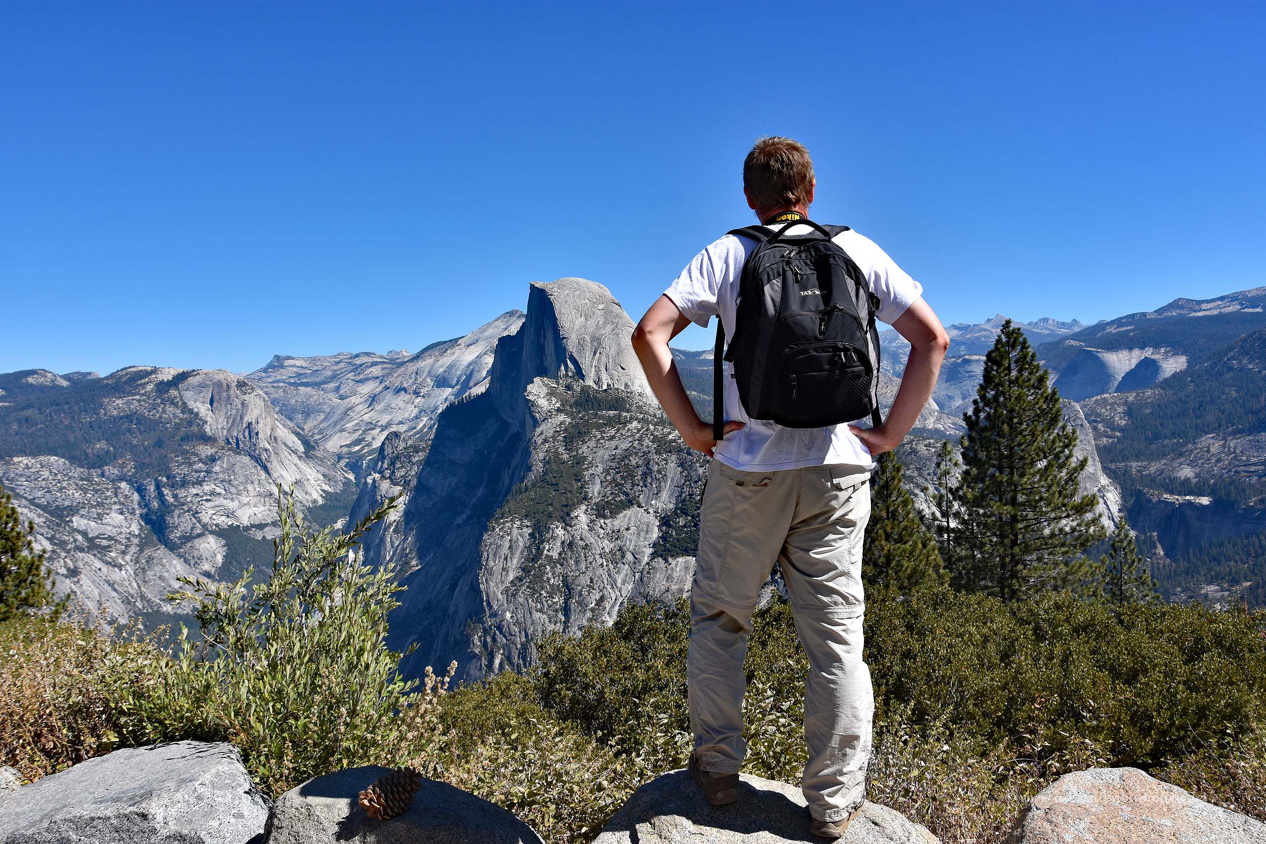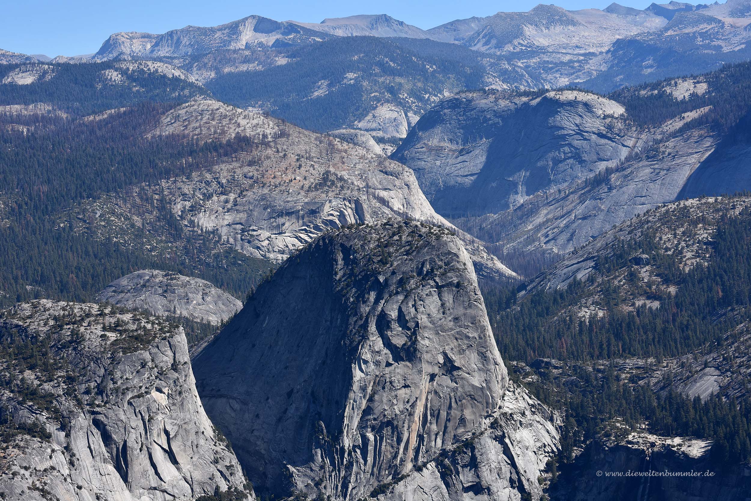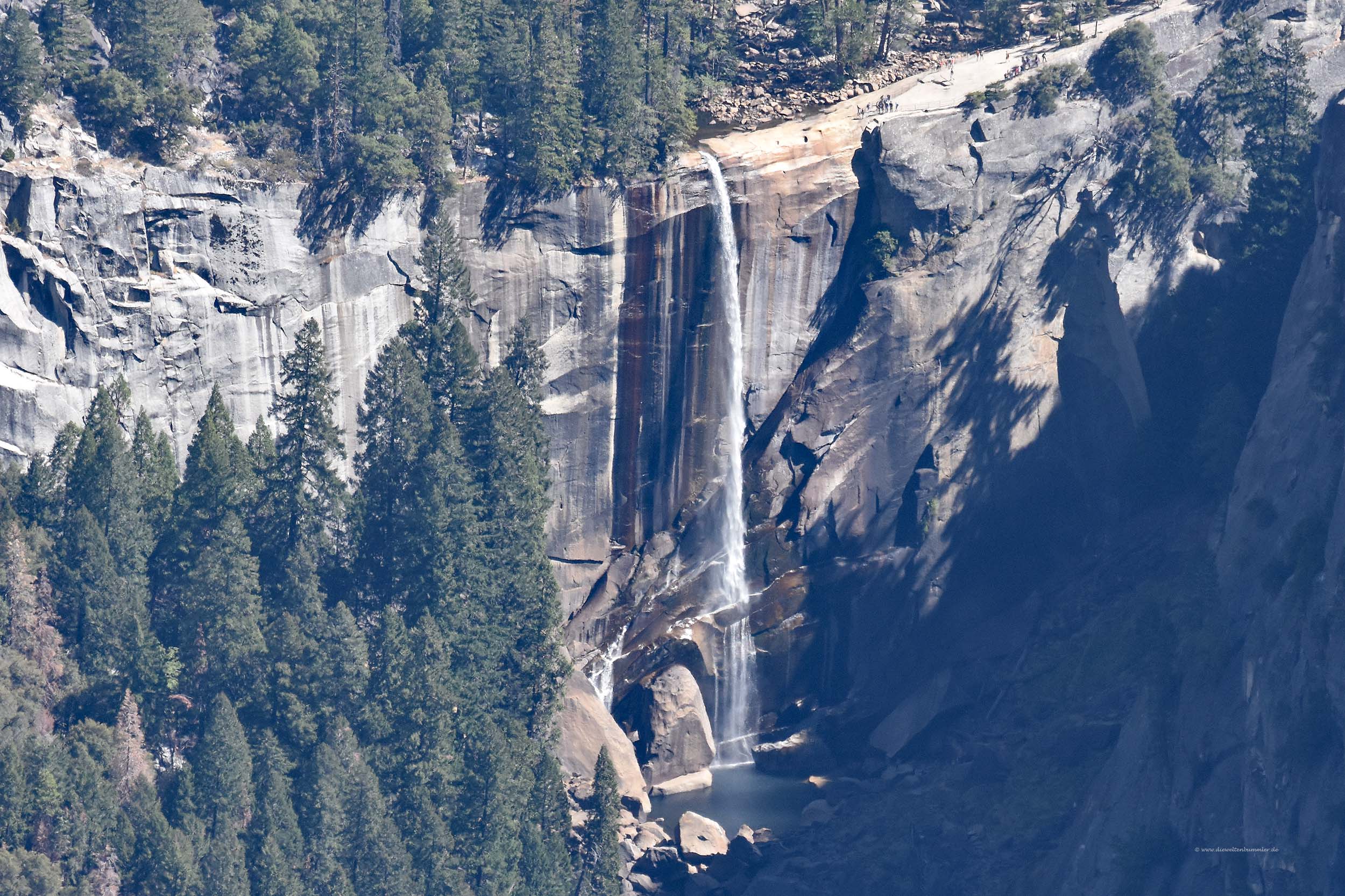 Wobei der Vernal Fall auf dieser Aufnahme sehr wenig Wasser trägt, je nach Jahreszeit ist er dann breiter. Aber zumindest die Fallhöhe bleibt, knappe 100 Meter sind es, womit er nicht der höchste Wasserfall im Nationalpark ist. Der Sentinel Dome ist übrigens ein Hügel, den man vom Glacier Point auch sehr gut erreichen kann. Er ist 2.475 Meter hoch und bietet weitere schöne Ausblicke auch in die andere Richtung.