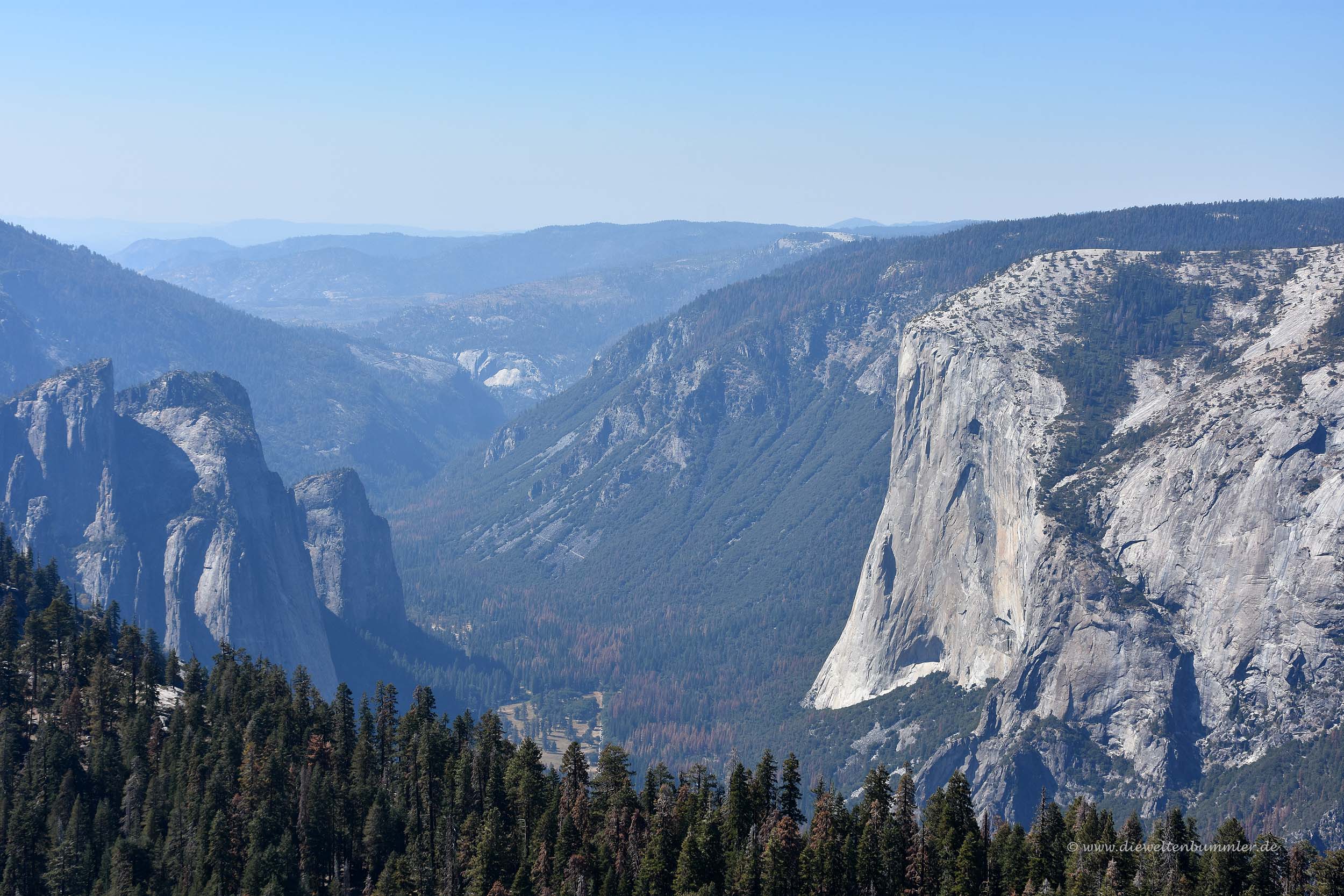 Wir erreichten von Süden kommend ab Fresno und fuhren dann die erste Straße nach rechts. Nach einer viele Meilen langen Fahrt durch Wälder und über Hochebenen erreichten wir schließlich den Besucherparkplatz am Glacier Point. Von dort hatten wir einen ersten grandiosen Blick auf das Yosemite Valley: