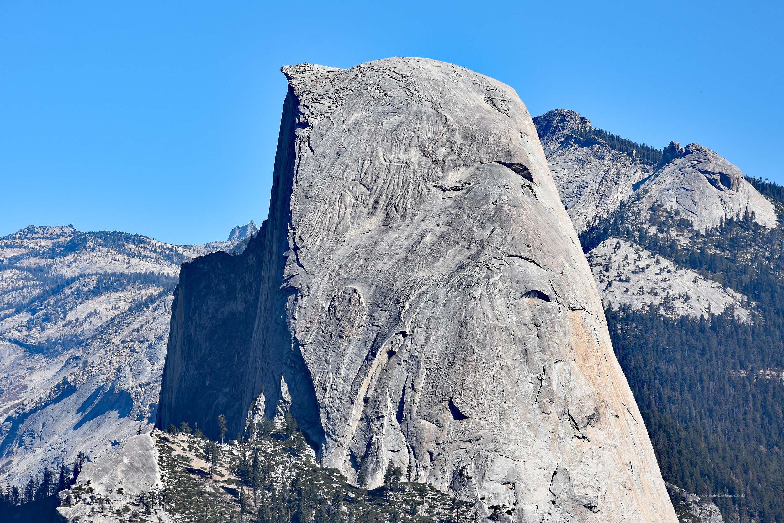 Den eigentlichen Wanderweg auf den Half Dome kann man von hier aus nicht sehen, da er sich auf der anderen Seite befindet, dort aber mindestens genauso steil an einem Seil-Wanderweg hinaufführt.