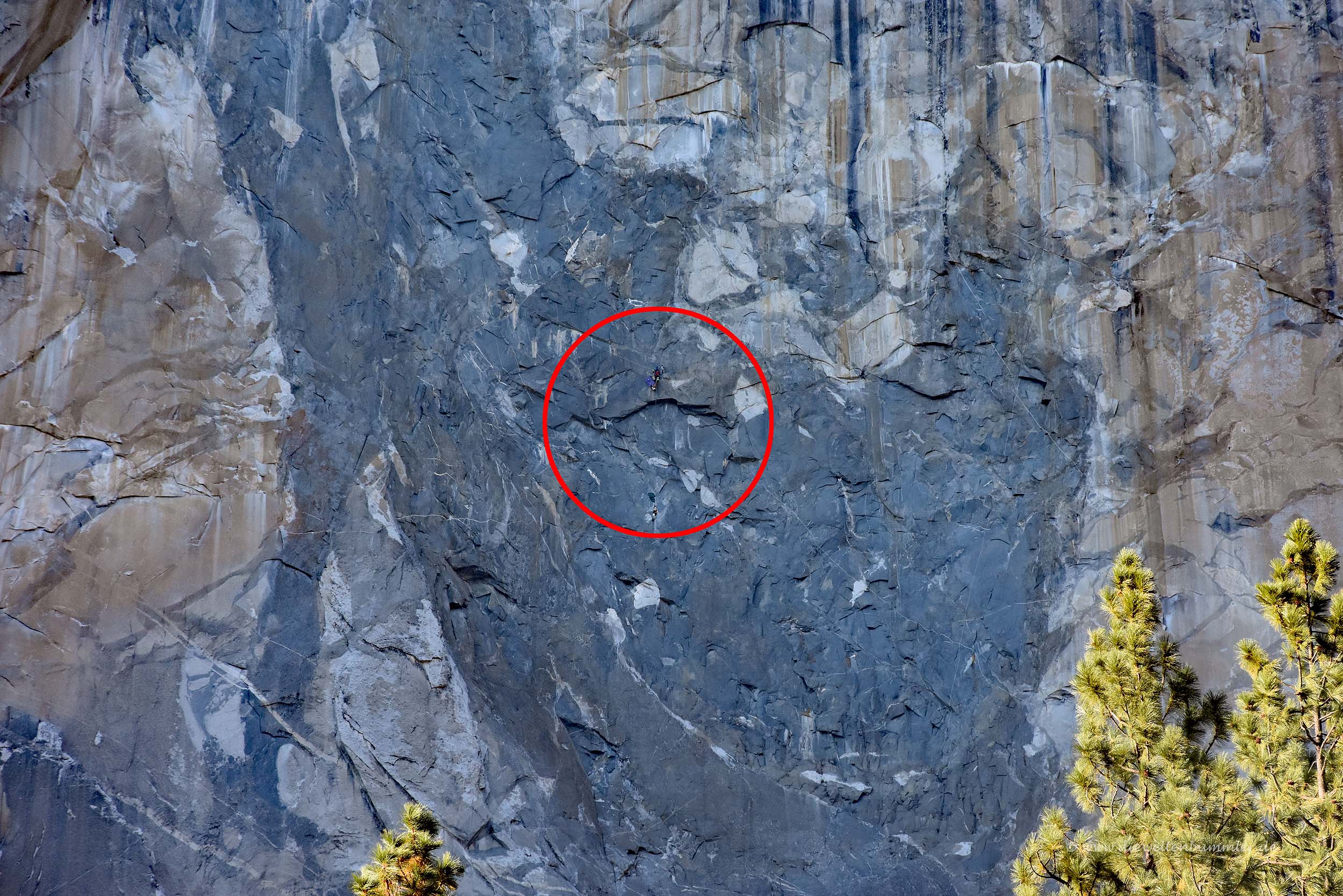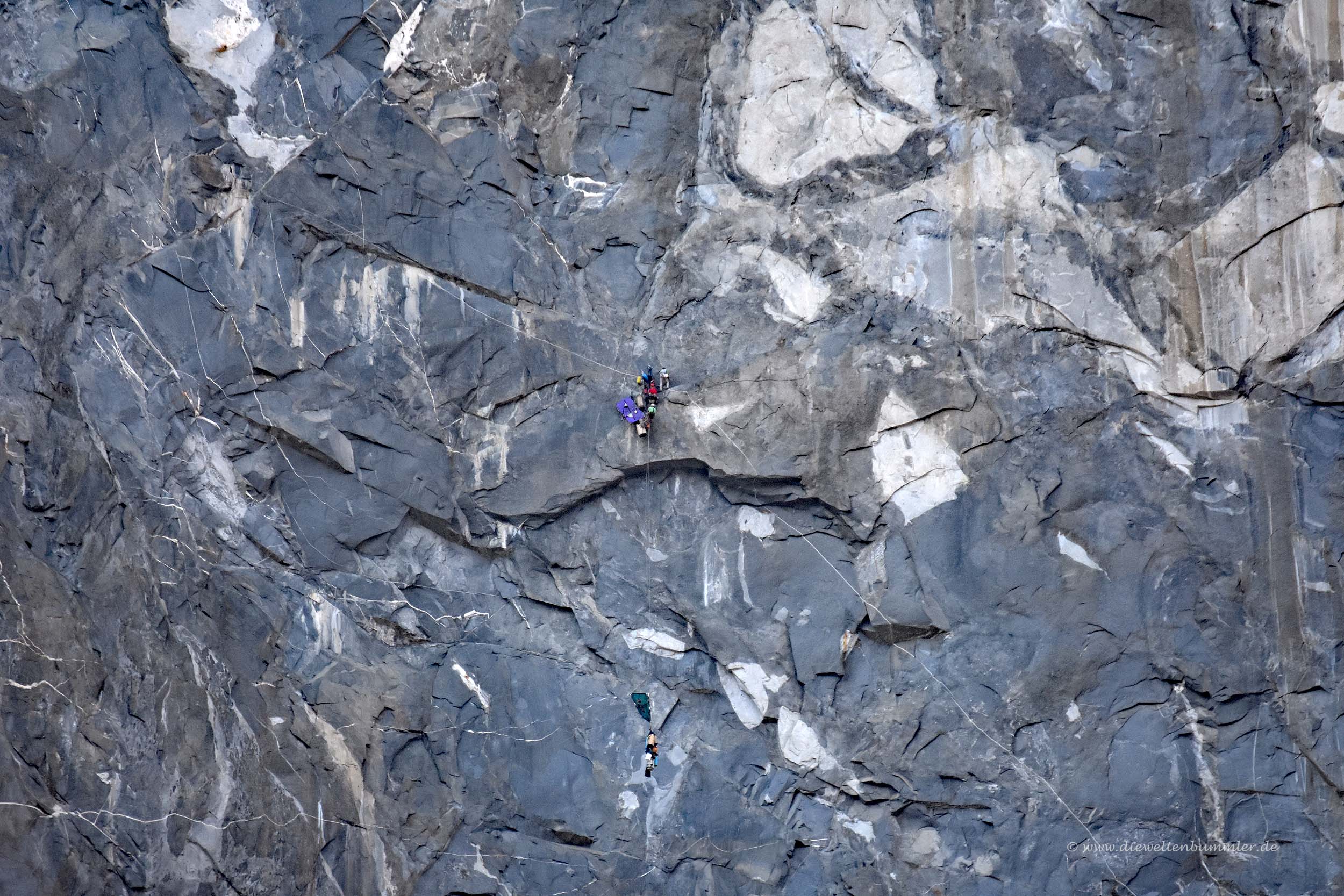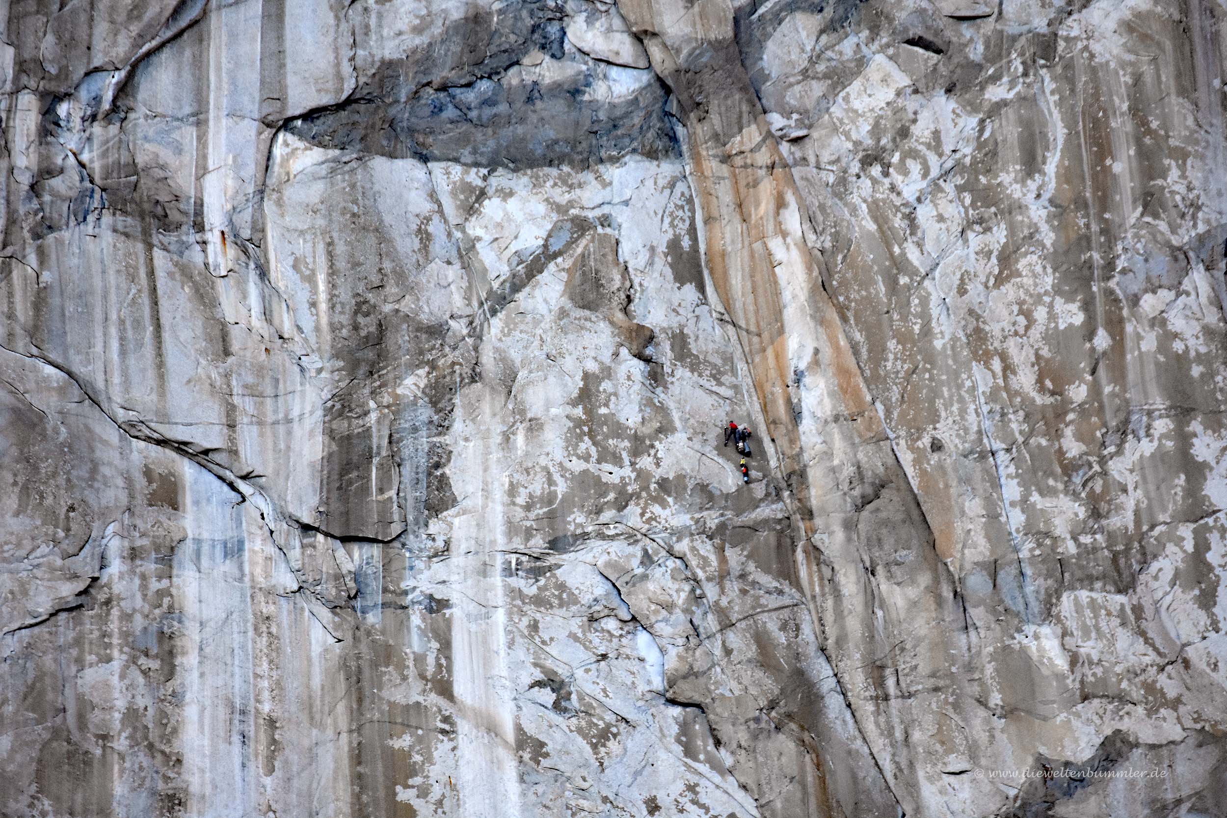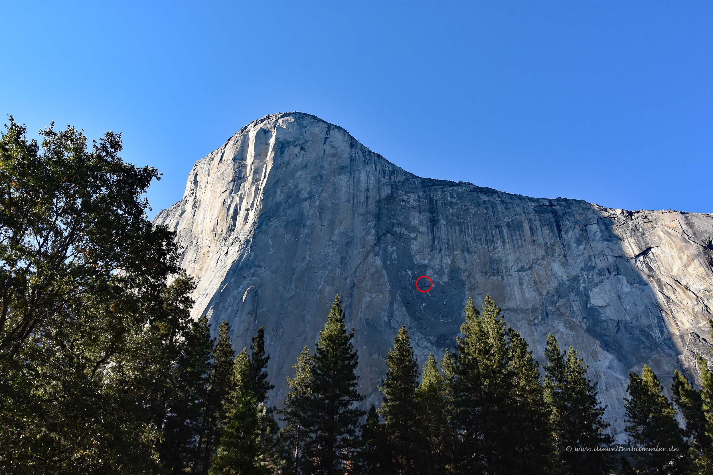 Richtig beeindruckend ist aber auch der El Capitan, an dem man automatisch vorbeikommt, wenn man in das Yosemite-Valley hineinfährt. Der 2.300 Meter hohe Berg ist vor allen Dingen bei Kletterern beliebt und uns wurde schon vom Zuschauen ein wenig schwindelig. Im oberen Bild erkennt man gerade so eben im roten Kreis, dass dort Kletterer mit ihrer gesamten Ausrüstung hängen. Mit den folgenden beiden Bilder habe ich die Kletterer mal etwas näher herangeholt. Danach folgen auch noch Kletterer an einer anderen Stelle im El Capitan.