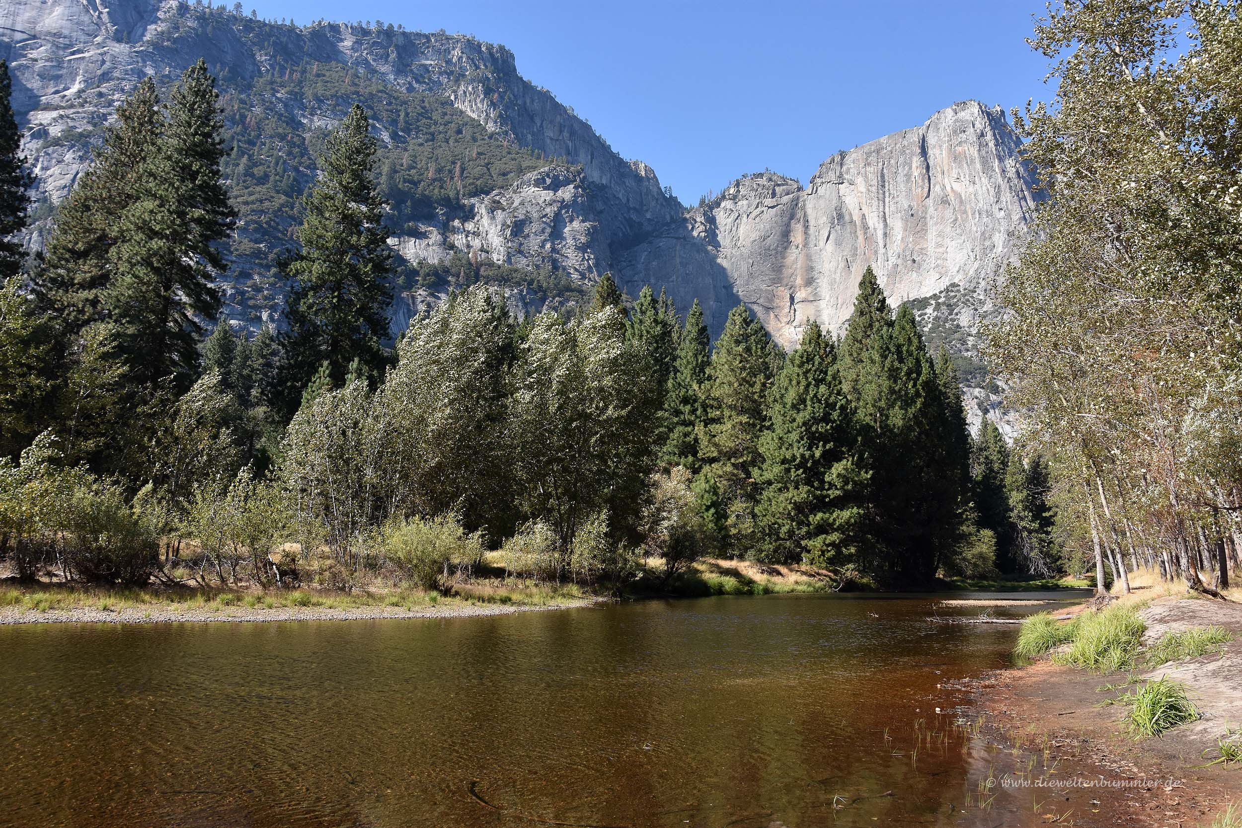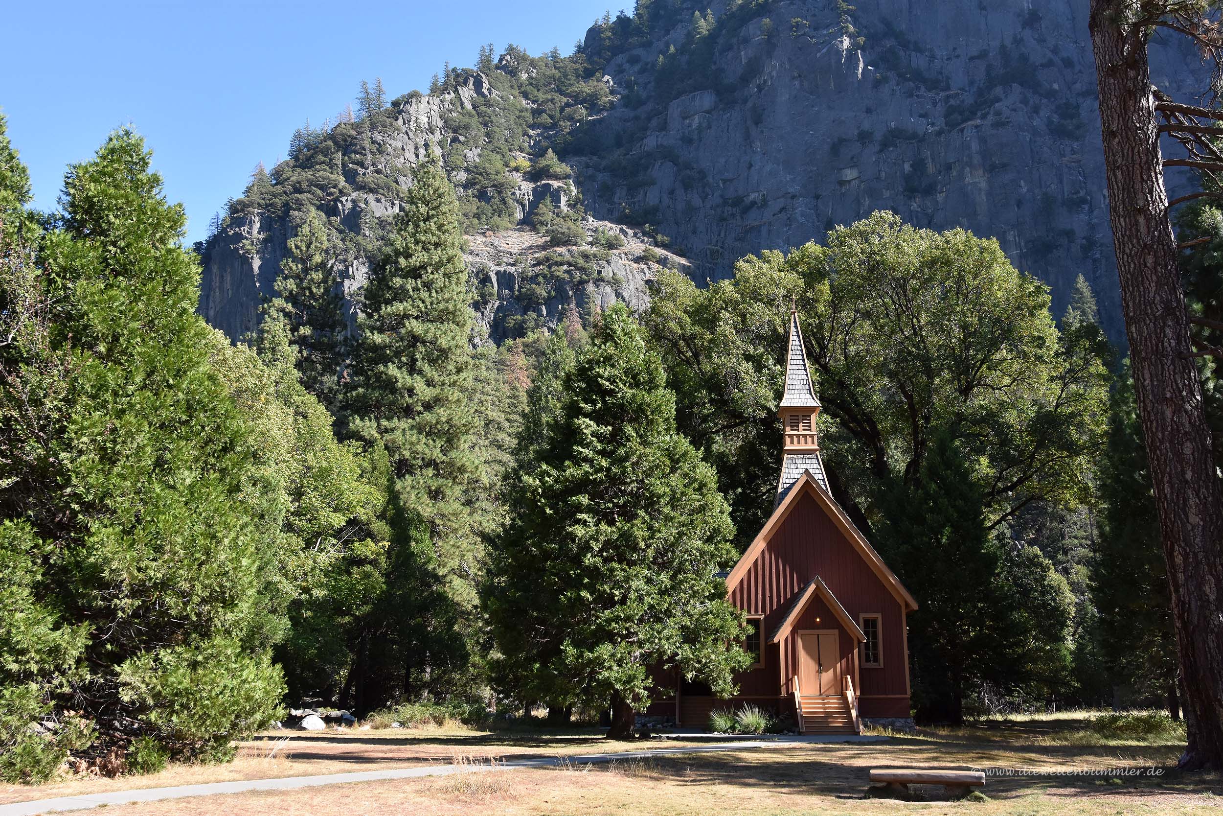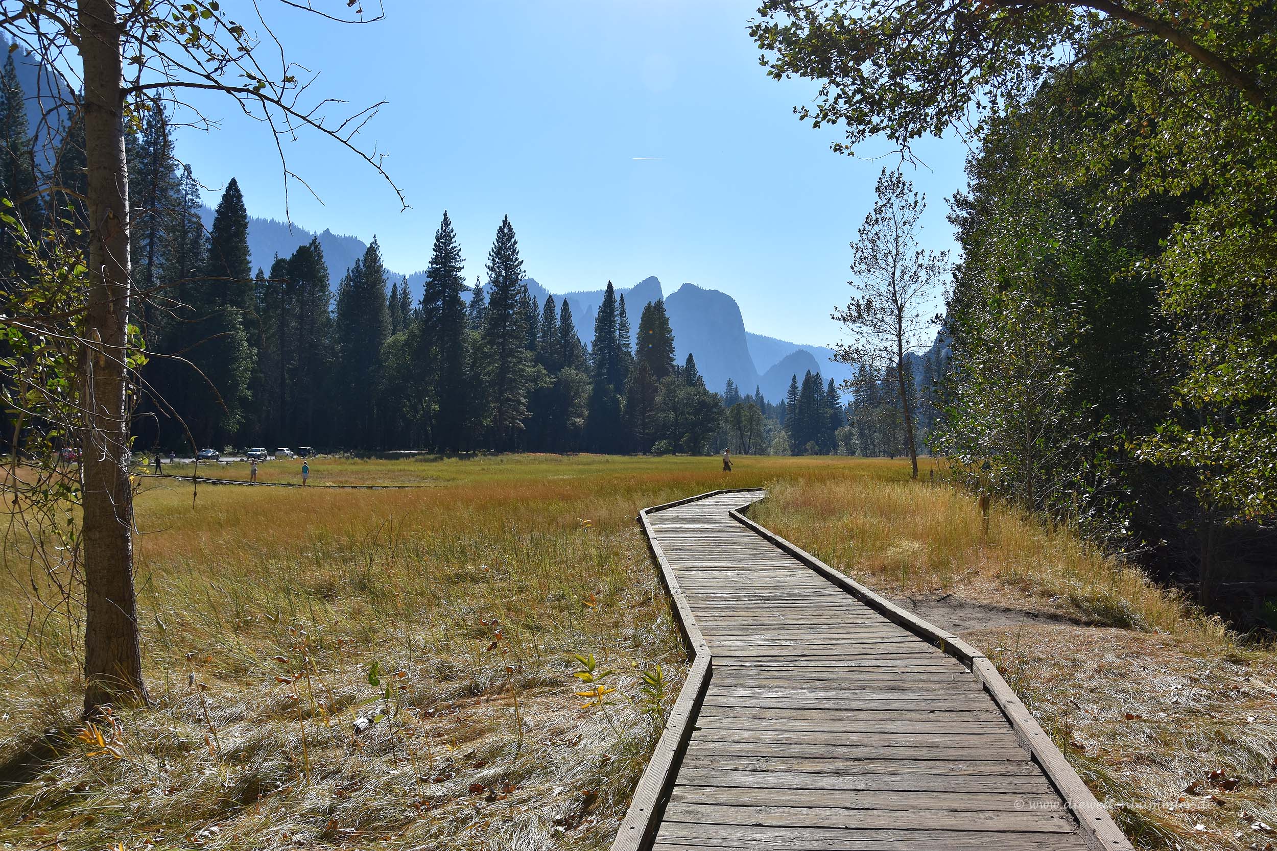 Außerdem gibt es im Tal so ziemlich alles, was es an touristischer Infrastruktur braucht. Und dabei wurde zum Glück nicht übertrieben, auch wenn das Bild mit dem grünen Lkw vielleicht etwas anderes aussagt. Aber es gibt eben die notwendigen Großparkplätze, ein Besucherzentrum, Übernachtungsmöglichkeiten, eine Kapelle und am Ufer des Merced auch einen sehr kurzen Wanderweg auf Holzbohlen. Glücklicherweise gibt es hier keine Hängeseilbrücken oder spektakuläre Aussichtsterrassen, die über dem Tal hängen oder dergleichen.