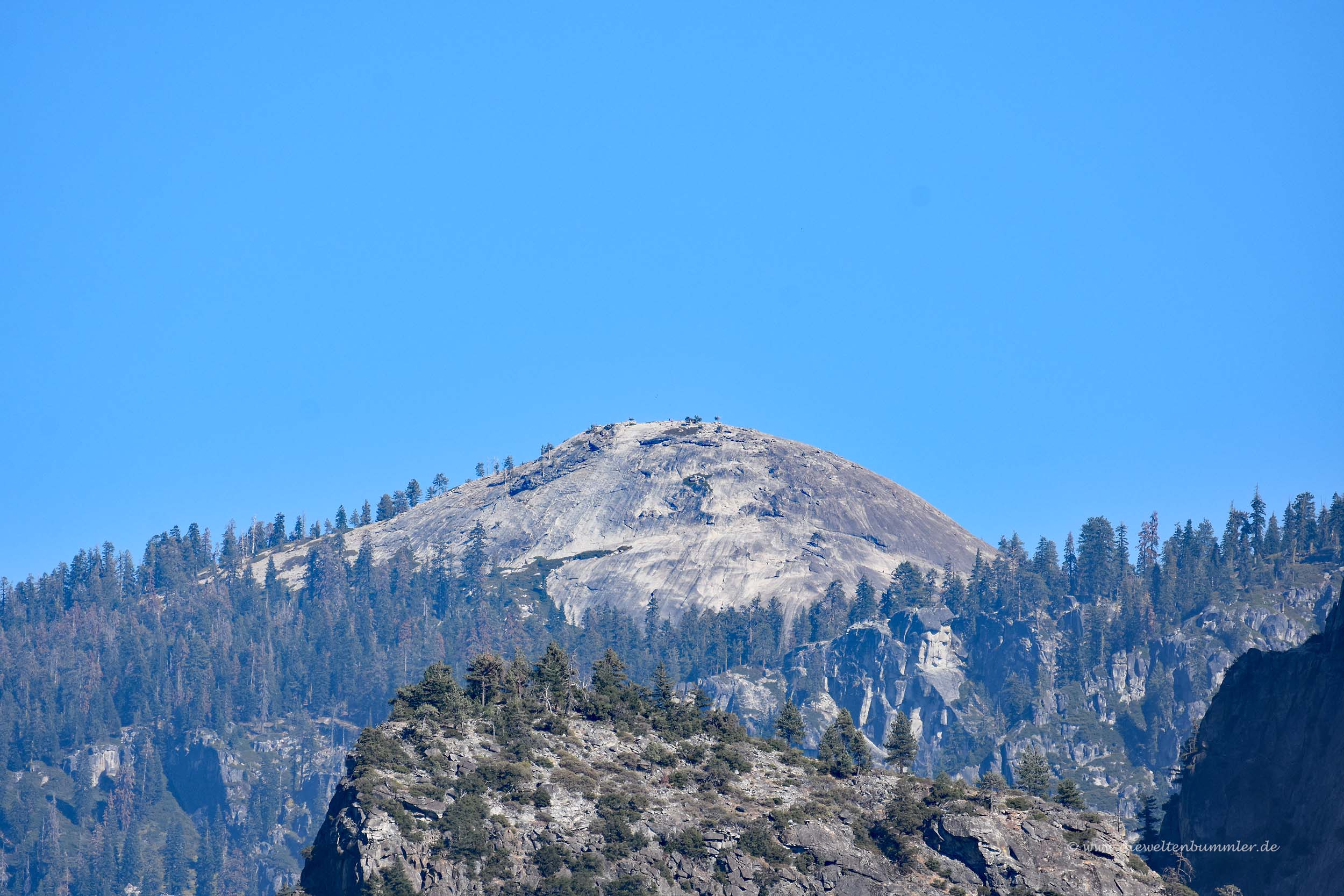 Gut zu erkennen sind auf dieser Aufnahme die Wanderer, die oben auf dem Half Dome stehen.