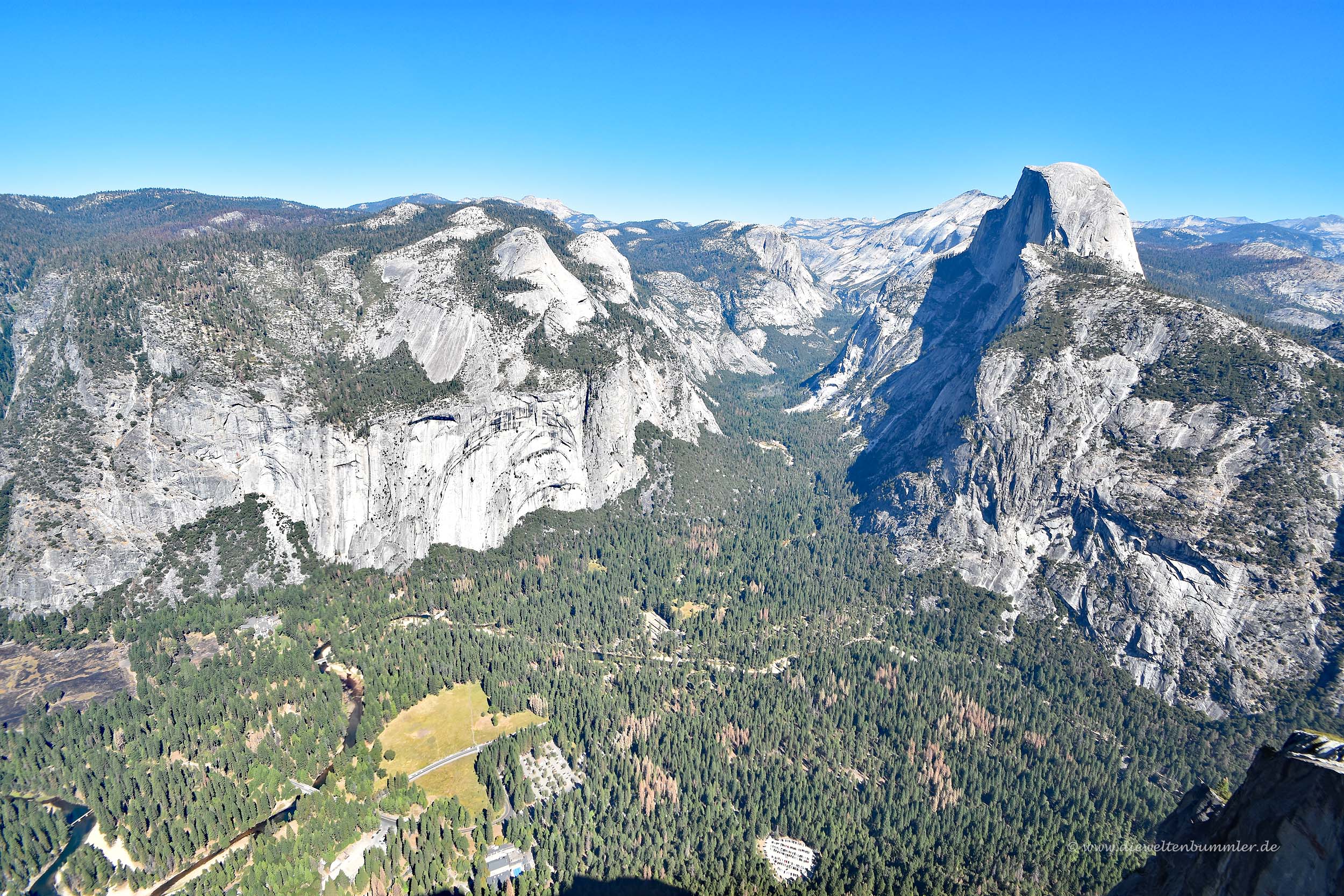 Auf dem oberen Bild erkennt man das Yosemite-Valley sehr gut und auch den Merced River, der das Tal durchquert. Die markante Felsformation rechts im Bild ist der Half Dome, ein beliebter Wander- und Kletterberg. Gut zu erkenen sind unten im Tal auch die Großparkplätze und in der grünen Lichtung auch die Straße, die durch das Tal führt.