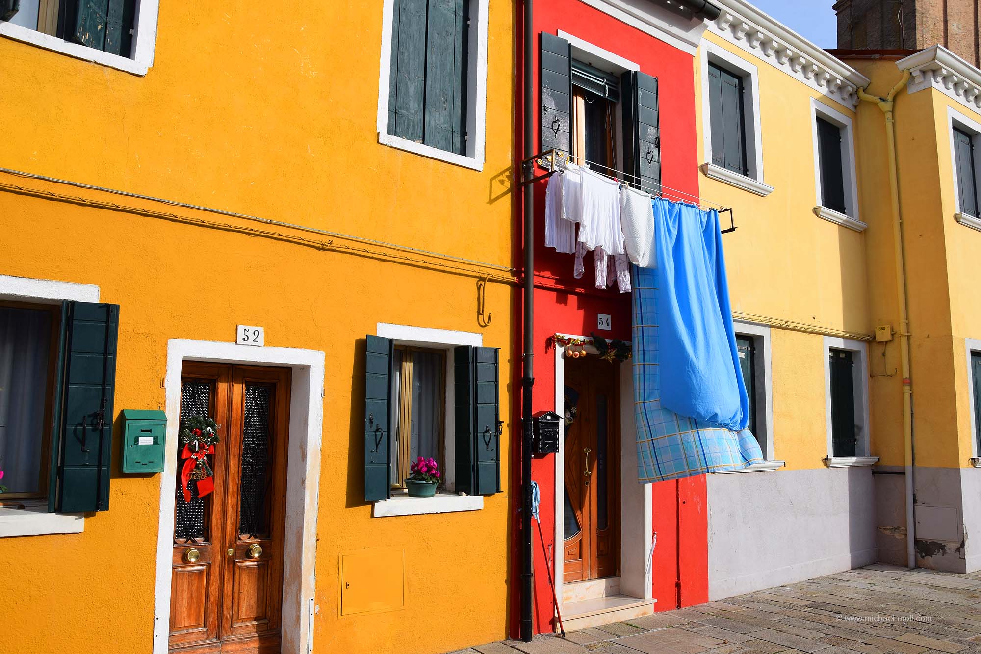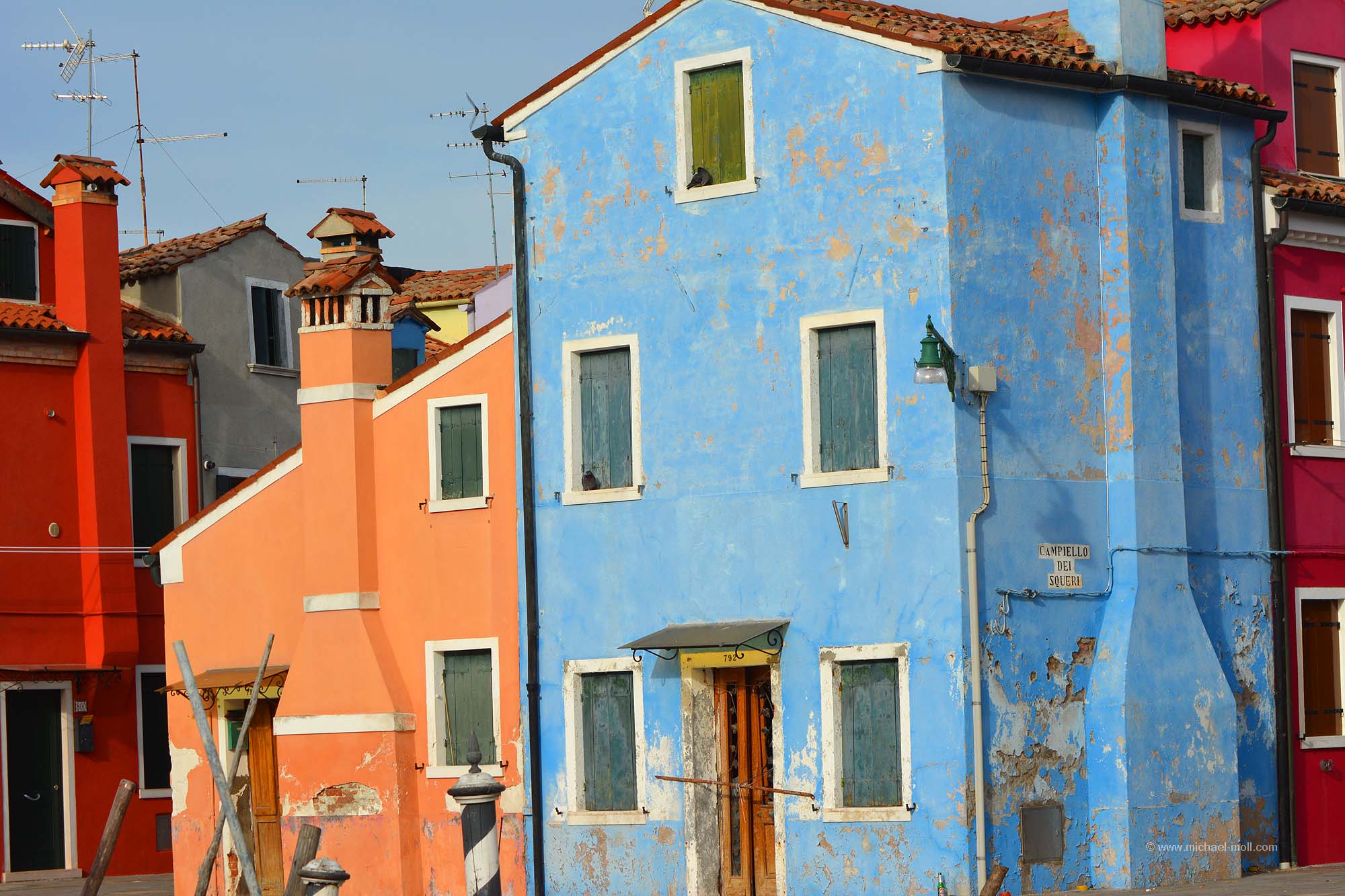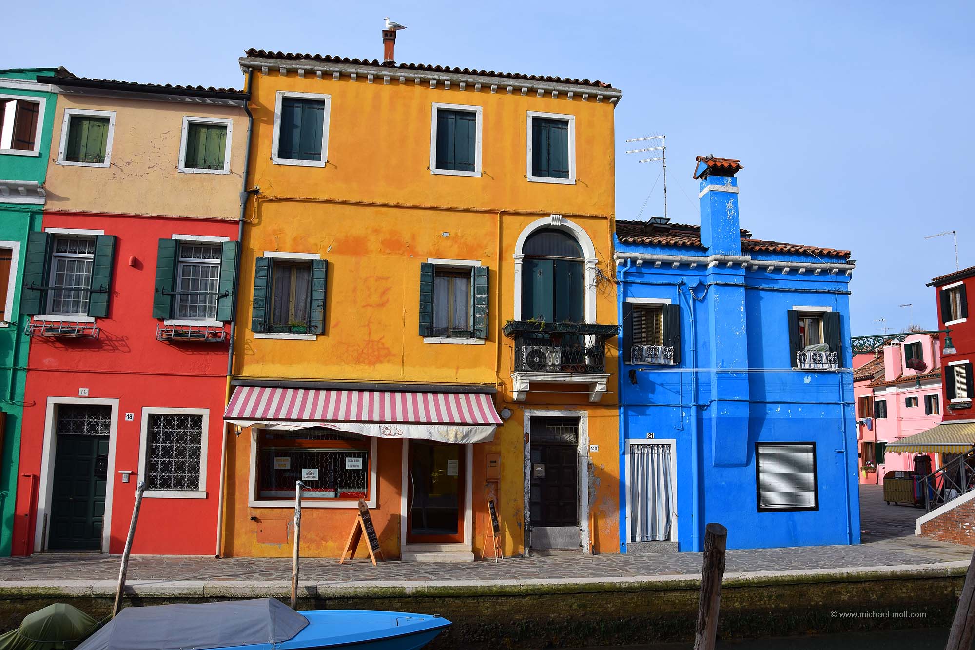 Es macht wirklich Spaß, an den farbenfrohen Häusern entlang zu schlendern und das nicht nur am Kanal, sondern auch in den Gassen, die die Kanäle miteinander verbinden und zu der einen oder anderen Piazza führen. Kaum ein Haus gleicht dem anderen und jeder Hausbesitzer scheint mit der Farbe seiner Fassade etwas ausdrücken zu wollen. Alleine dadurch ist Burano schon ein beliebtes Motiv bei Malern und Fotgrafen.