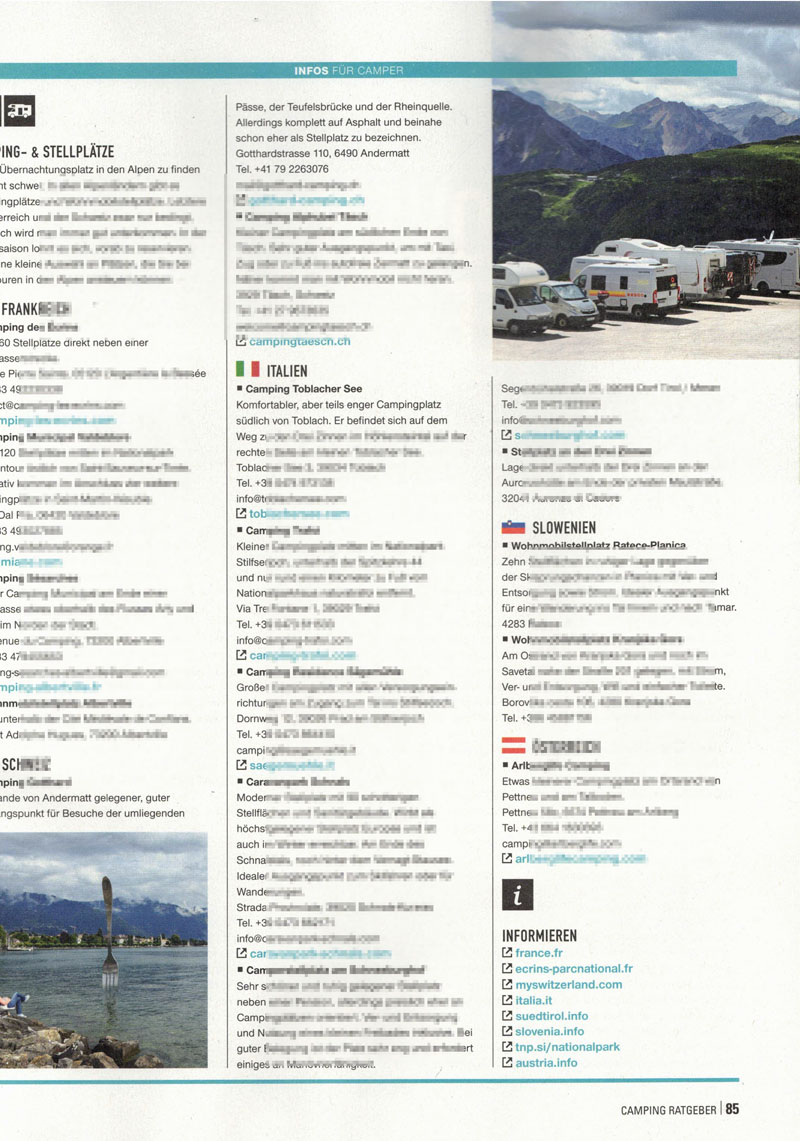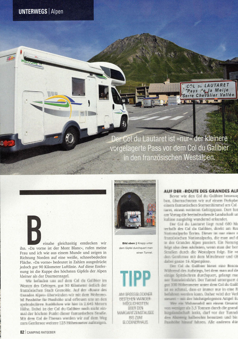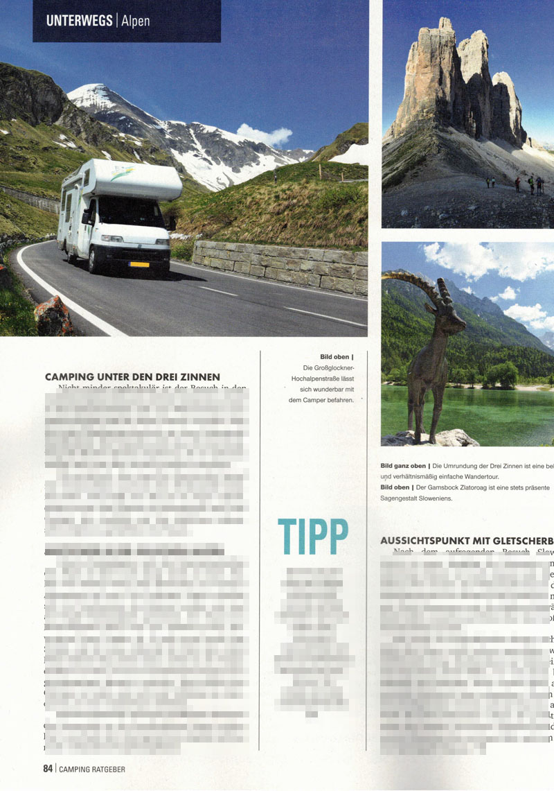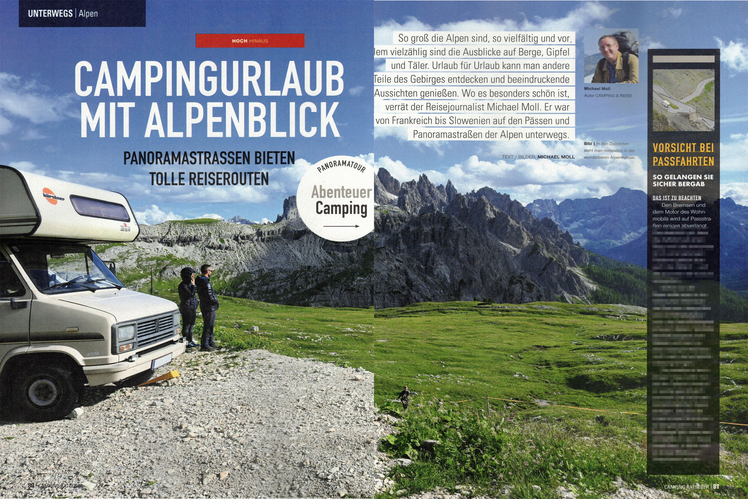In unregelmäßigen Abständen verfasse ich Zeitschriftenartikel für das Magazin Camping & Reise. Von diesem Magazin gibt es auch die Sonderheft-Reihe Ratgeber. Beim Sonderheft „Ratgeber Camping“ durfte ich mich abermals beteiligen und schrieb den Artikel über Panoramastraßen in den Alpen.