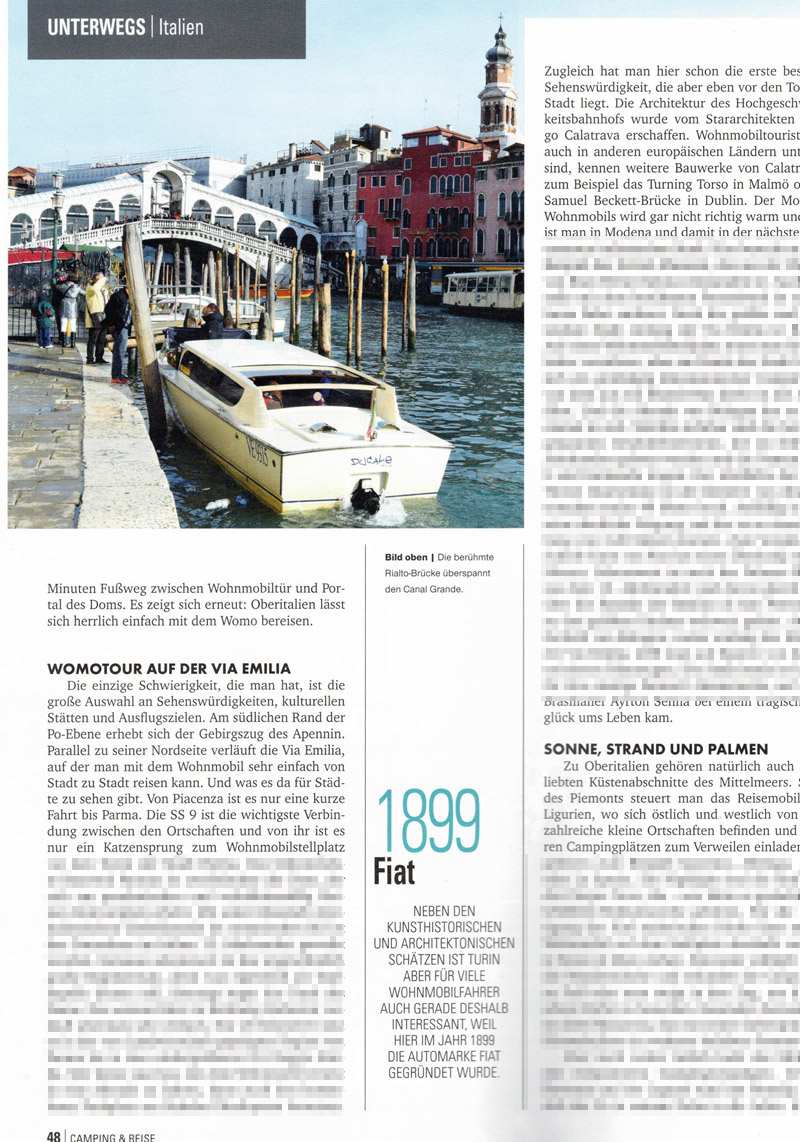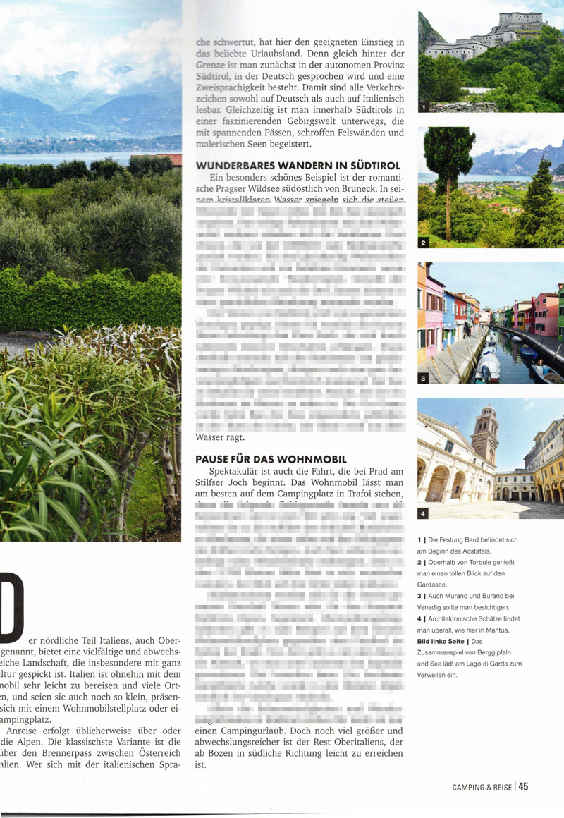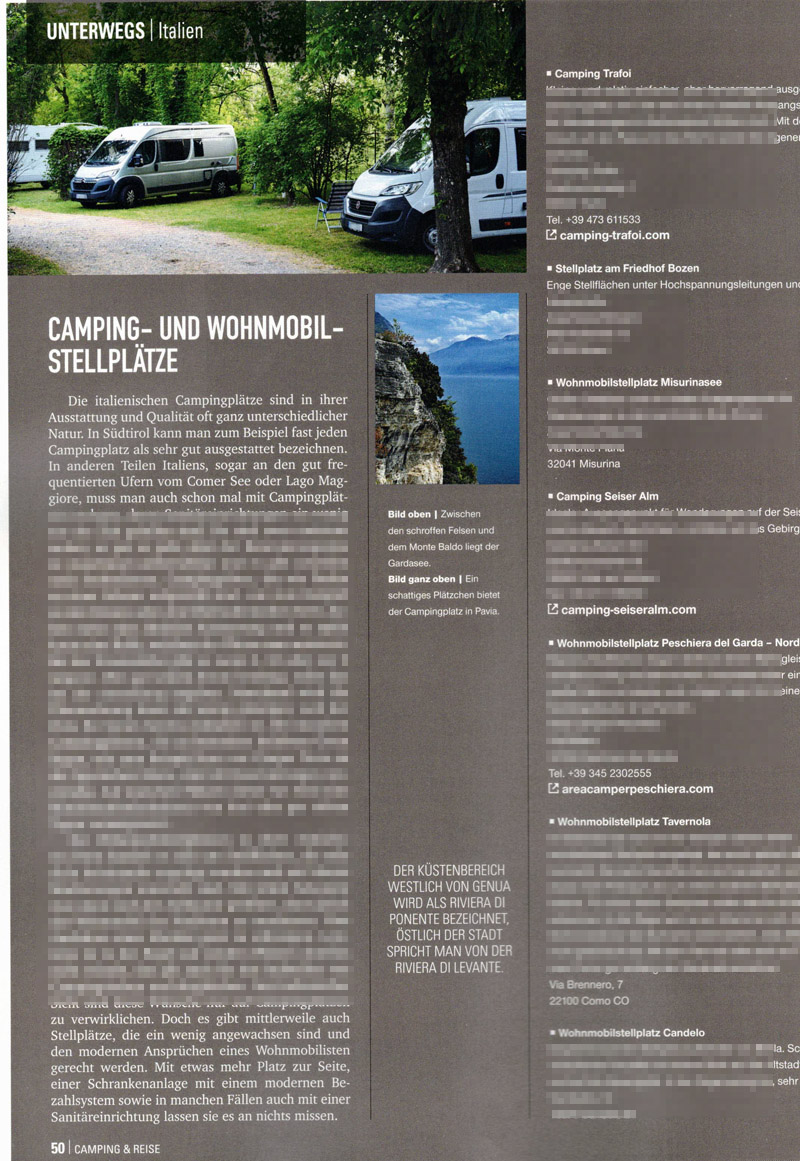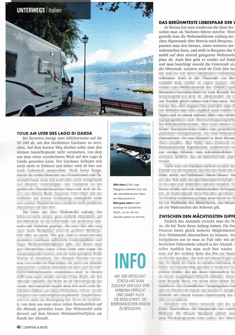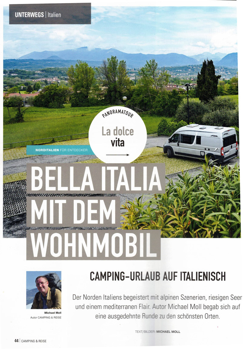 Es war mal wieder Zeit für einen Zeitungsartikel aus eigener Feder. Und zwar schrieb ich, wie schon in der Vergangenheit, einen Artikel für die Fachzeitschrift Camping & Reise. In der Ausgabe Nummer 3 des Jahres 2021 berichte ich von den malerischen Schönheiten Norditaliens und entführe die Leser auf eine Wohnmobilreise zwischen den Alpen und dem Mittelmeer.