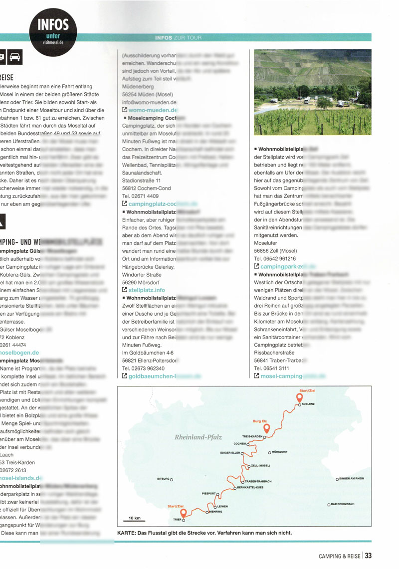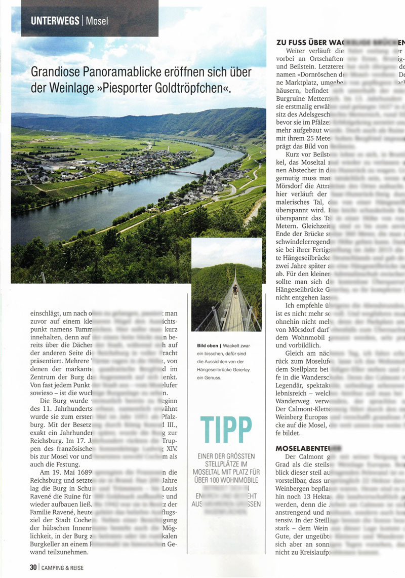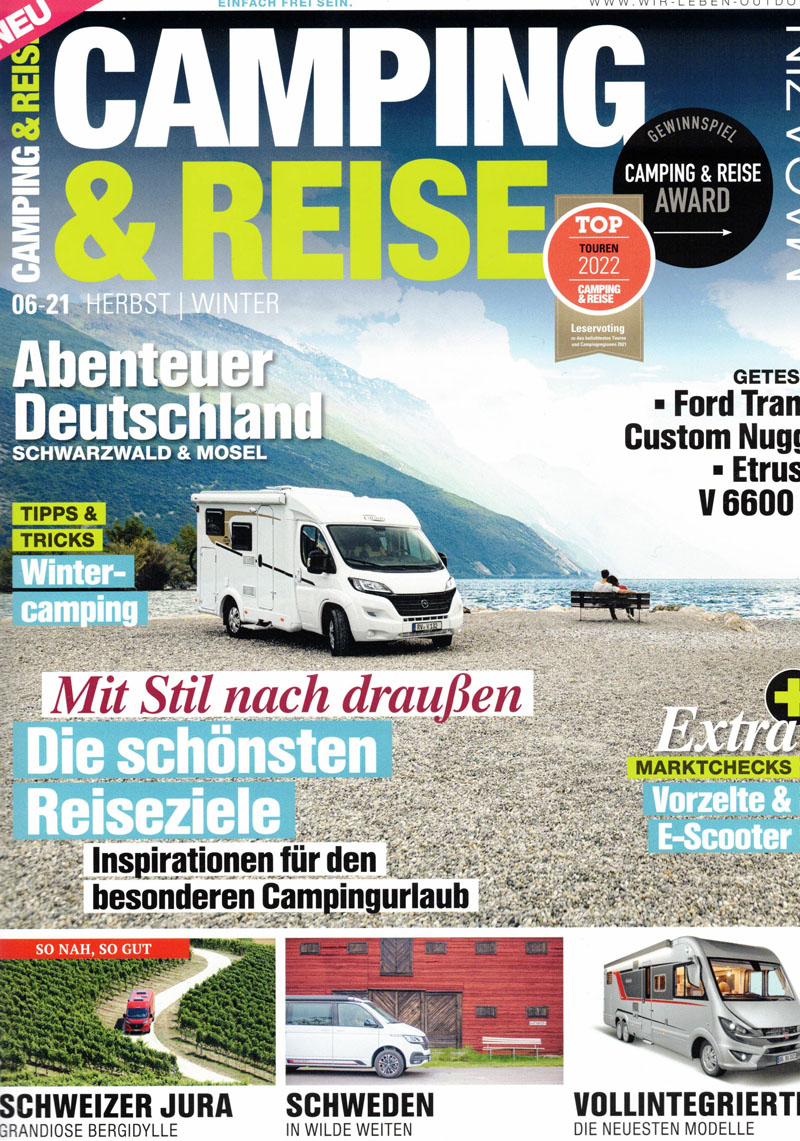 In der letzten Ausgabe des Jahres 2021 habe ich auch wieder meinen Beitrag geleistet und einen Artikel für das Fachmagazin Camping & Reise verfasst. Mit dem Wohnmobil nehme ich die Leser dieses Mal mit auf eine Tour durch das Moseltal. Wem das noch nicht ausreicht, der kann natürlich auch meinen Wohnmobilreiseführer über die Mosel mit auf die Womotour nehmen.