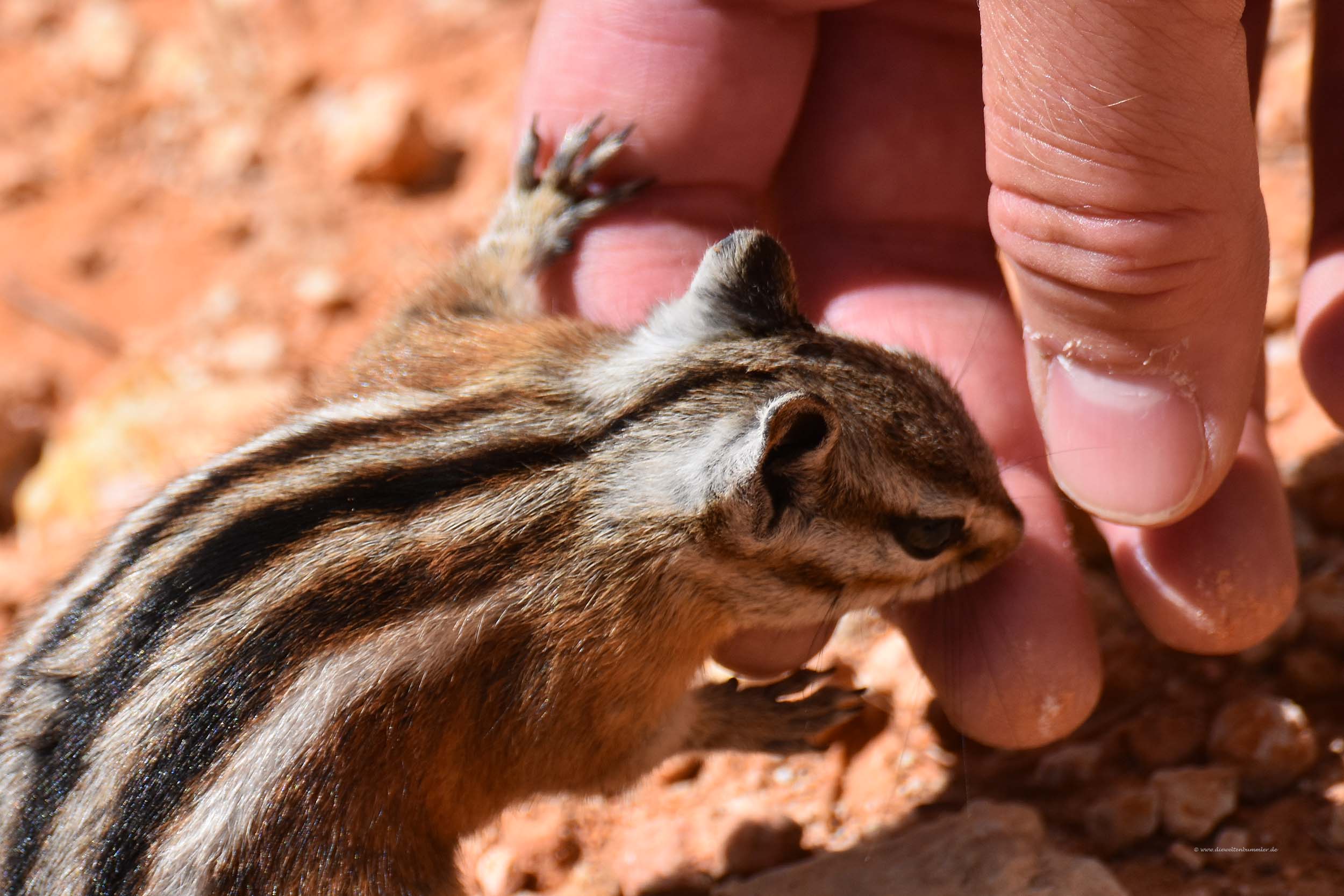 Es sollte nicht unser letztes Streifenhörnchen sein, das wir auf unserer Reise gesehen hatten. Später war uns klar, warum der Amerikaner gelangweilt klang. Denn Chipmunks findet man in der freien Natur Nordamerikas praktisch überall. So sahen wir schon wenig später Chipmunks am Devil’s Tower in Wyoming und im Bryce Canyon-Nationalpark reichte mir ein Streifenhörnchen sogar seine Pfötchen.