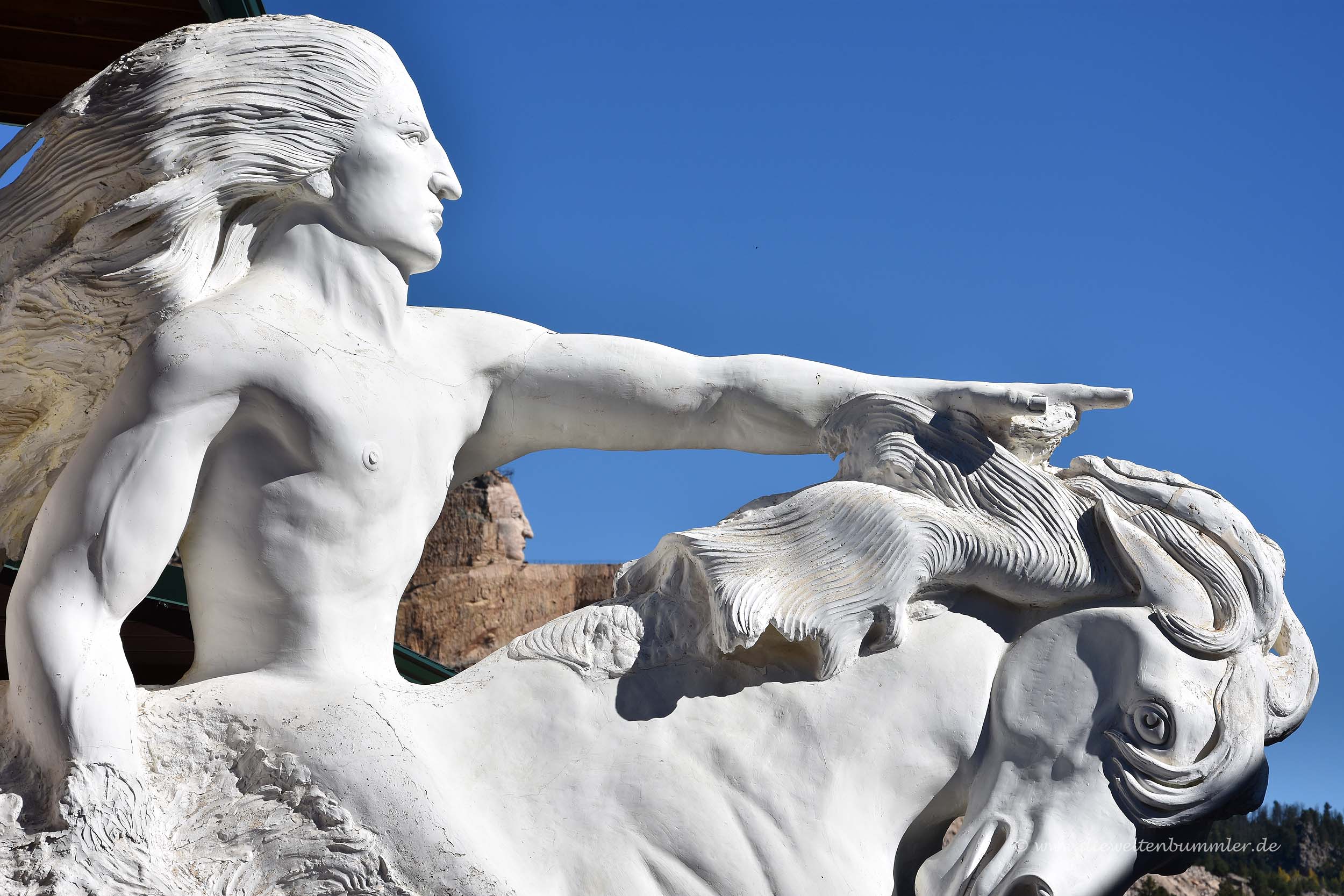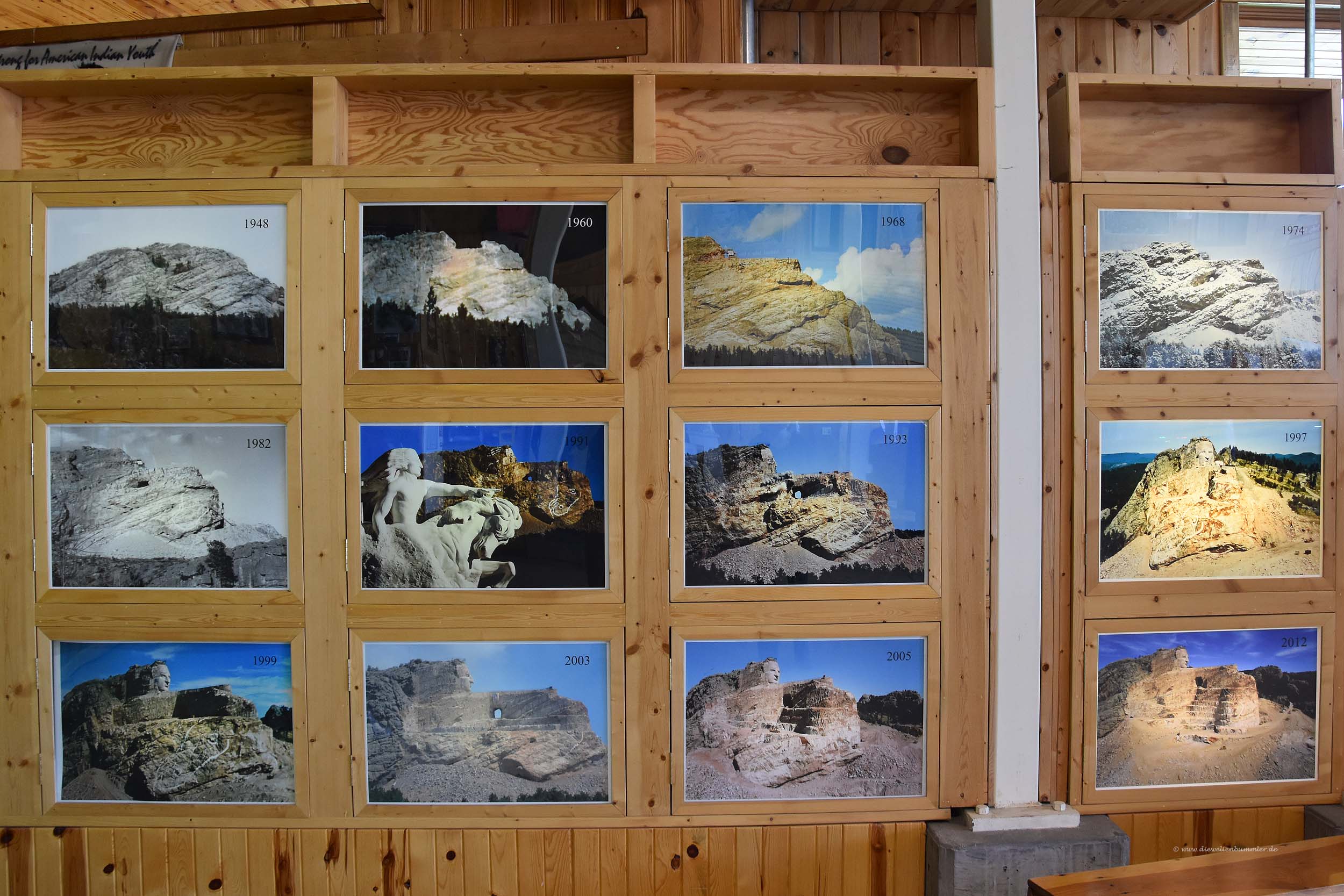 Nach dem Einparken auf dem Großparkplatz spaziert man zu einem Besucherzentrum und sieht schon auf dem Weg in der Ferne den Hügel in den Black Hills, der umgestaltet wird. Das Gesicht des Indianers ist schon deutlich zu erkennen. Auf dem Teil des Berges, der mal ein Arm sein wird, stehen Bagger und andere Baufahrzeuge herum und an der Seitenflanke ist überdeutlich aufgemalt, wo der Kopf des Pferdes zu sehen sein wird.