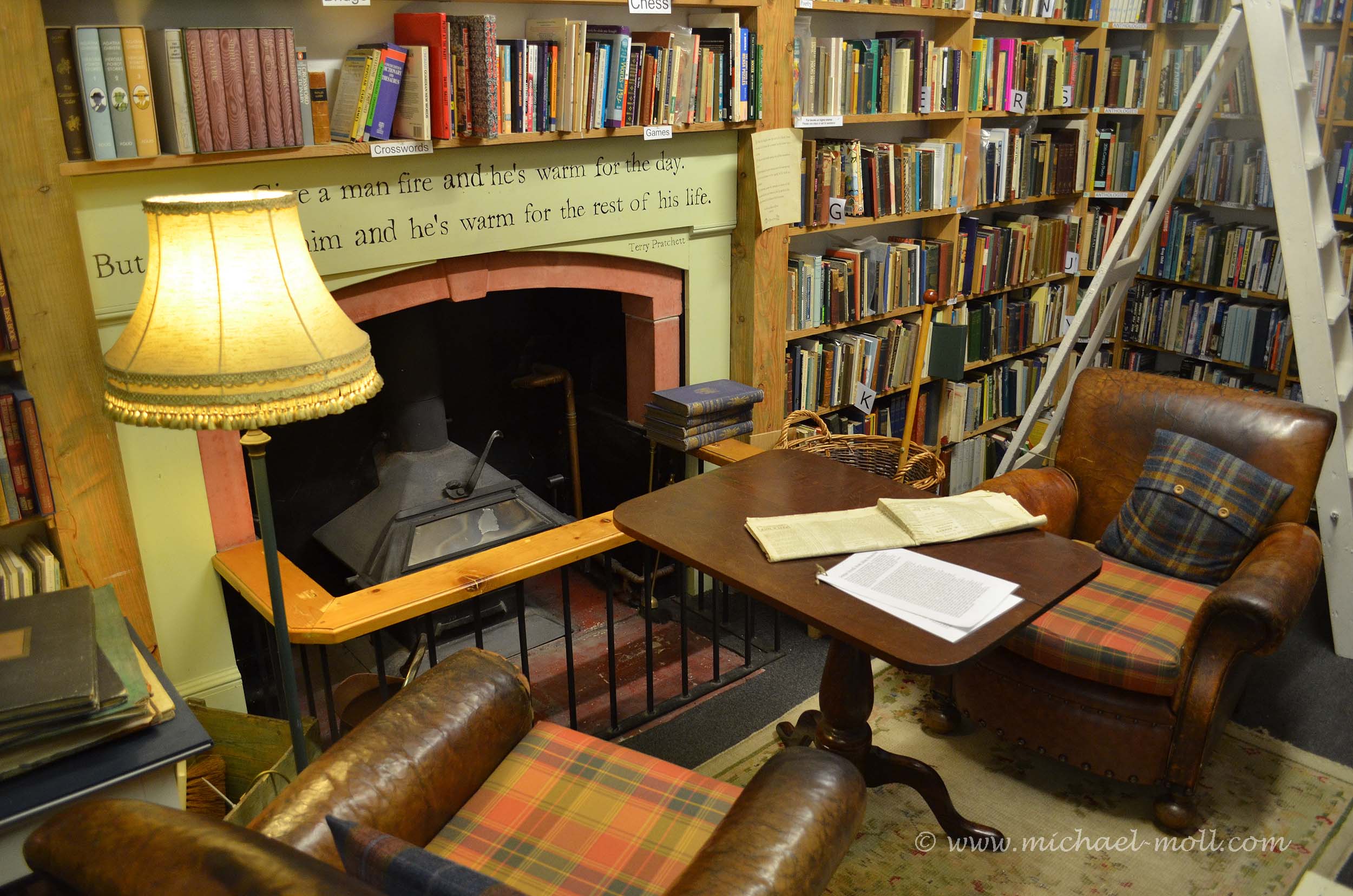 Der Regen hat natürlich den Vorteil gehabt, dass man sich innerhalb der Bookshops ein wenig genauer umschaut. Und so entdeckt man nicht nur Bücher, sondern auch mehrfach Möglichkeiten, sich einfach niederzulassen und vor einem Kamin zu lesen. Mancher Buchladen bietet sogar zwischen den vielen Regalen ein kleines Café an, wo man lange und ganz in Ruhe verweilen kann.