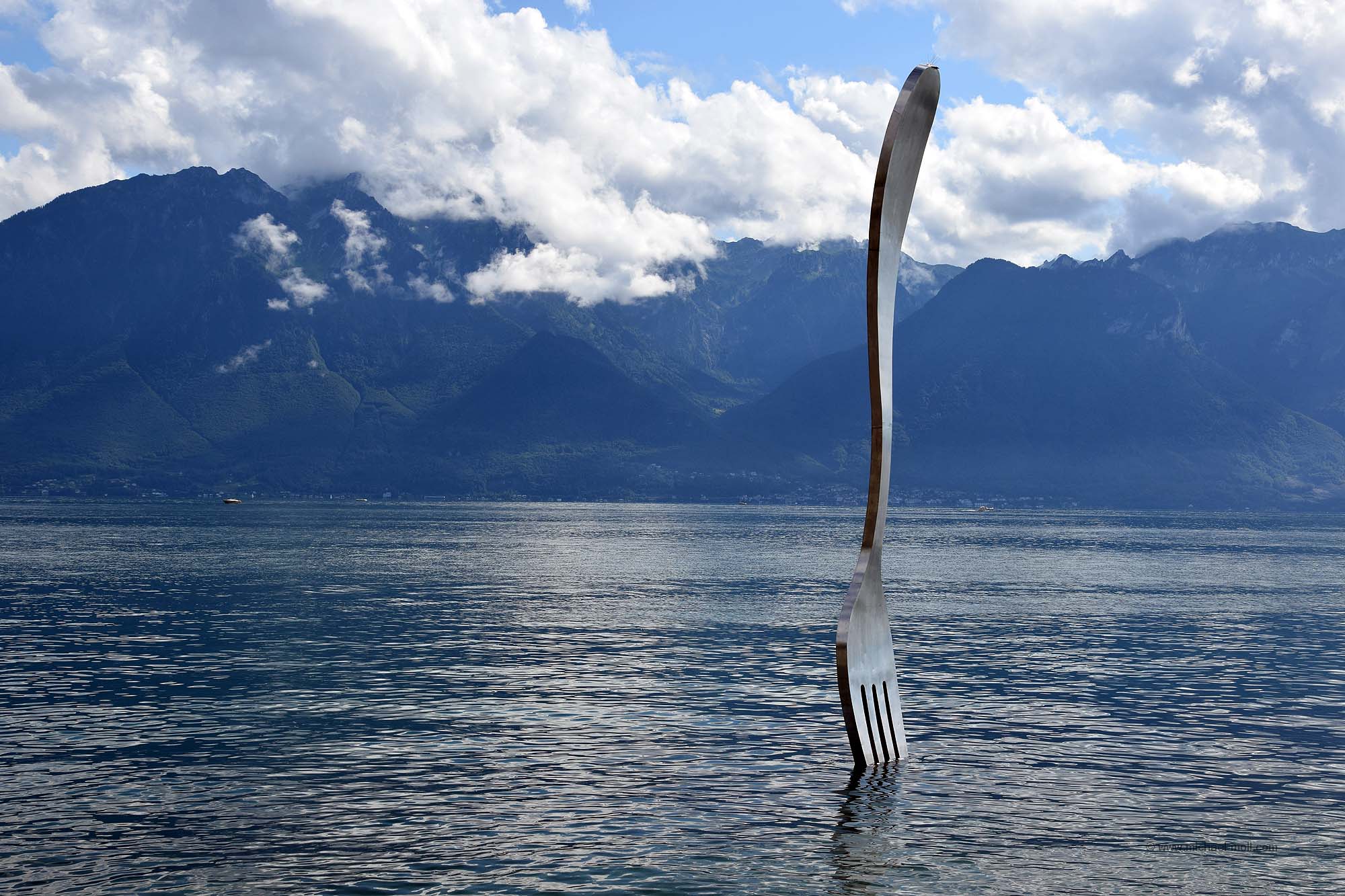 Sowohl die Skulptur von Mercury als auch die von Chaplin schauen beide über das Wasser des Sees. Doch aus der Position von Charlie Chaplins Ebenbild sieht man nicht nur die Wasseroberfläche, sondern auch noch eine dritte Skulptur, die sich nur wenige Meter vom Ufer entfernt befindet und scheinbar von einem Riesen in den See gestochen wurde. Die Rede ist von einer Gabel. Das stählerne Essbesteck ist rund 8 Meter hoch und steckt genauso im Genfersee wie daheim am Esstisch die herkömmliche Gabel im Braten steckt. Sie wurde vom Alimentairum initiiert, einem Lebensmittelmuseum in Vevey, das gleich hinter Charlie Chaplin zu einem kulinarischen Rundgang einlädt.