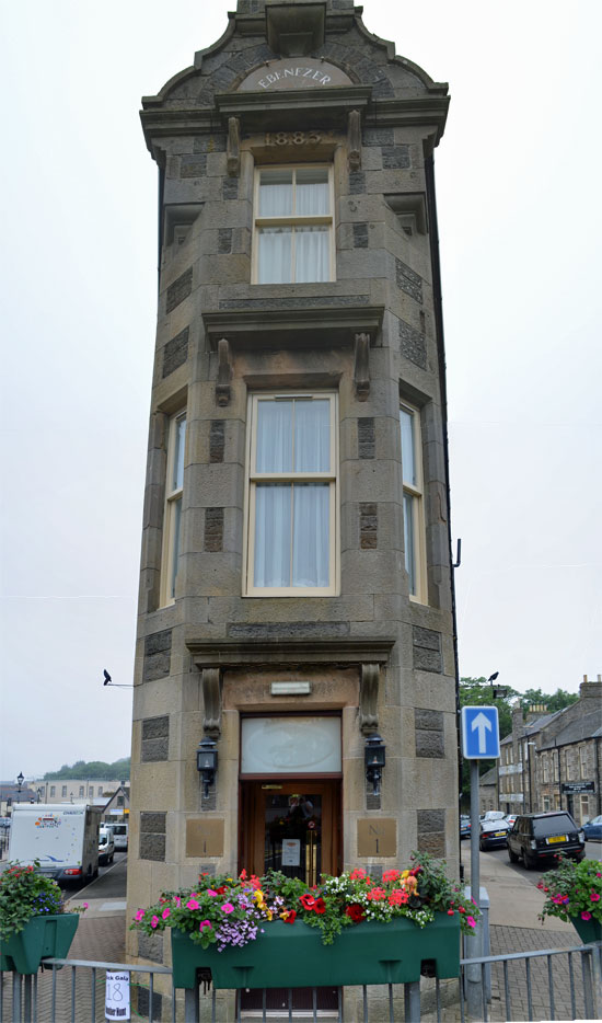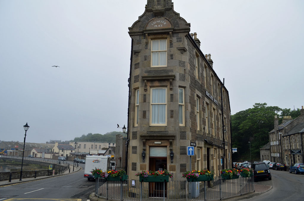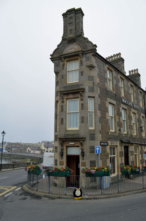 Rechts und links des Hotels befinden sich die River Street sowie die Union Street. Gegenüber vom Ebenezer Place befindet sich ein Kreisverkehr. Natürlich habe ich es mir nicht nehmen lassen, von der kürzesten Straße der Welt ein Foto von Pingu zu machen. Also, wer mal in Rekordzeit eine Straße abgehen möchte oder liegend einen kompletten Straßenzug blockieren will, der sollte nach Wick.