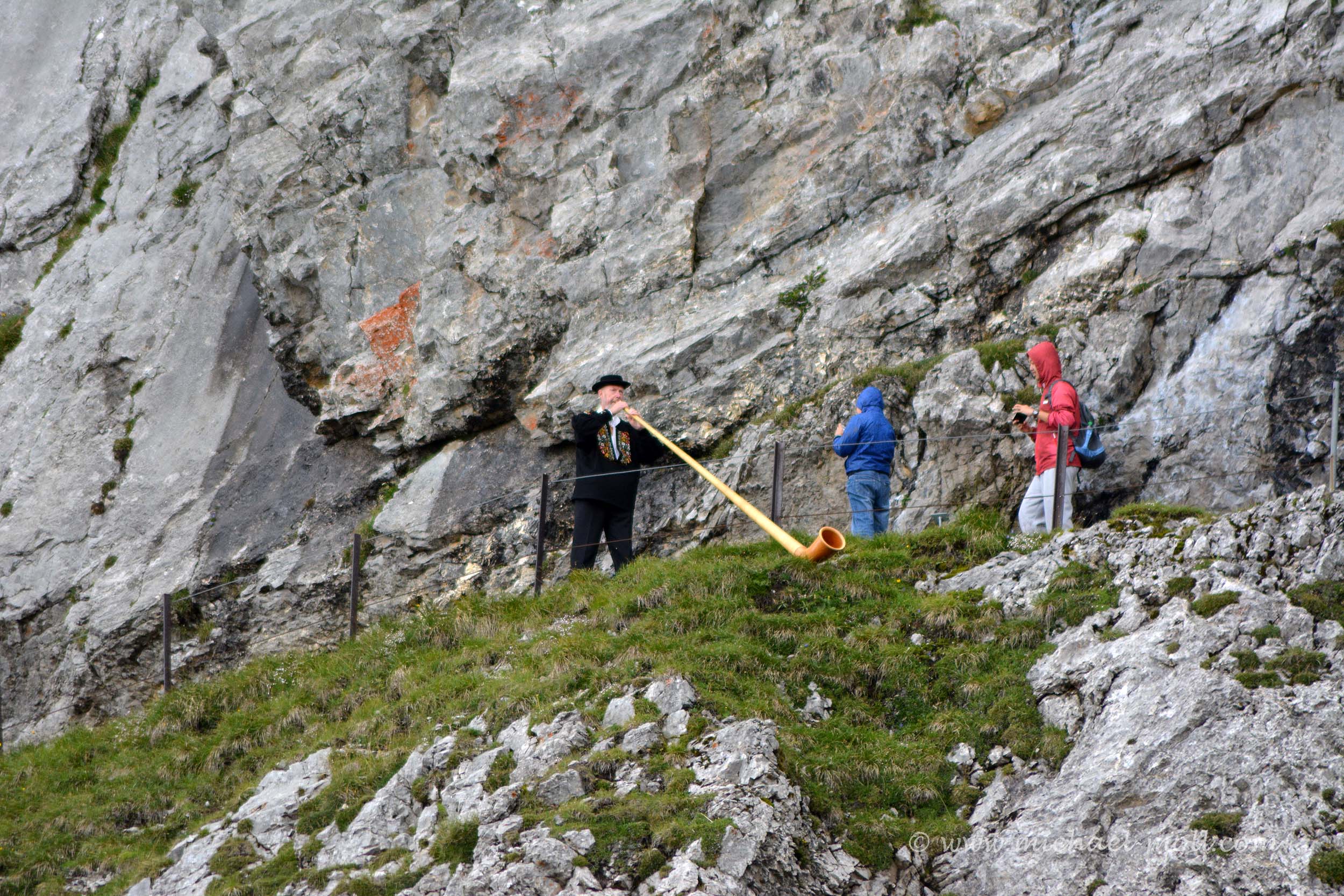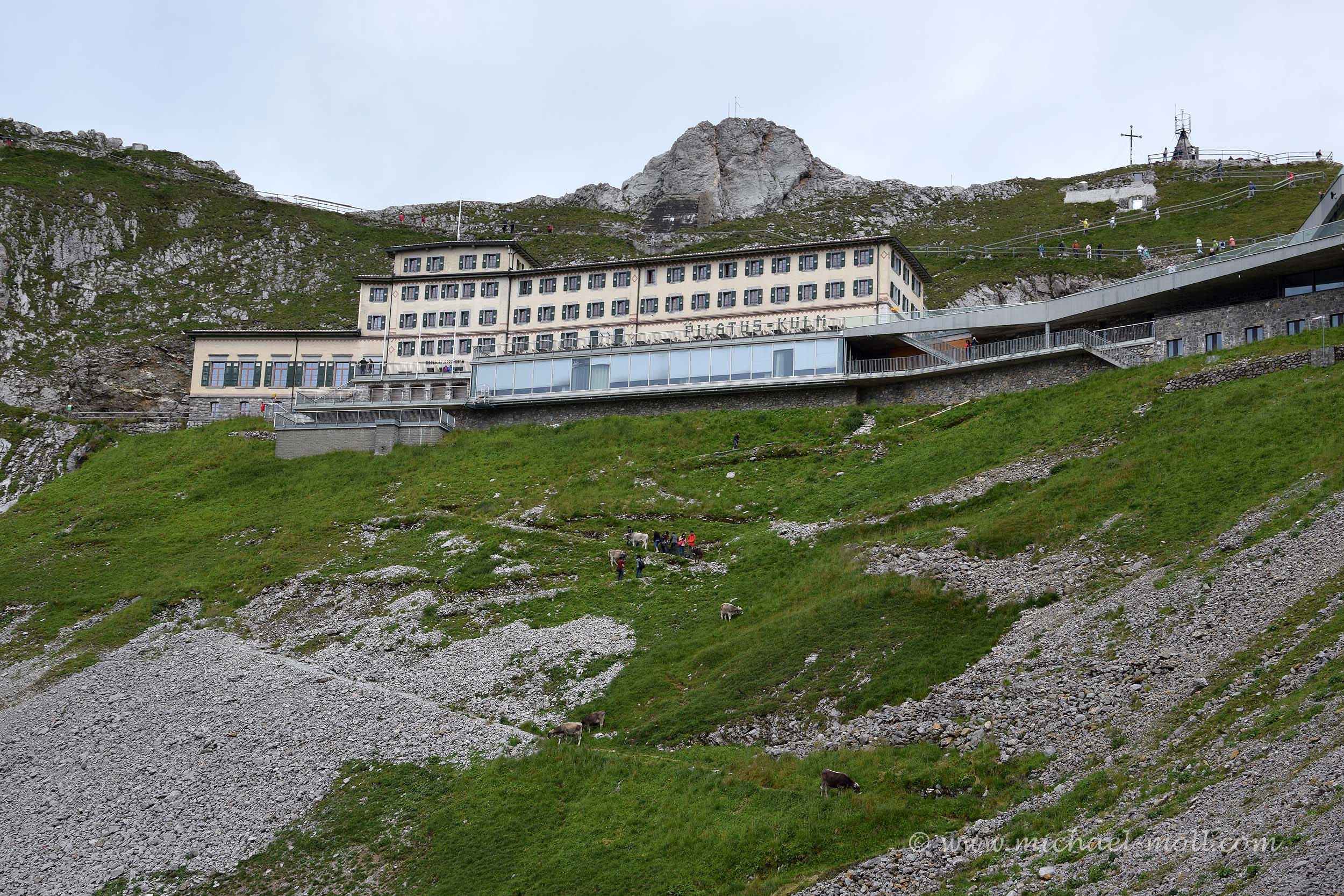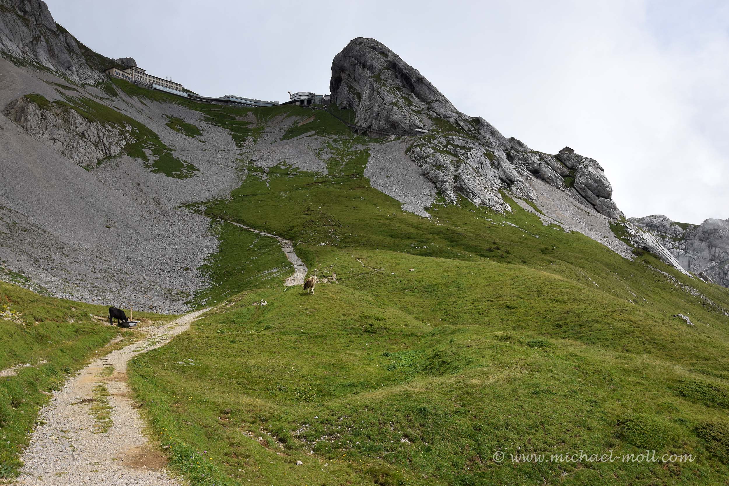 Da ich aber Flugangst habe und auch keine Seilbahn nutze, entschlossen wir uns lediglich für die Fahrt mit derZahnradbahn. Diese sollte uns daher hinauf- aber auch wieder hinabbringen. Doch beim Hochfahren auf den Pilatus sahen wir draußen einen sehr verlockenden Wanderweg und wie schon bei der Bergfahrt mit der Zahnradbahn auf den Snowdon in Wales dachten wir darüber nach, auch diesen Berg wieder zu Fuß zu verlassen. Wir hatten zwar keine Vorräte dabei, weil wir auf Bergwanderung nicht eingestellt waren, aber an der Bergstation konnten wir uns mit dem Nötigsten versorgen.