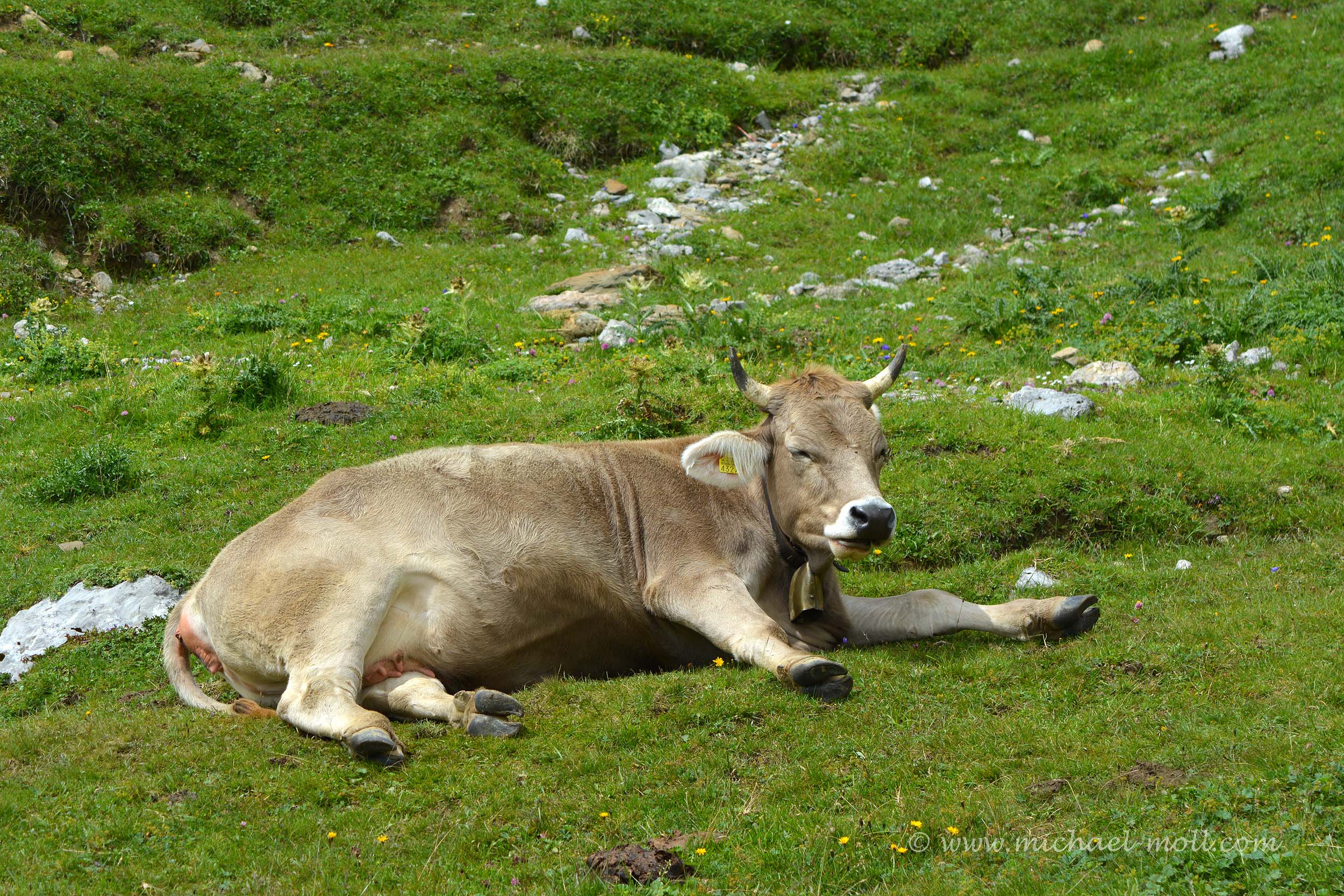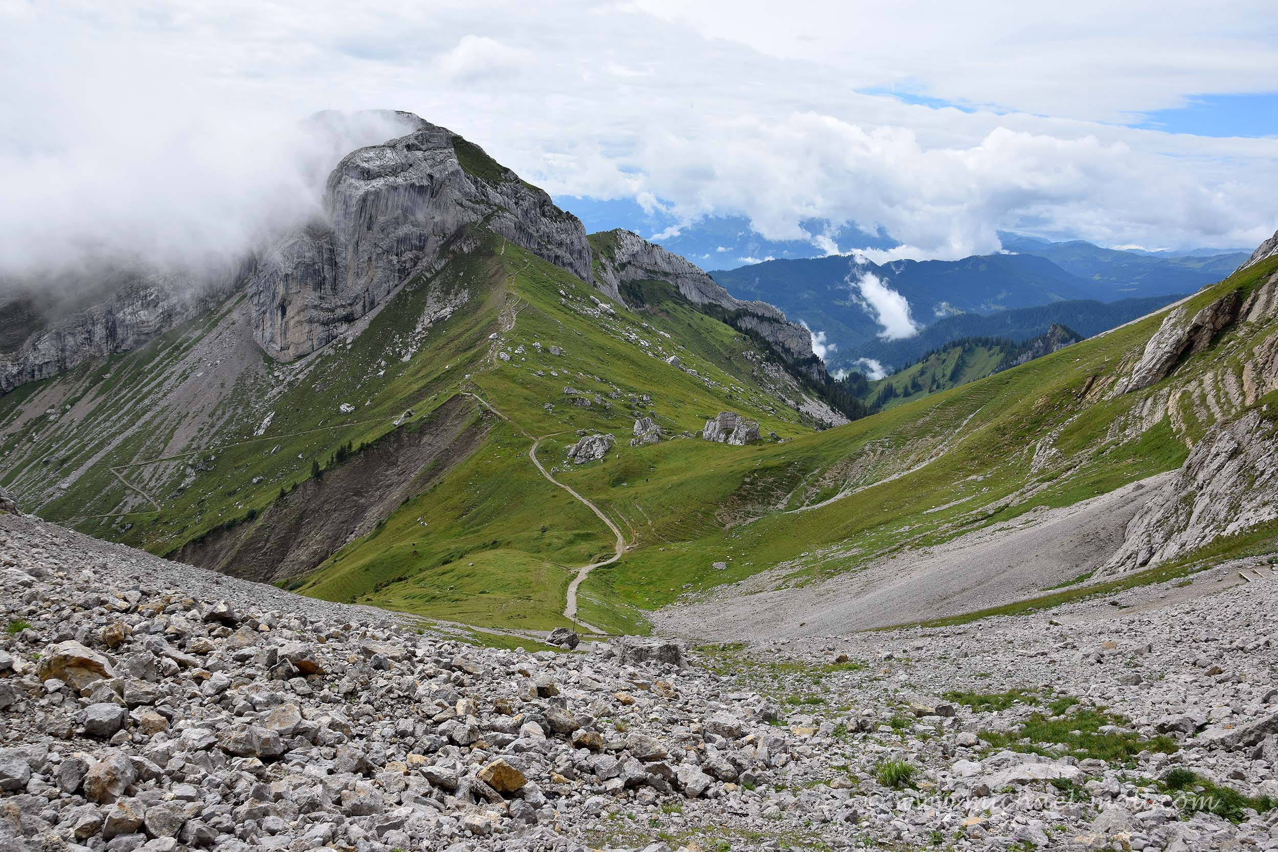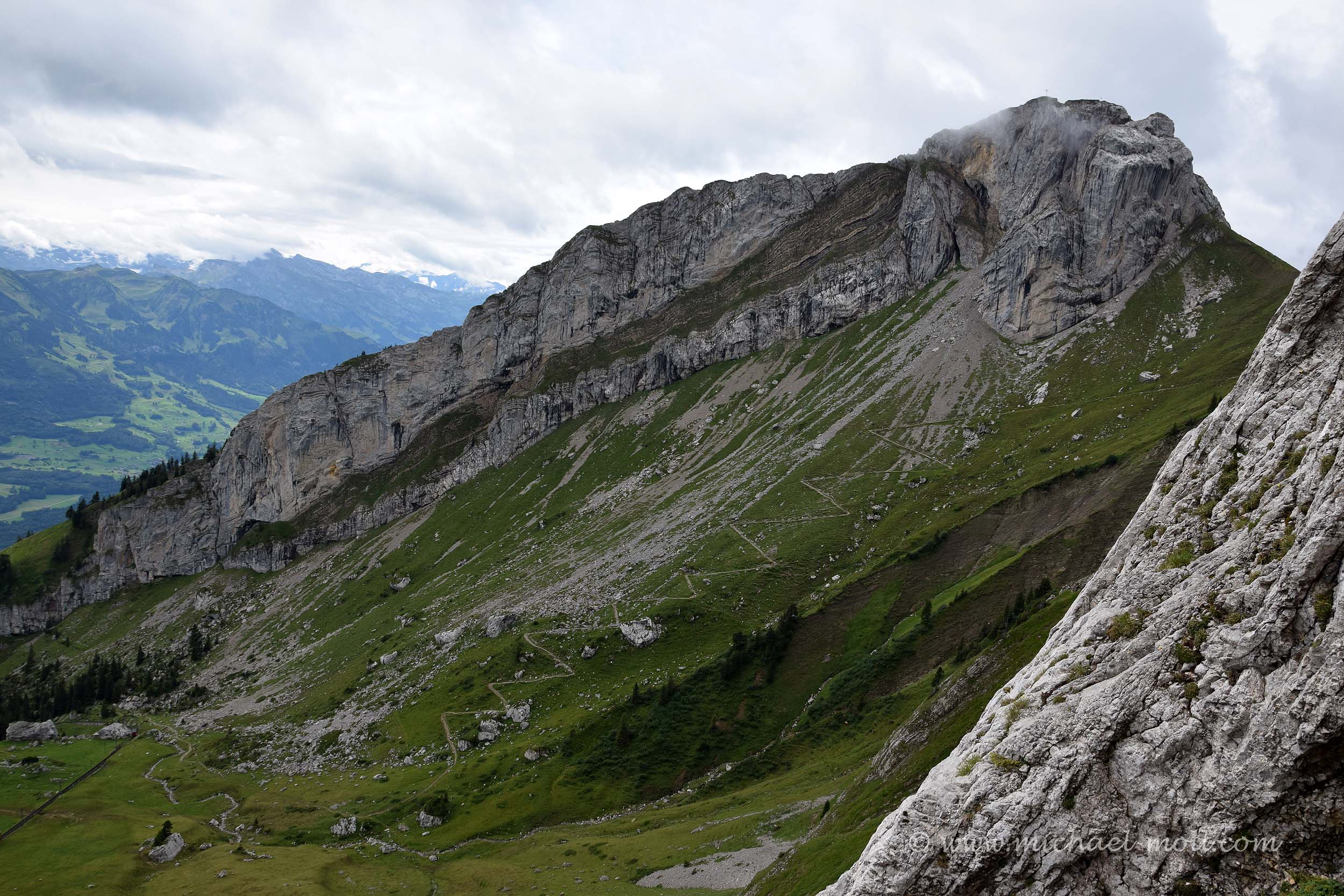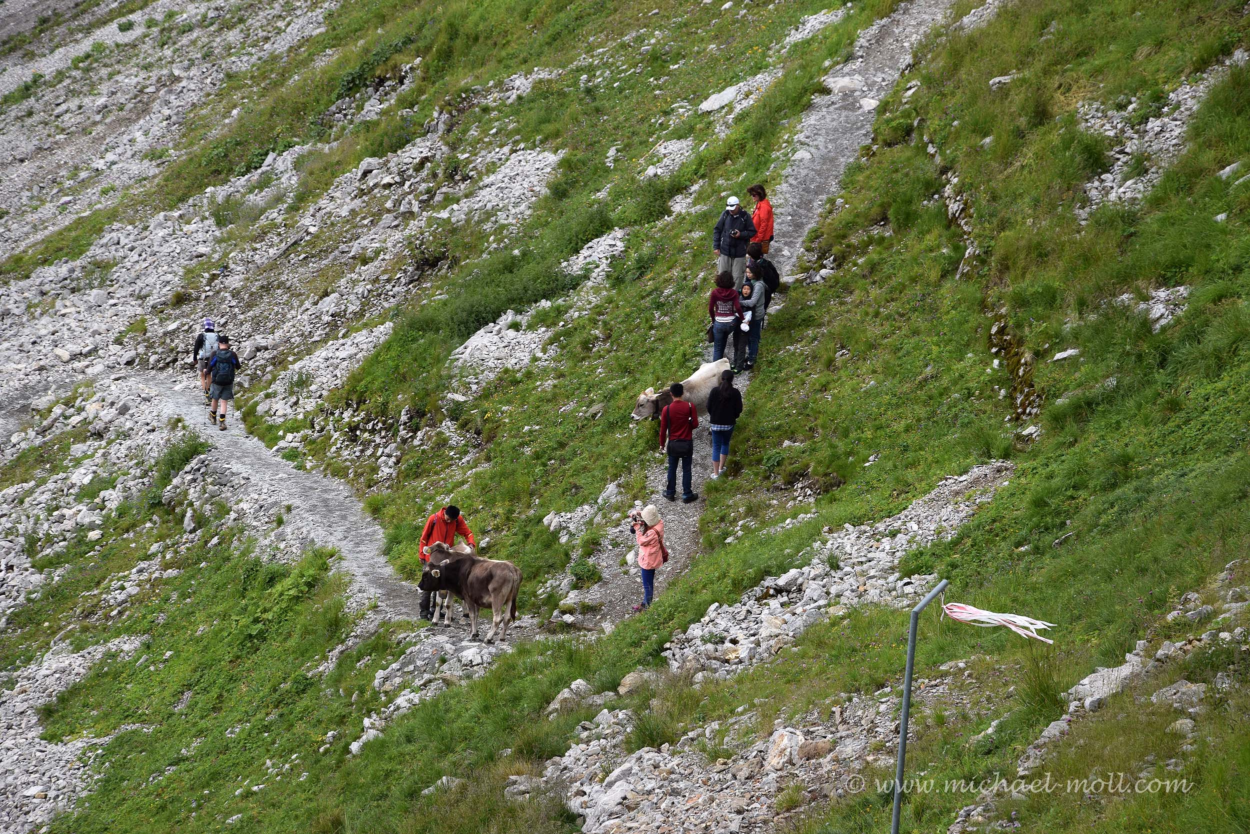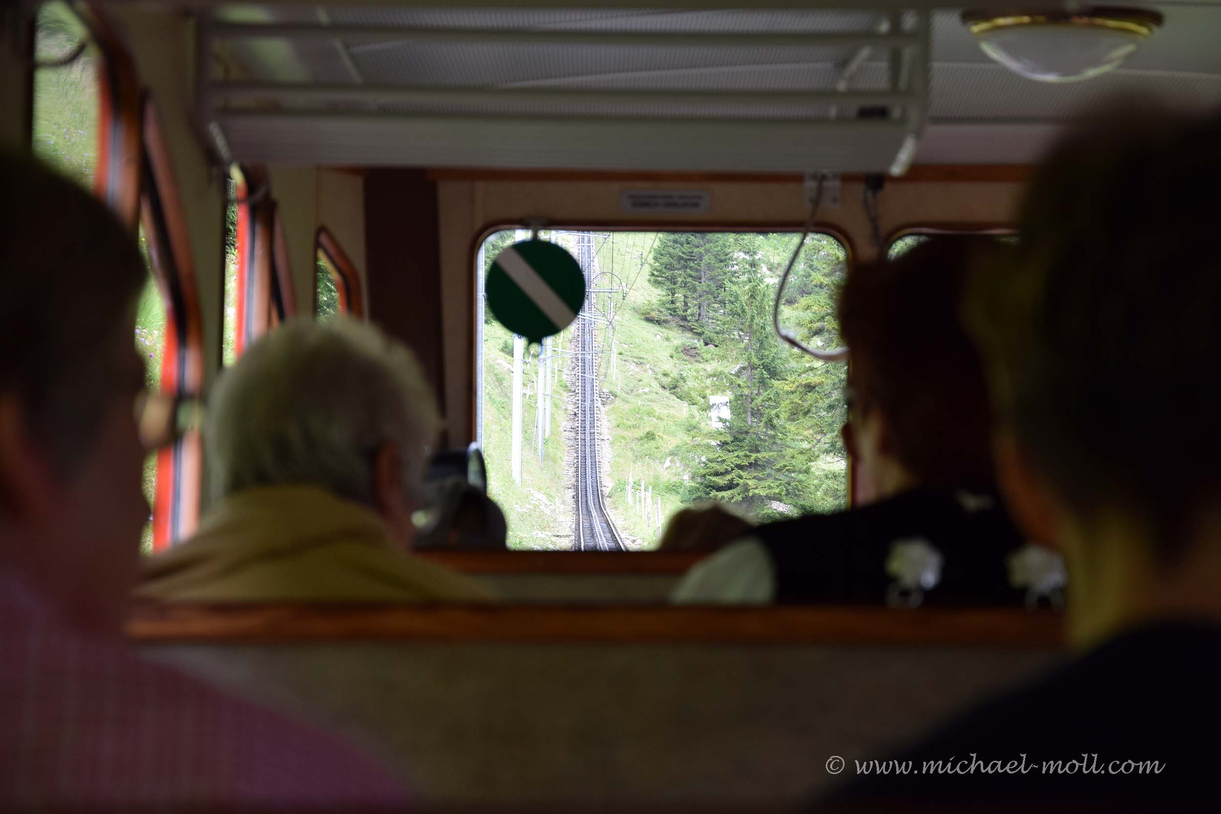 So machten wir uns also völlig spontan an den Abstieg, der trozt fehlender Karte und GPS ziemlich einfach war. Man musste in den oberen Lagen schlicht dem Zick-Zack-Weg nach unten folgen, den wir ja bereits aus der Zahnradbahn sehen konnten. Auch ab der Baumgrenze war der Wanderweg trotz nur weniger Beschilderungen sehr gut erkennbar. Es ging eben einfach auch hier im Zickzack talwärts. Dennoch war es natürlich auch anstrengend, denn mal eben ganz spontan 1.700 Höhenmeter bergab zu wandern darf natürlich nicht unterschätzt werden. Aber es war einfach zu schön und tat richtig gut, an diesem letzten Tag, den wir auf der Reise in der Schweiz verbrachten, noch einmal im Hochgebirge unterwegs gewesen zu sein.