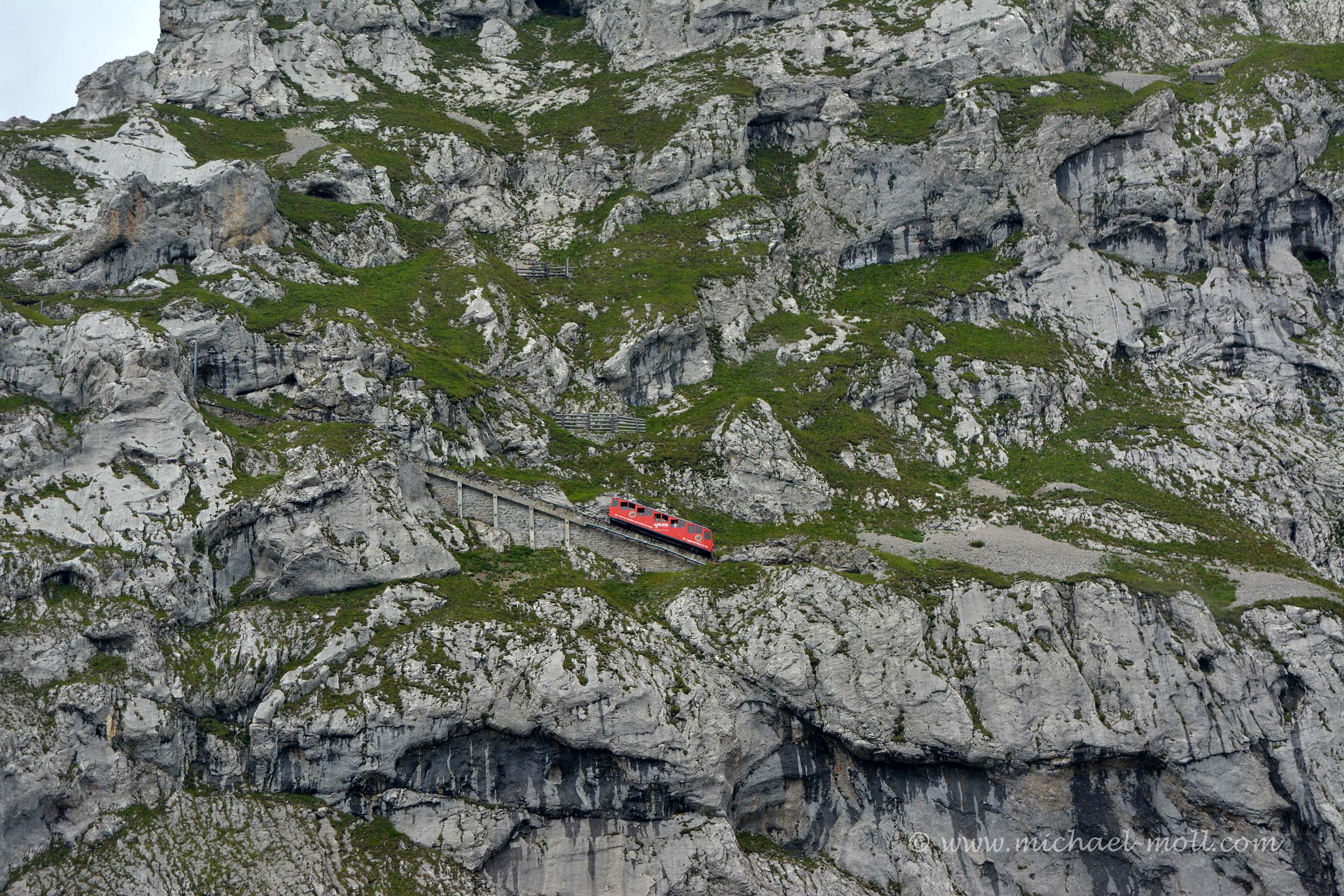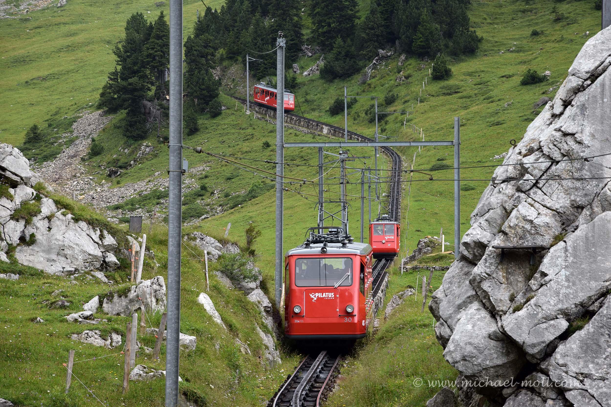 Rund 30 Minuten dauert die Fahrt, bei der man mehrere kleine Tunnel durchquert. Nicht ungewöhnlich ist es, dass mehrere Wagen gleichzeitig auf den Pilatus fahren, also mit nur wenigen Metern Abstand hintereinander unterwegs sind. Ungefähr auf der Hälte der Strecke befindet man sich an der Zwischenstation Ämsigen, die auf einer Höhe von 1.355 Metern liegt. 700 Höhenmeter sind es dann noch bis man die 2.073 Meter hoch gelegene Bergstation Pilatus Kulm erreicht hat.