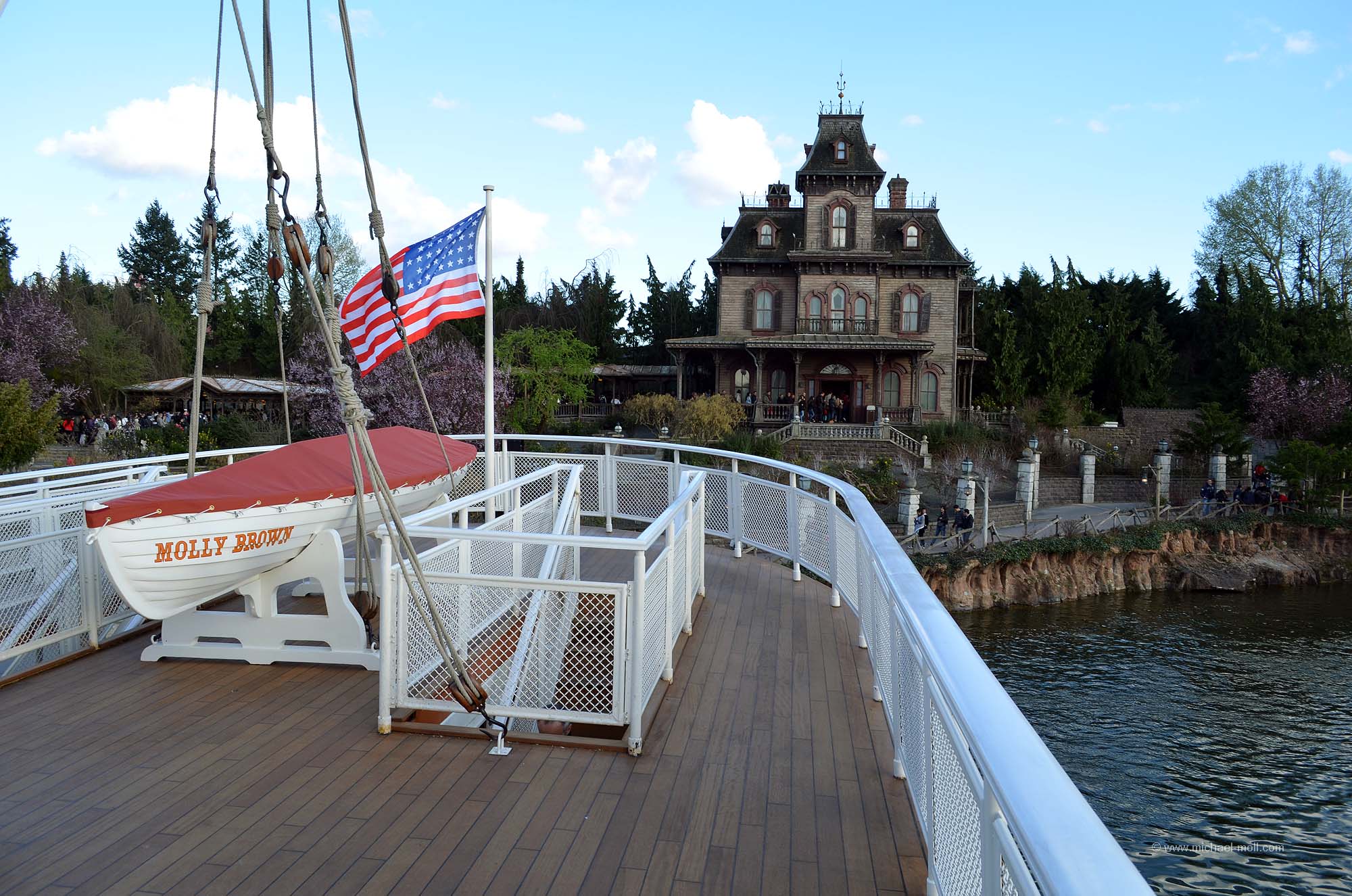 Die Straße führt direkt auf das Wahrzeichen des gesamten Disneyland zu – auf das Dornröschenschloss. Auch rund um das Schloss und in seinem Inneren kann man sich eine ganze Zeit lang beschäftigen und zahlreiche liebevolle Details entdecken. Doch das Schloss ist zugleich auch so eine Art Mittelpunkt. Von hier erreicht man mit wenigen Schritten einen der übrigen vier Themenbereiche. Wenn man nach links geht, kommt man zum Beispiel in das Frontierland, dem Nachbau einer Westernstadt. Ganz im Stile des Wilden Westens kann man hier wie ein cooler Cowboy durch Holzgebäude flanieren. Außerdem wird man recht schnell die Molly Brown entdecken. Hierbei handelt es sich um einen Schaufelraddampfer, auf man eine gemütliche Runde drehen kann. Der Dampfer fährt auf einem See und um eine Insel herum. Die Insel ist wiederum Standort für die Big Thunder Mountain, einer rasante Achterbahn. Meine Empfehlung ist aber das Phantom Manor, ein Geisterhaus mit wirklich tollen Effekten.