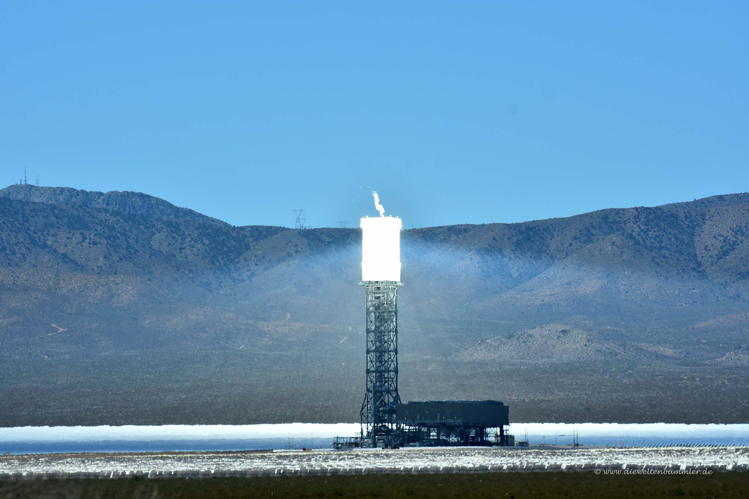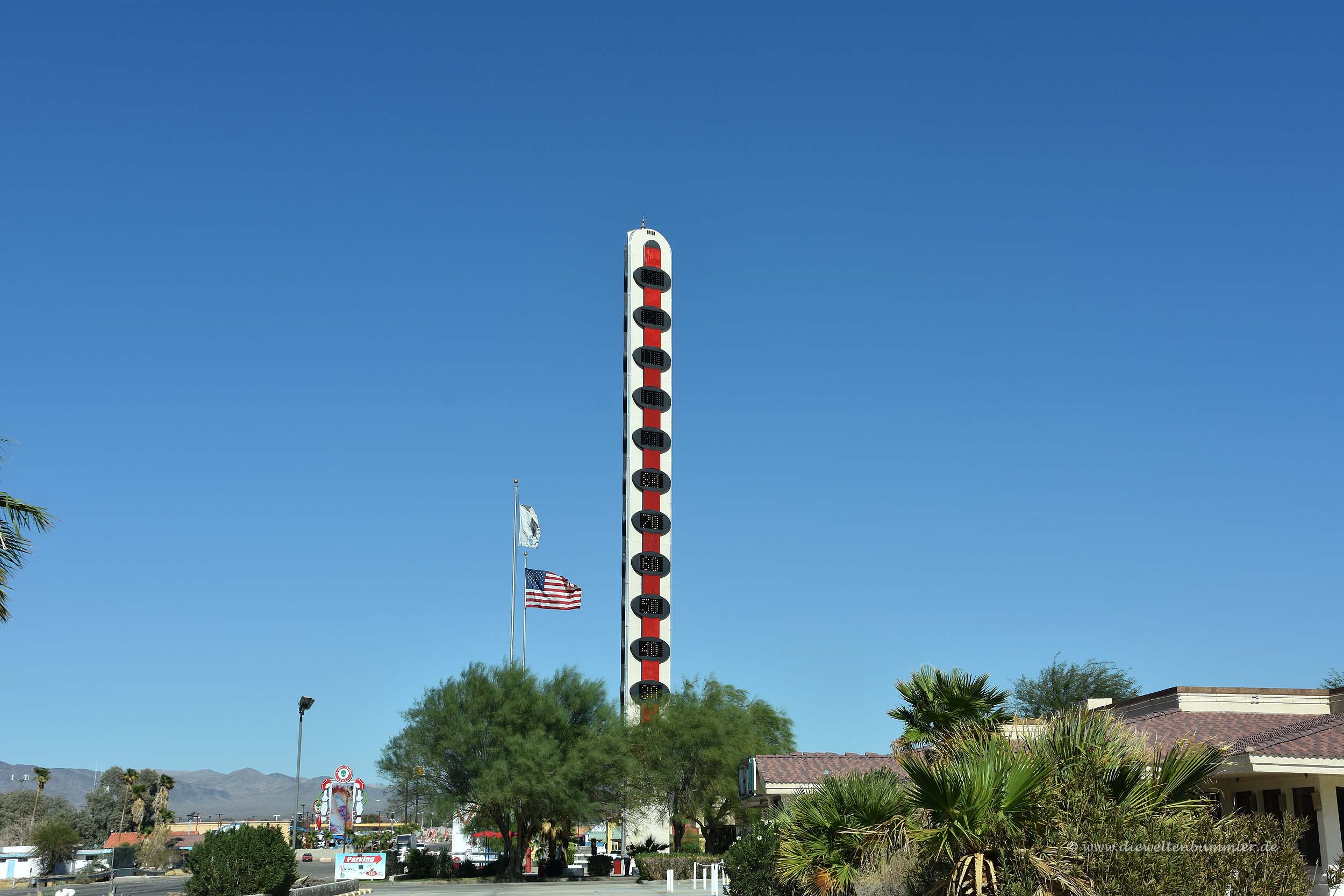 Außerdem sieht man immer wieder mal Solarkraftwerke, denn auf Sonnenlicht ist hier ziemlich Verlass und dementsprechend ist es hier auch, wie eingangs schon erwähnt, sehr warm. So warm, dass in der kalifornischen Kleinstadt Baker sogar das größte Thermometer der Welt steht.