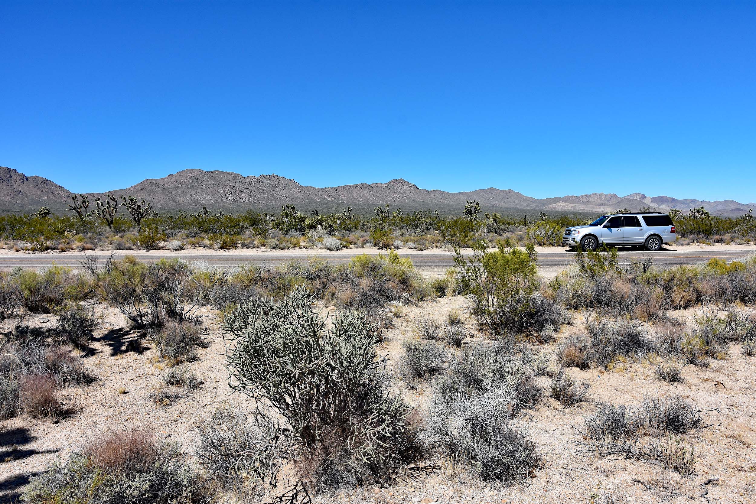 Dafür flogen aber einige Greifvögel über unseren Köpfen hinweg und an Pflanzen mangelt es auch nicht. Dominierend ist hierbei die Joshua-Palmlinie, bekannt auch als Joshua-Tree. Sie sieht man immer wieder und prägt die einsame Weite der Landschaft.