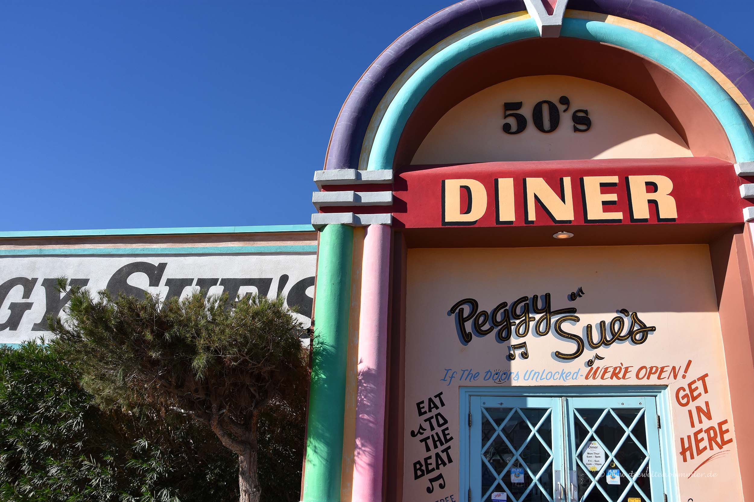 Gelegentlich stößt man auch auf klassische Sachen, die für die USA stehen, so zum Beispiel das Peggy Sue’s Diner an der Route 66. Die legendäre Straße verläuft genau daran vorbei und es ist natürlich Pflicht, wenigstens mal einen Blick hineingeworfen zu haben.