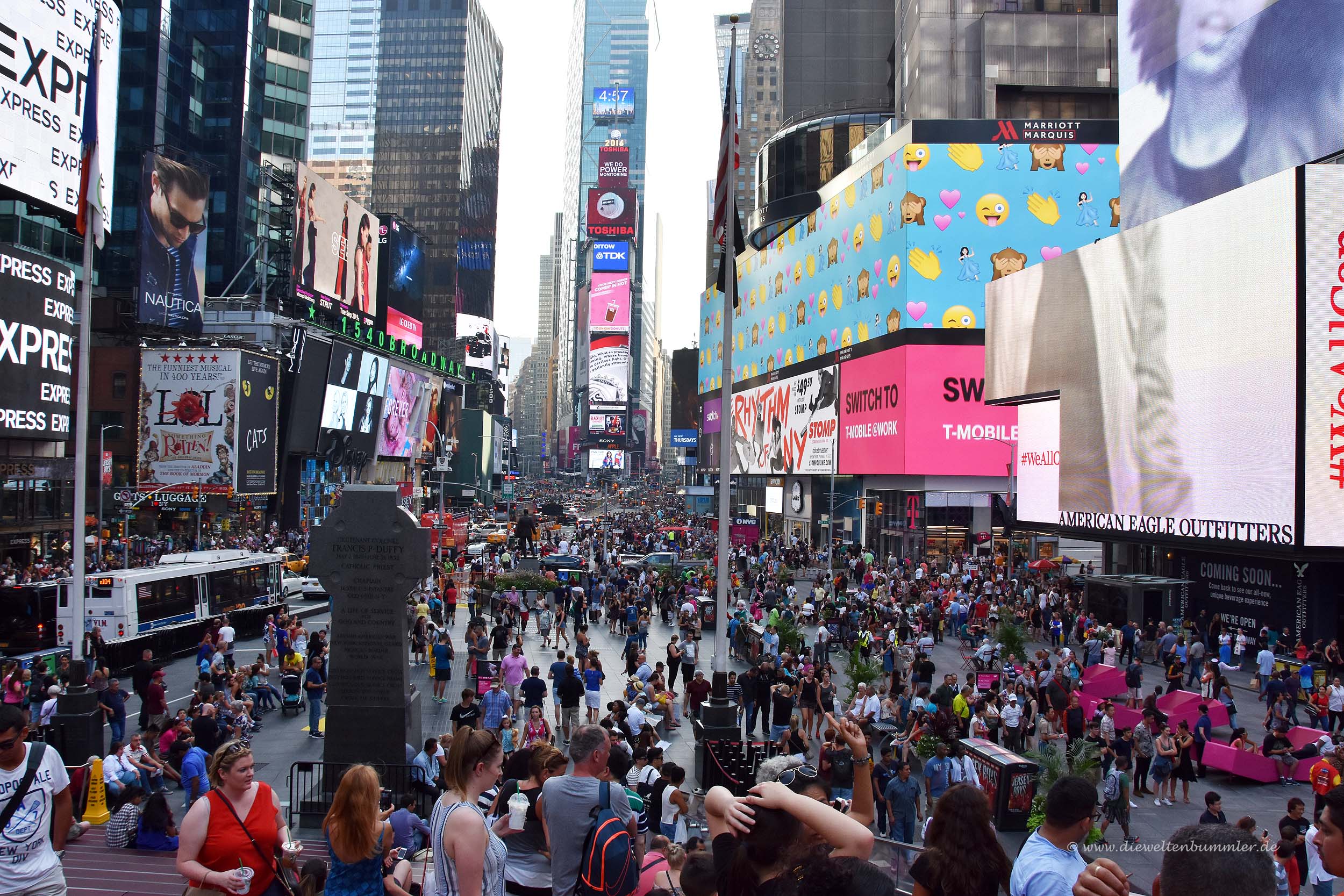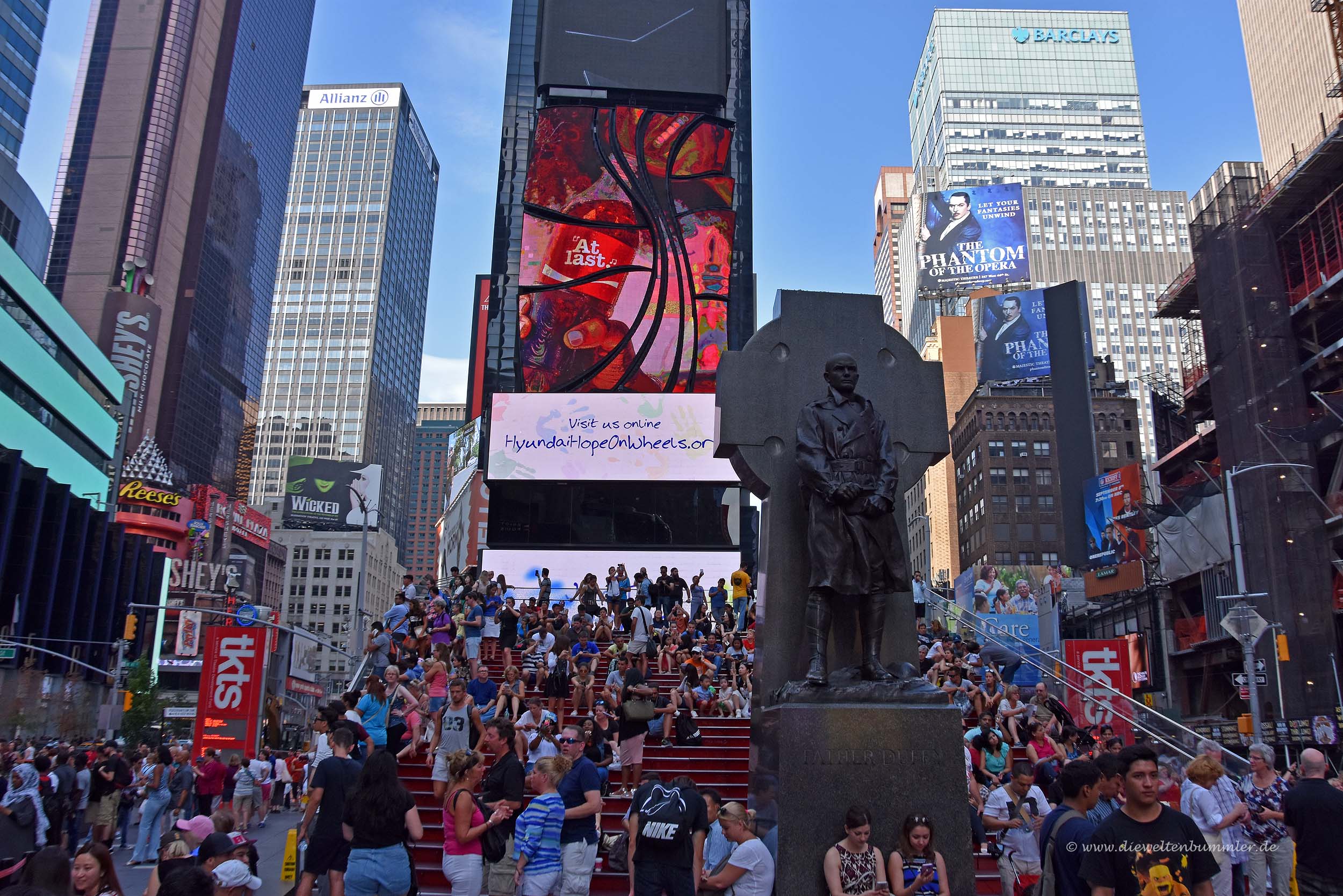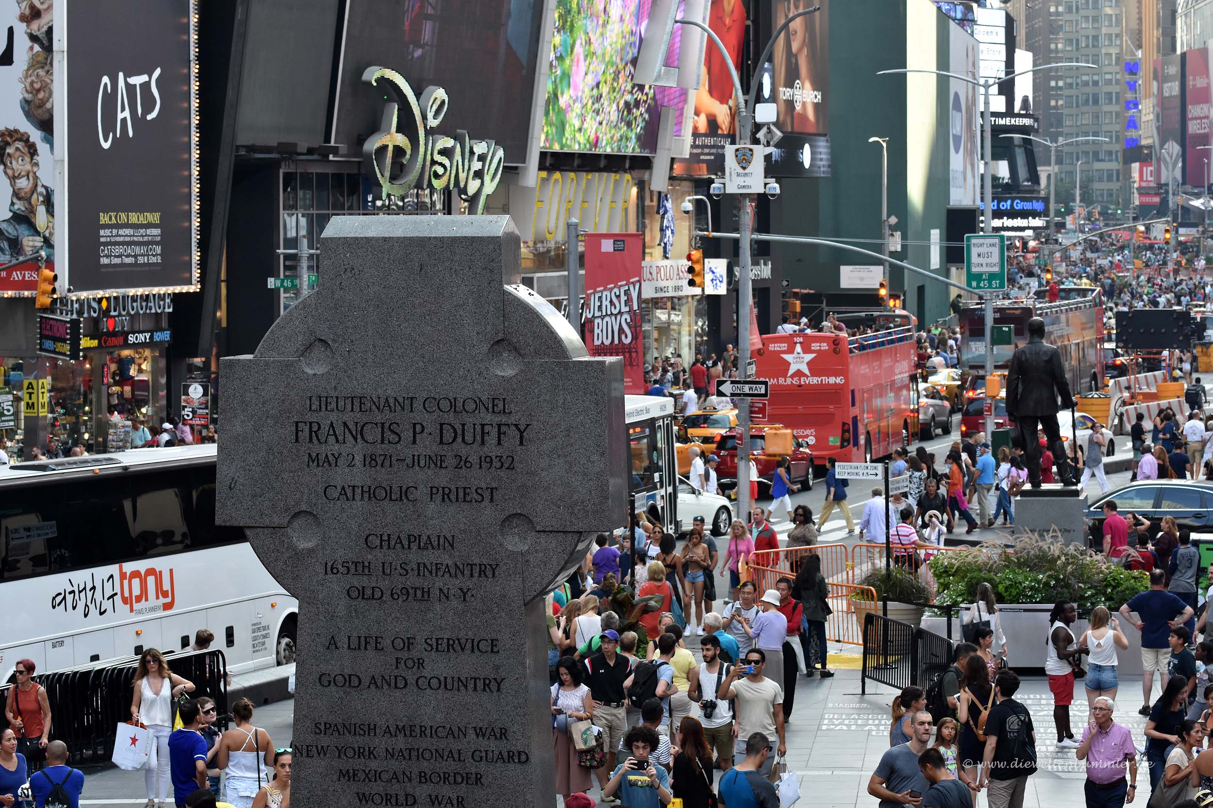 Am Aufgang der Tribüne erhebt sich ein Denkmal zu Ehren von Francis Duffy. Er war Militärgeistlicher in diversen Kriegen und starb 1932. Nach ihm ist dieser Bereich des Times Square benannt, aber für die meisten Besucher dürfte das keine Rolle spielen und alles pauschal der Times Square sein.