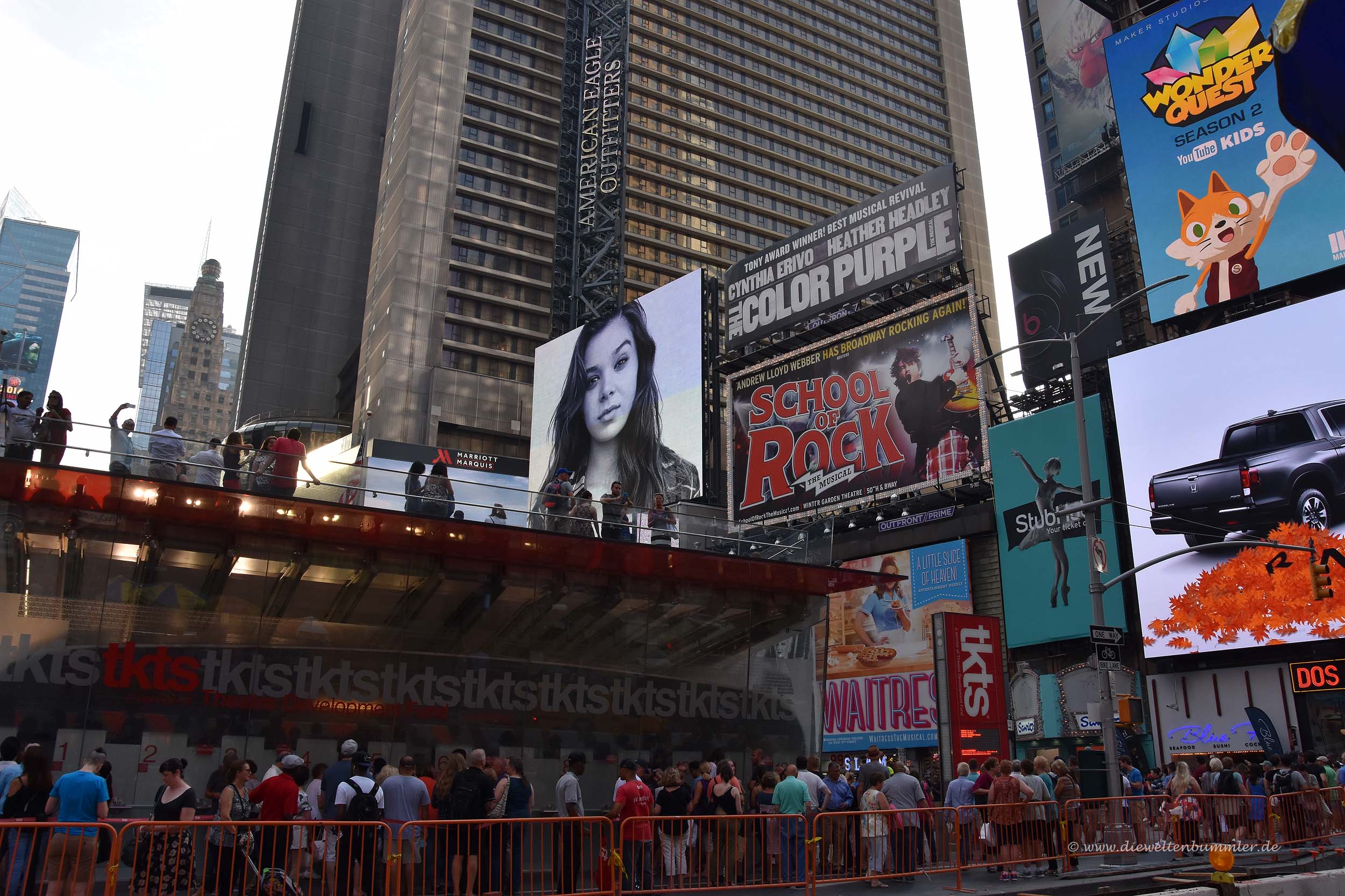 Im nördlichen Bereich des Times Square gibt es ein Ticketbüro, in dem man die Eintrittskarten für die zahlreichen Theater in der Umgebung erstehen kann. Das Dach ist ansteigend gebaut worden und dient als eine Art Tribüne. Von dieser Tribüne hat man natürlich einen wunderbaren Ausblick auf den Platz.