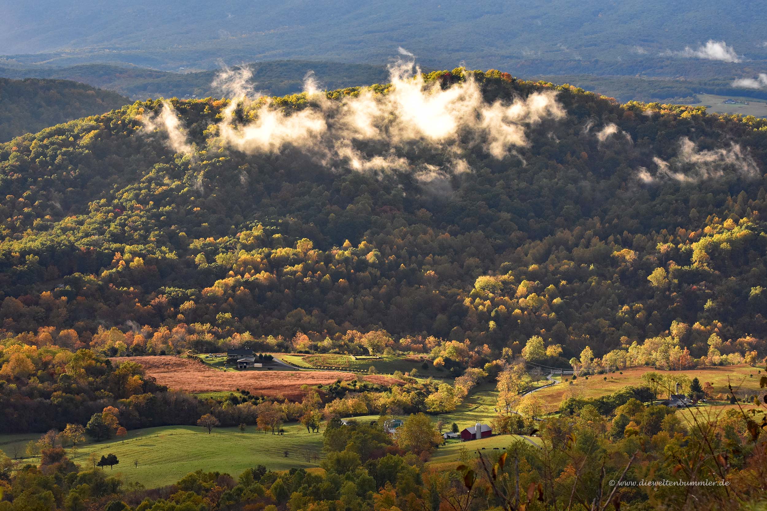 Auf der anderen Seite des Flusstals erheben sich die sanften Kuppen und Hügel der Blue Ridge Mountains. Diese sind Teil der Appalachen und wurden vom Country-Sänger John Denver im bekannten Lied „Take me home, country roads“ besungen.