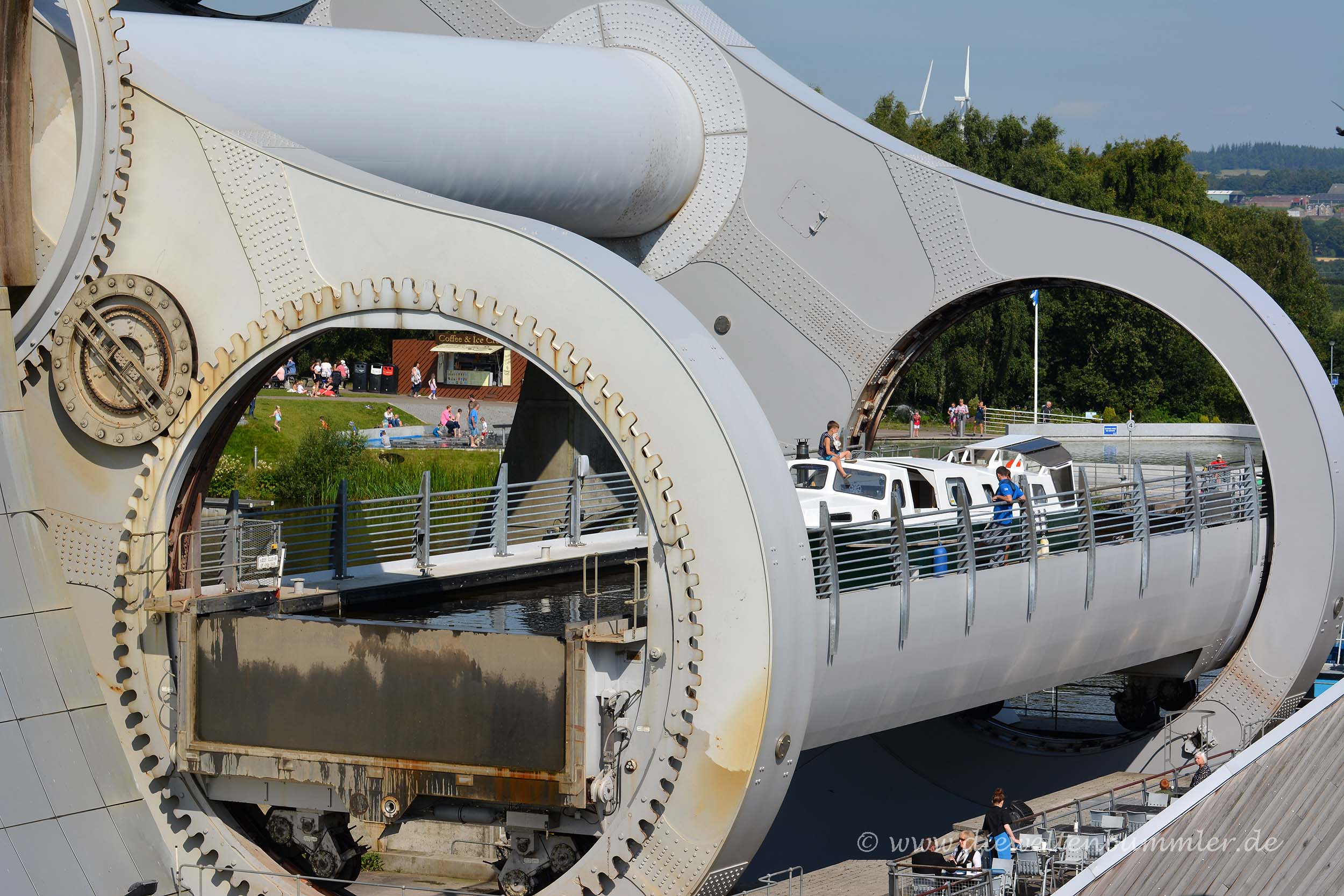 Hier fährt das Schiff in eine überdimensionierte Wanne, die zusammen mit einer zweiten Gondel an einer Radnabe befestigt sind. Die Nabe dreht sich und befördert so die beiden Gondeln in die jeweils andere Position. Die gesamte Prozedur dauert rund fünf Minuten und schon ist man mit seinem Boot von einem in den anderen Kanal gewechselt. Um das Ganze zu verdeutlichen, habe ich so einen Vorgang einfach mal gefilmt und zeige ihn hier in Originalgeschwindigkeit: