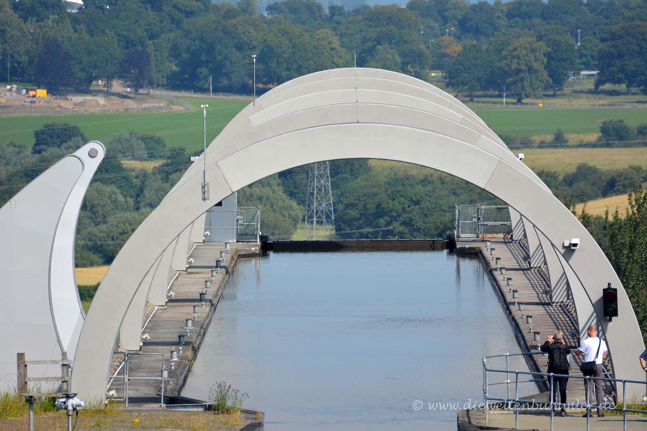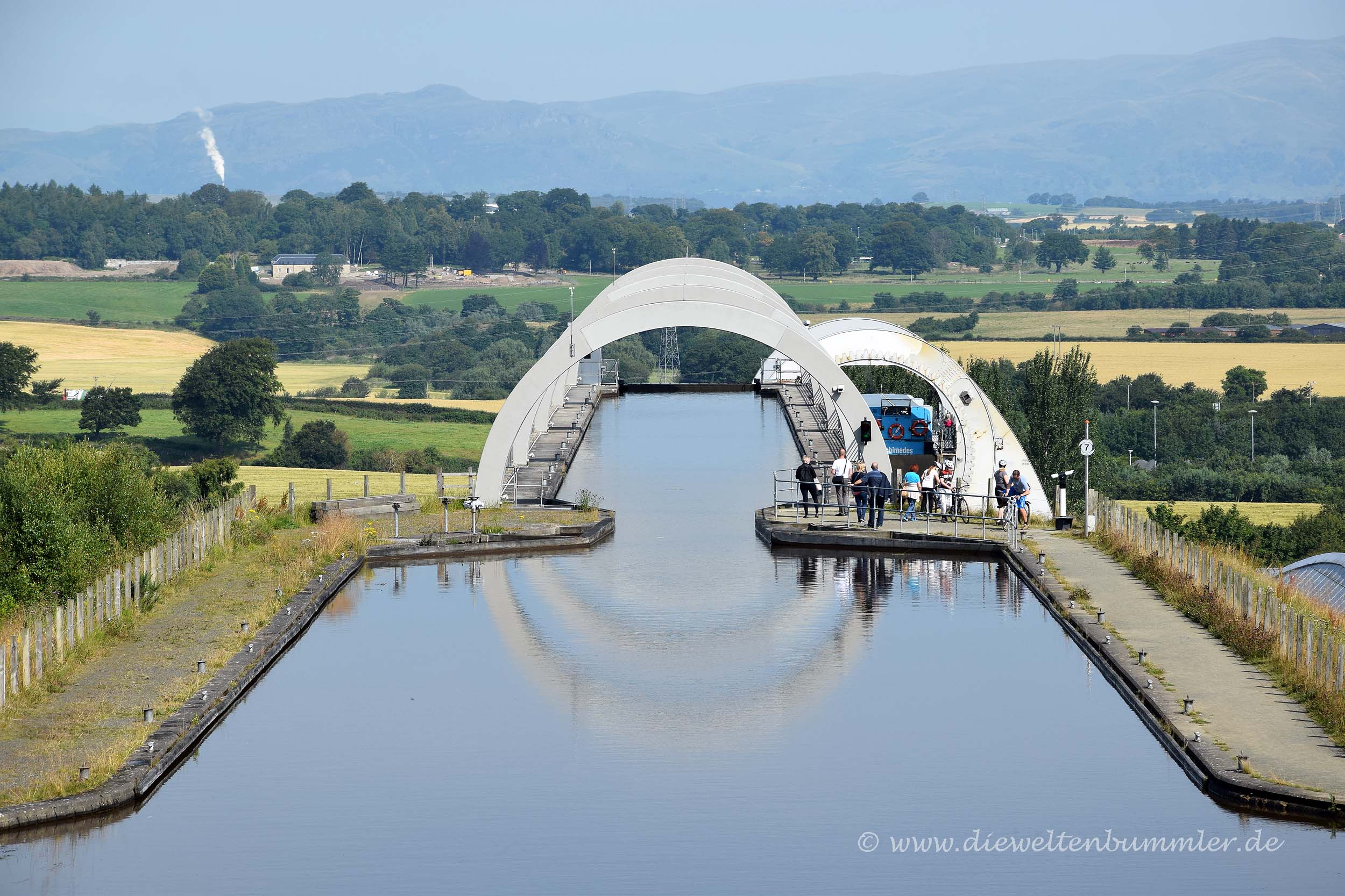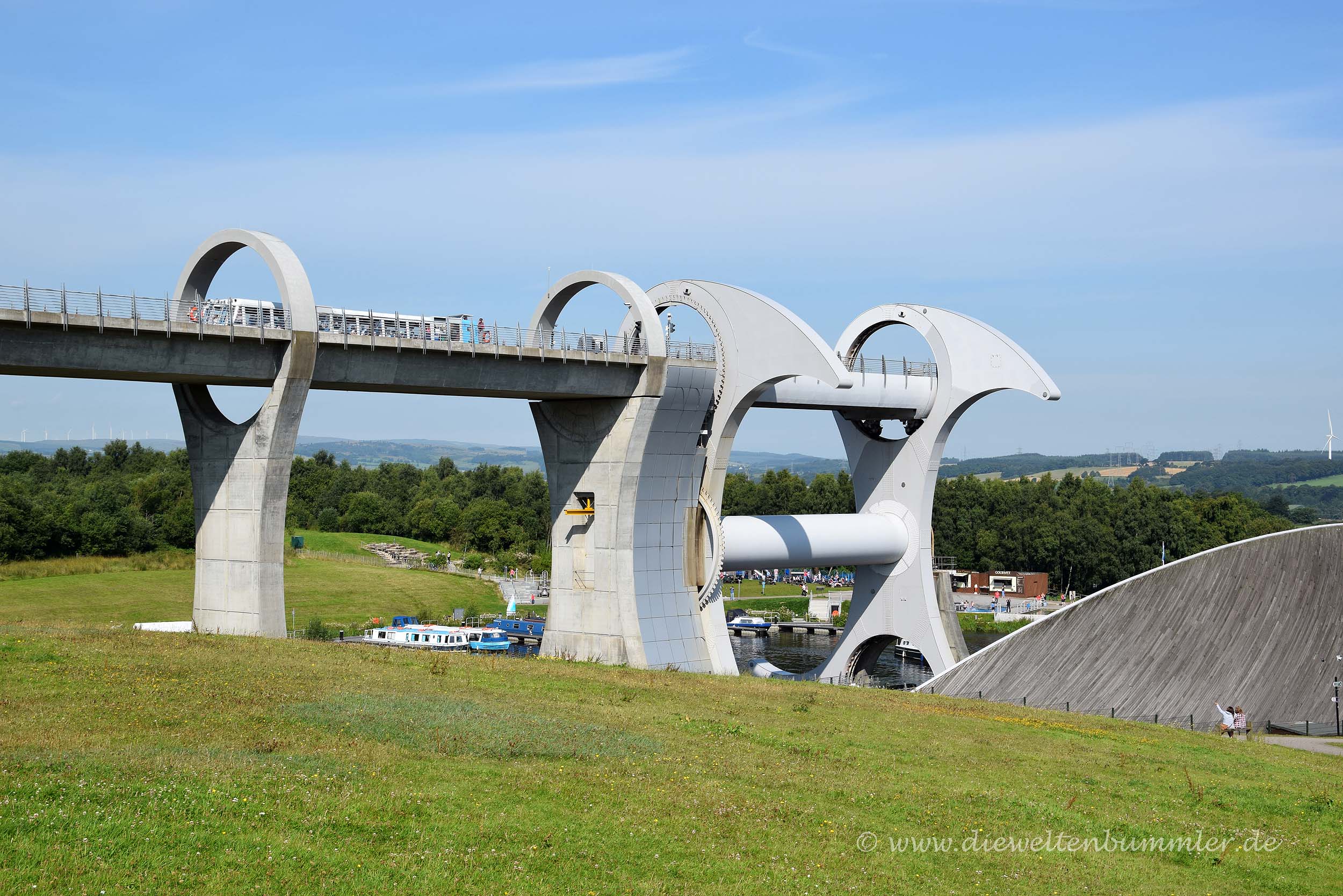 Dabei hat das Falkirk Wheel nichts weiter zu tun als die klassische Aufgabe eines Schiffshebewerks zu erfüllen. Im Westen der gleichnamigen Stadt Falkirk verbindet dieses Werk zwei Kanäle miteinander, die jedoch einen Höhenunterschied von rund 24 Metern aufweisen.