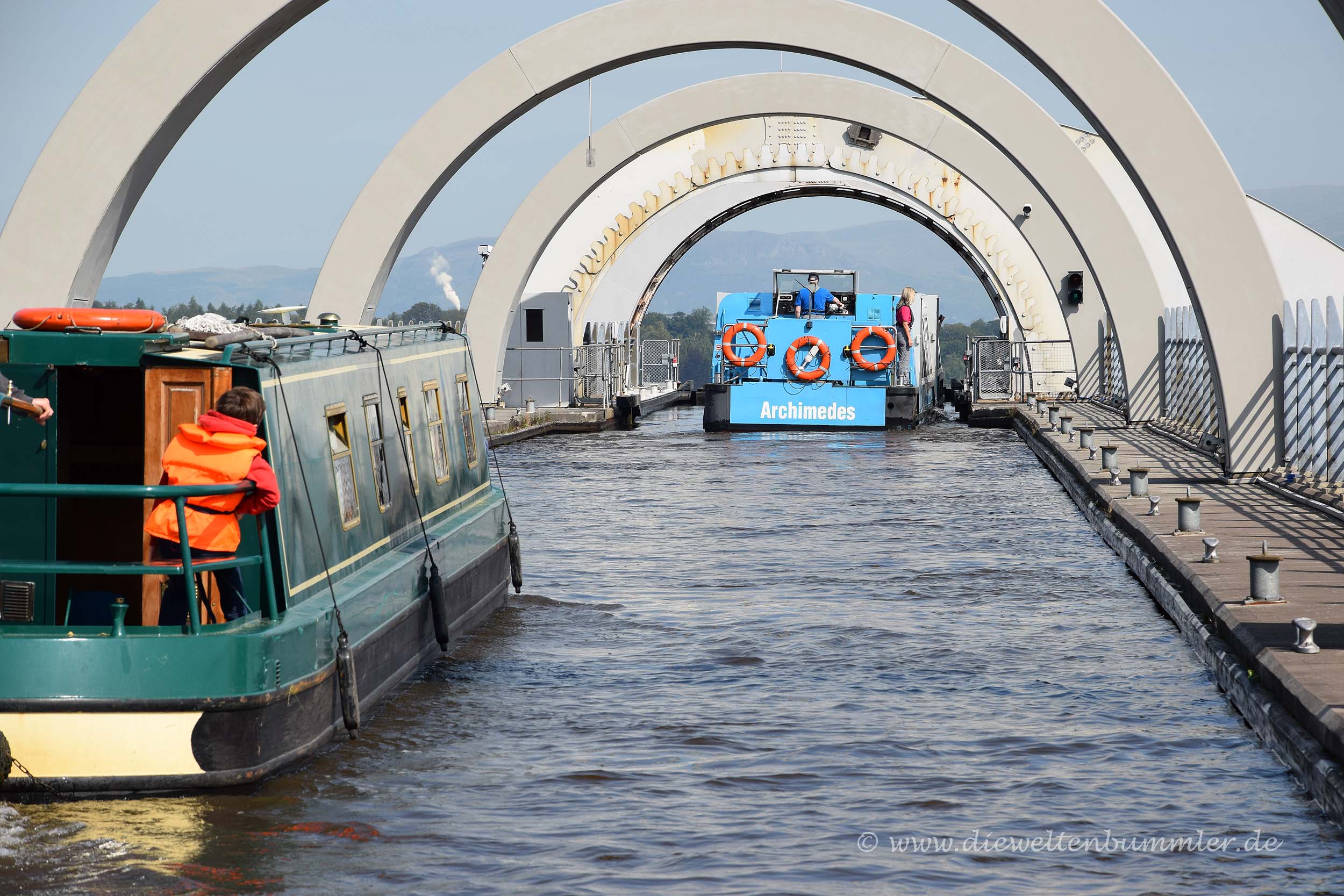 Um diesen Höhenunterschied zu überwinden, können Besucher in schmalen Narrowbooten auf den Kanälen fahren und mittels des Wheels von einem Kanal in den anderen wechseln. Das Besondere dabei ist, dass der südlich gelegene Kanal zu einer Art Brückenkonstruktion wird. Das heißt, man fährt mit dem Schiff durch einen Trog, während es rechts und links in die Tiefe geht. Am Ende des Bauwerks wartet jedoch kein zweiter Brückenkopf, sondern eben das Falkirk Wheel.