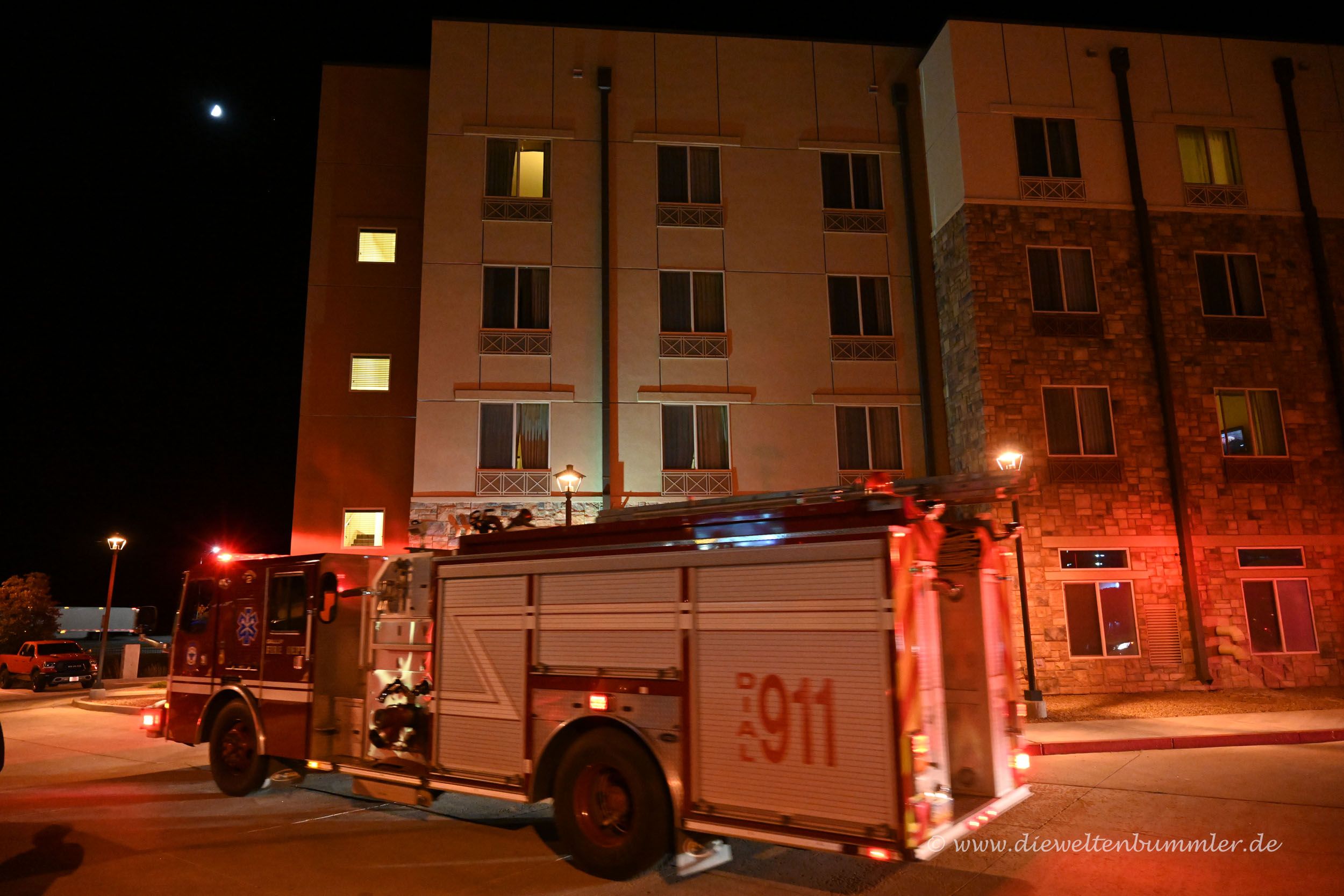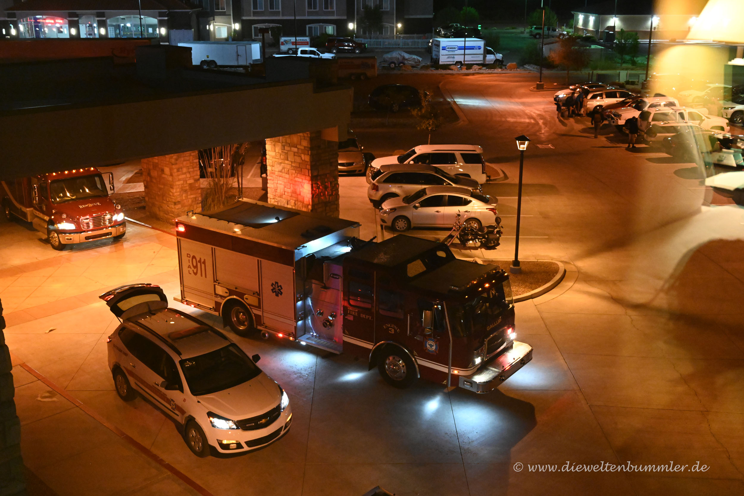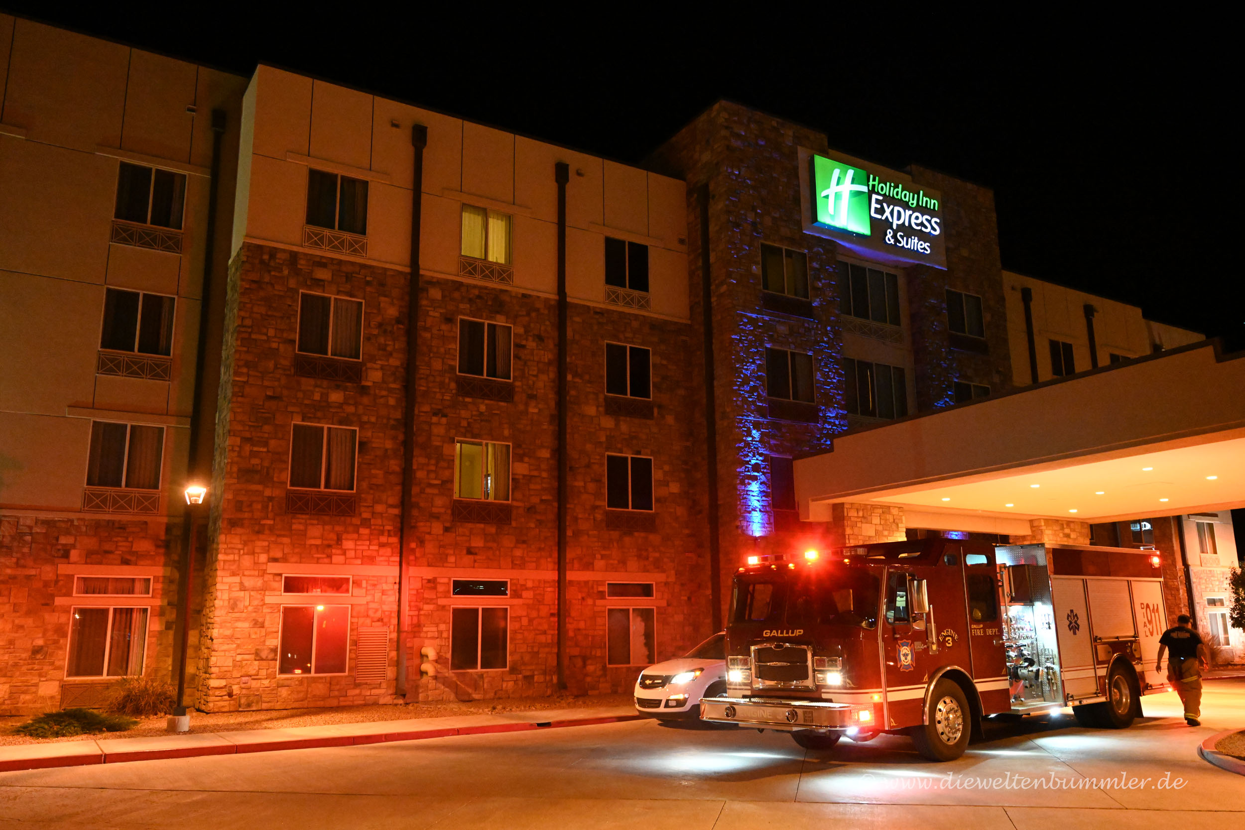 Gerade als dieser uns erklären wollte, dass alles in Ordnung sei, löste der Feueralarm wieder aus und die Sirene drehte so auf, als wollte sie ganz New Mexico beschallen. Freiwillig zogen alle Hotelgäste wieder in die abendliche Kälte nach draußen. Dort sahen wir schließlich, wie ein Pkw recht flott um die Ecke kam und die Fahrerin eilenden Schrittes zur Rezeption ging. Wir vermuteten, dass es sich um die Hotelmanagerin handeln musste, die vermutlich einen Schlüssel brachte, damit man dem ganzen Spuk ein Ende bereiten konnte.