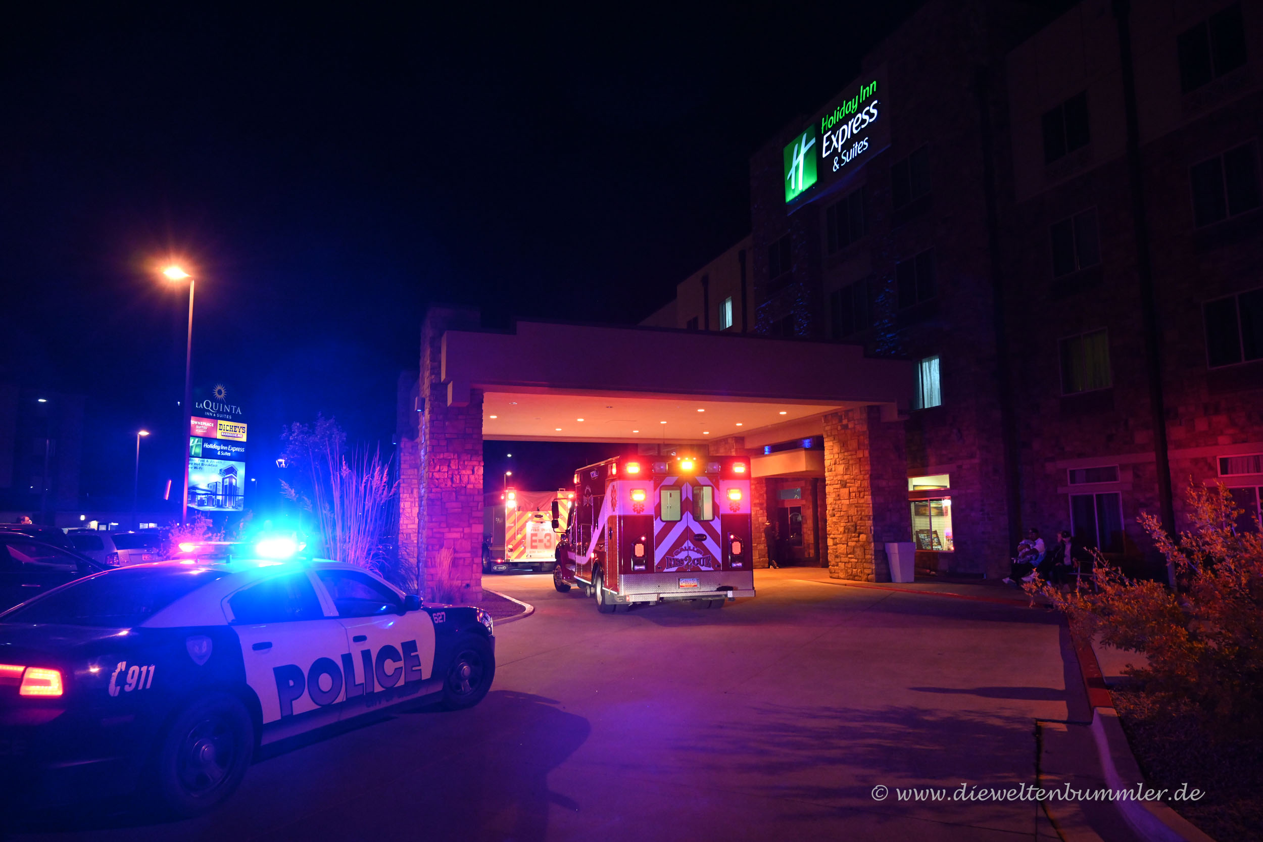 Die Feuerwehr traf mit mehreren Fahrzeugen ein, umzingelte das Hotel und machte sich auf die Suche nach dem Grund des Feueralarms. Die Feuerwehrleute waren auch ziemlich entspannt, weil ihnen wohl klar war, dass es sich um einen Fehlalarm handeln musste. Doch die Prüfung, ob der Feueralarm zu recht ausgelöst wurde oder nicht, dauerte relativ lange. Erst nach über einen halben Stunde konnte die Sirene abgeschaltet werden und alle Hotelgäste durften wieder ins Gebäude. In der Lobby bat man uns, noch kurz auf den leitenden Feuerwehrmann zu warten.