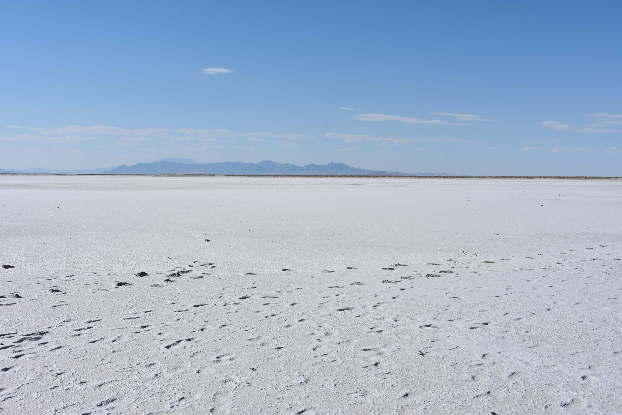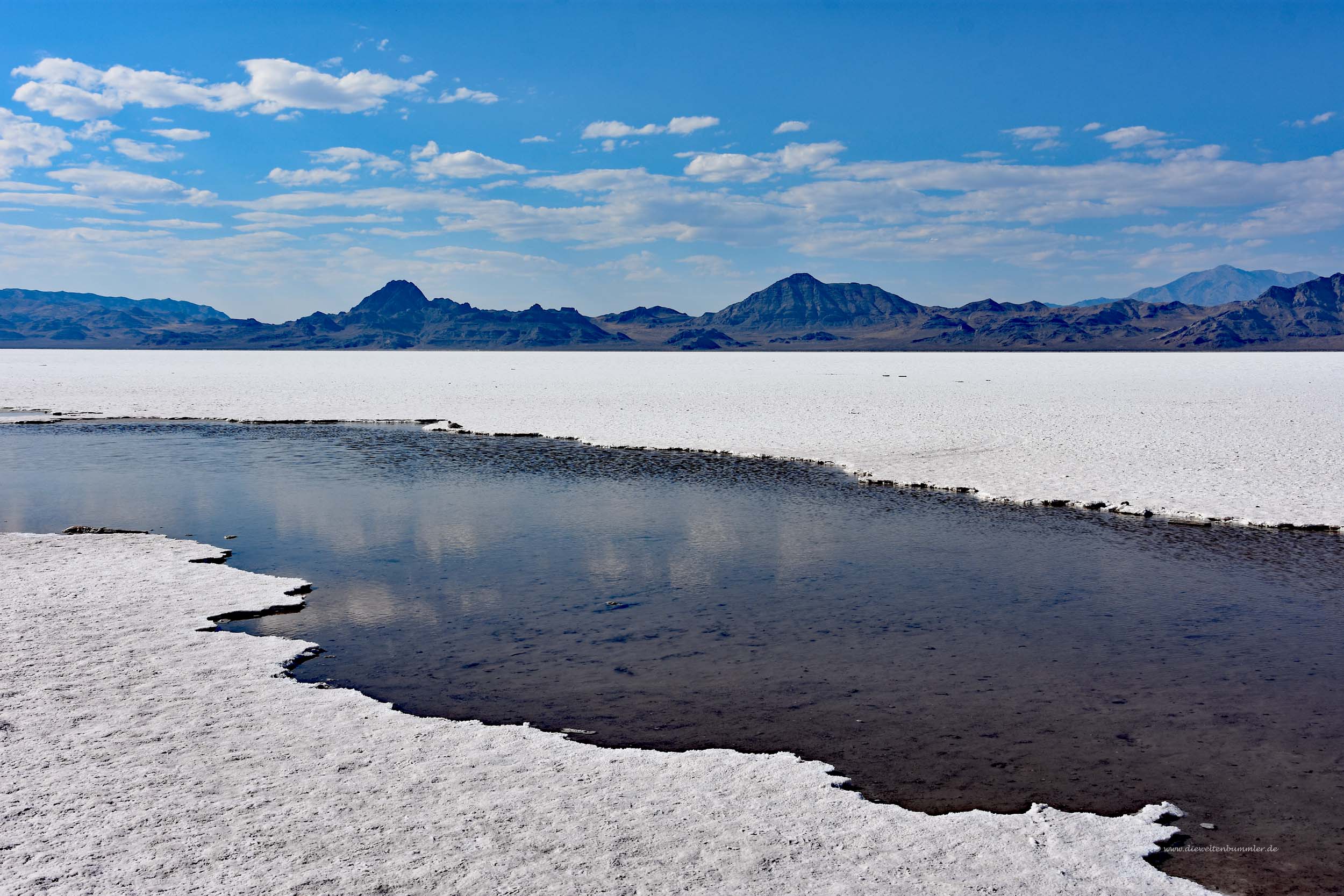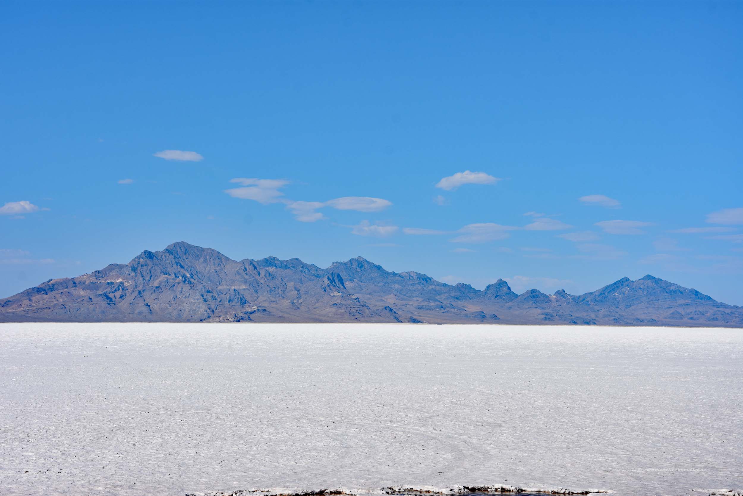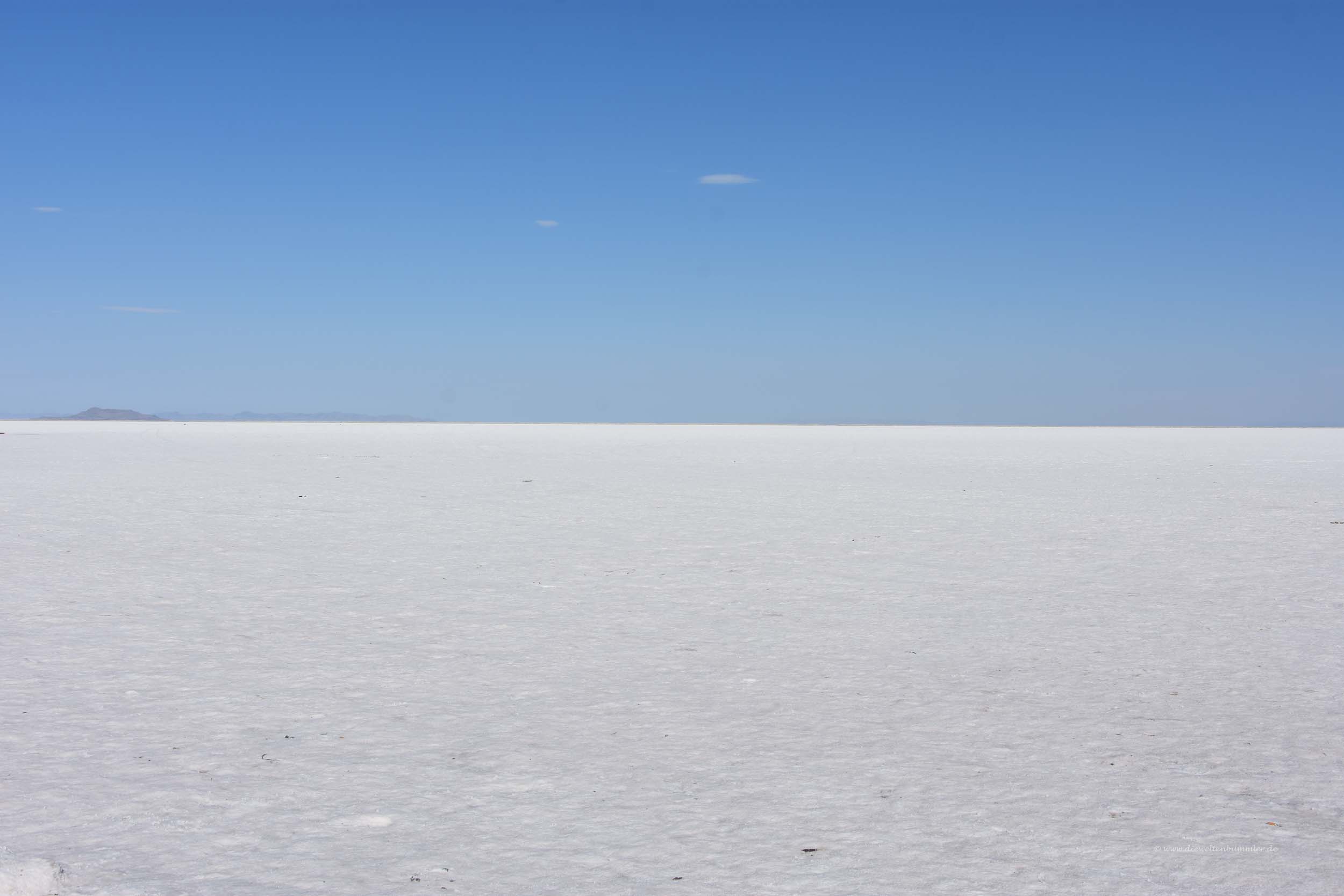 Und auf den letzten 60 Kilometern vor Wendover, so heißt der kleine Ort an dem ersten Wendepunkt, sieht man rechts und links der Straße nichts weiter als eine große weiße Salzwüste. Ein faszinierender Anblick, der an den meisten Stellen bis zum Horizont reicht. Ansonsten reicht der Blick immerhin bis zu verschiedenen Hügelketten, die aber ebenfalls extrem weit entfernt sind.
