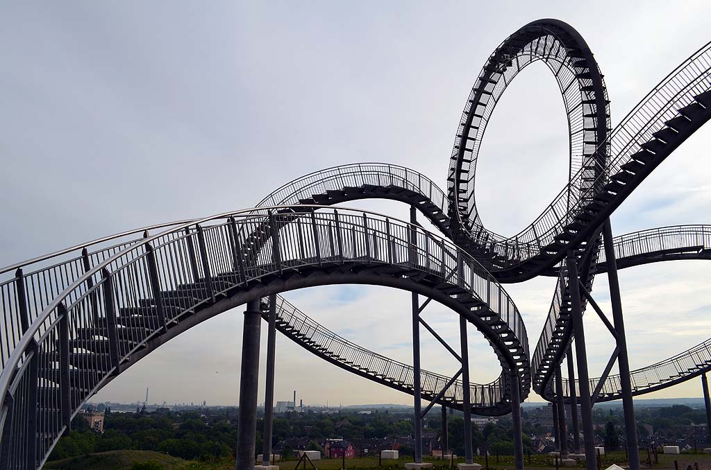 Deutlich jünger, nämlich erst im Jahr 2011 entstanden, ist die Achterbahn für Fußgänger auf der Heinrich-Hildebrandt-Höhe in Duisburg. Sie trägt den Namen Magic Mountain bzw. Tiger & Turtle und sieht nicht nur spektakulär aus. Lediglich der Looping ist gesperrt, hat irgendwas mit Schwerkraft zu tun. 😉 Aber ansonsten ist die Achterbahn komplett begehbar. Zu den Klassikern zählt jedoch zweifellos das Tetraeder (fälschlicherweise oft auch „der“ Tetraeder genannt). Er befindet sich in Bottrop und als wenn die dortige Halde nicht schon hoch genug wäre, kann man diesen pyramidenförmigen Aussichtsturm auch noch besteigen. Nur nicht wundern: Die dritte, oberste Aussichtsplattform ist schräg angelegt. Ein bisschen Nervenkitzel muss doch sein und nicht jeder wagt den Aufstieg bis zum höchsten Punkt.