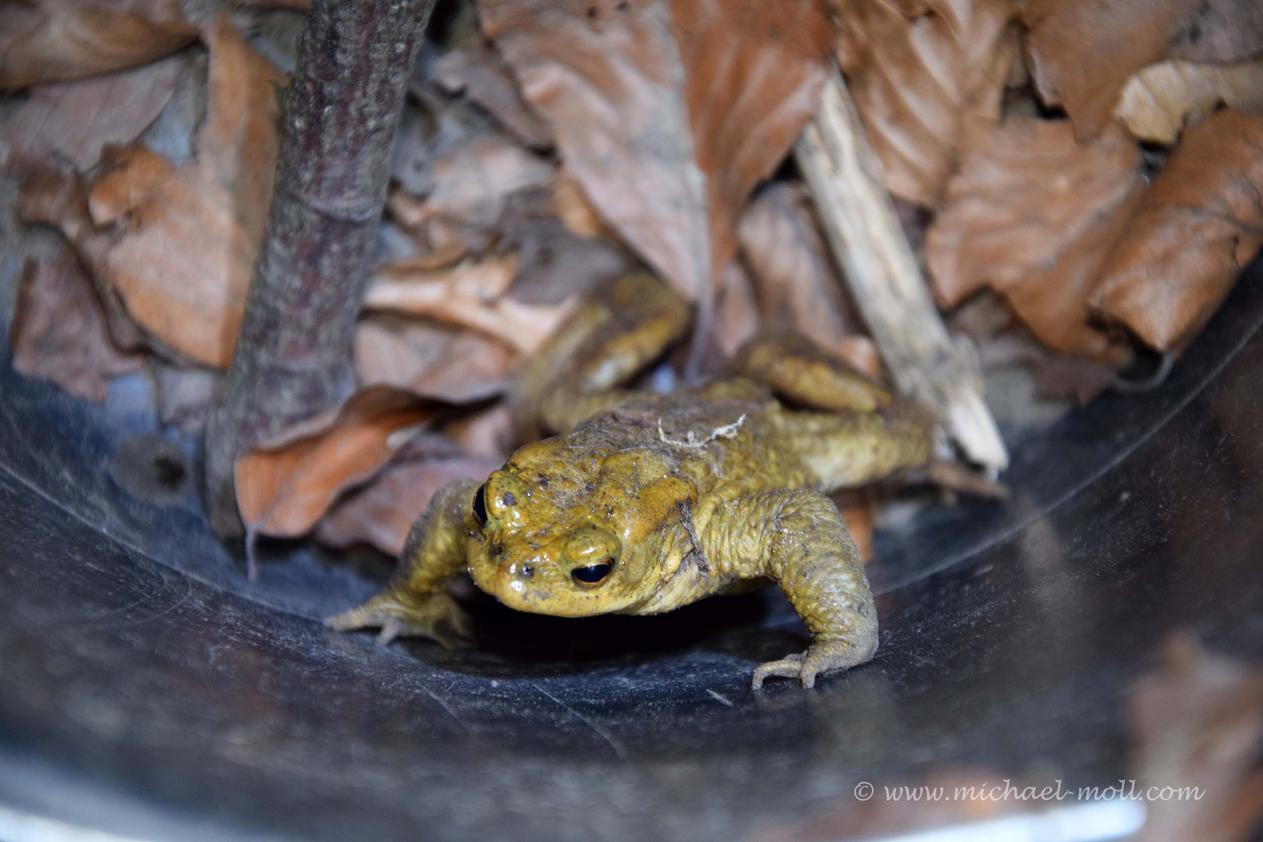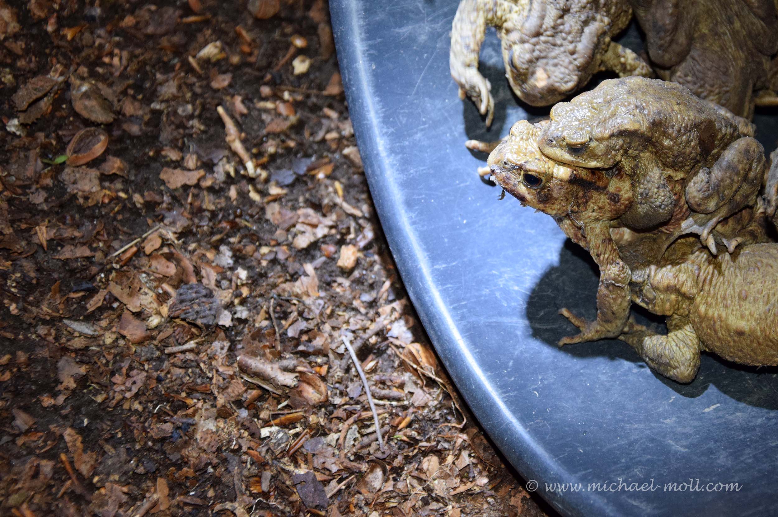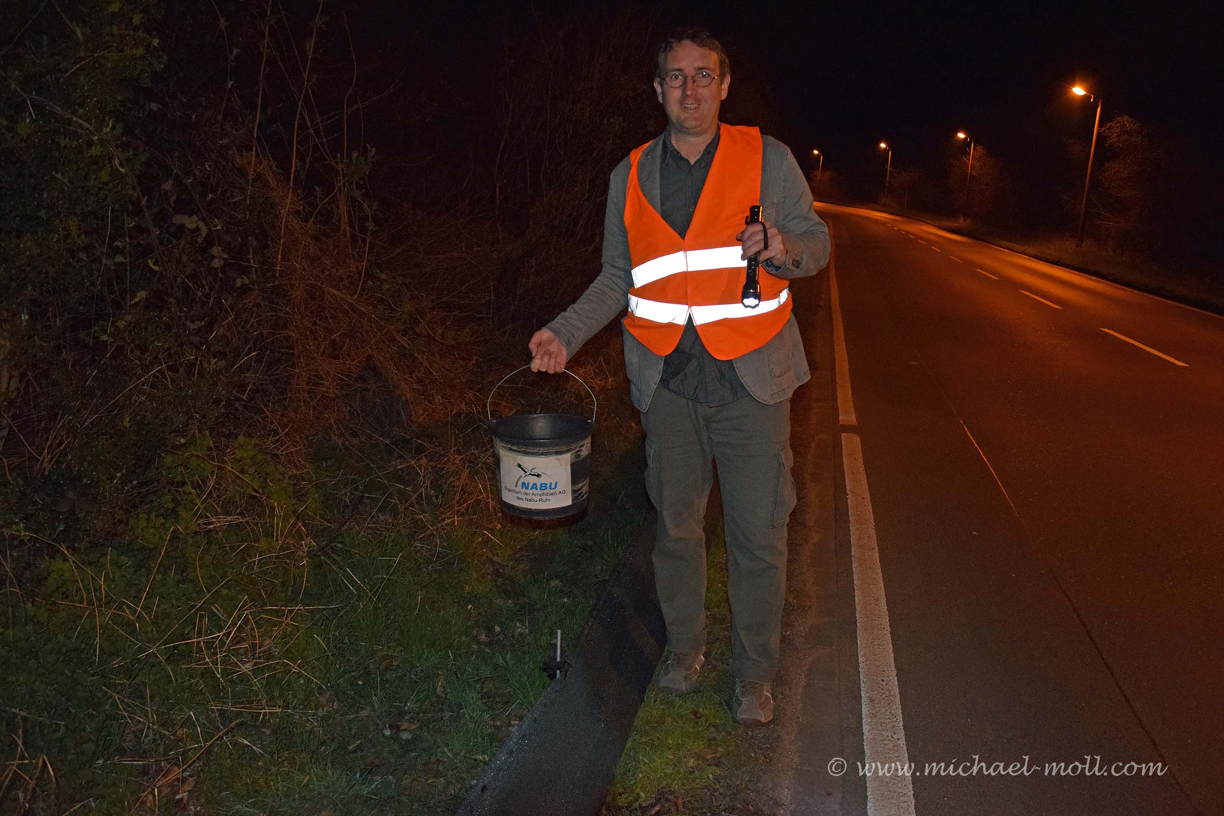 Damit bleiben die Kröten auf der sicheren Seite der Straße, wandern ein wenig am Zaun entlang und fallen in kleine Eimer, die in den Boden eingelassen wurden. Jetzt müssen nur noch ein paar ehrenamtliche Helfer kommen, die Kröten einsammeln und sie auf die andere Straßenseite transportieren, wo sie dann gleich weiterziehen.