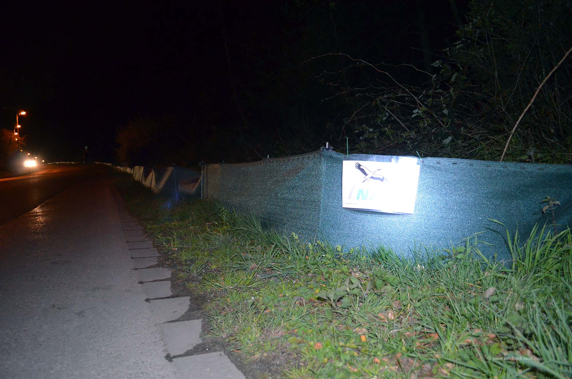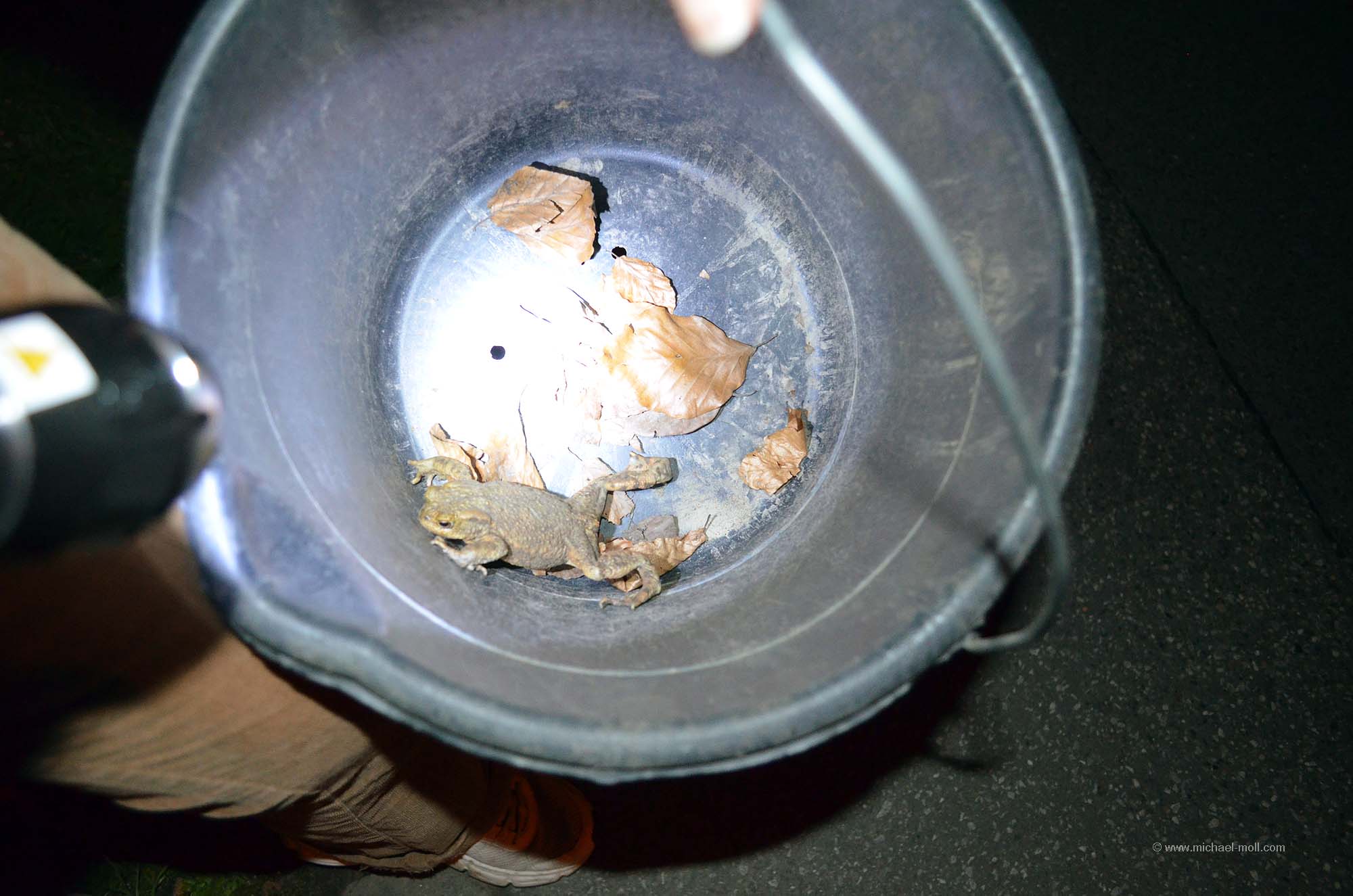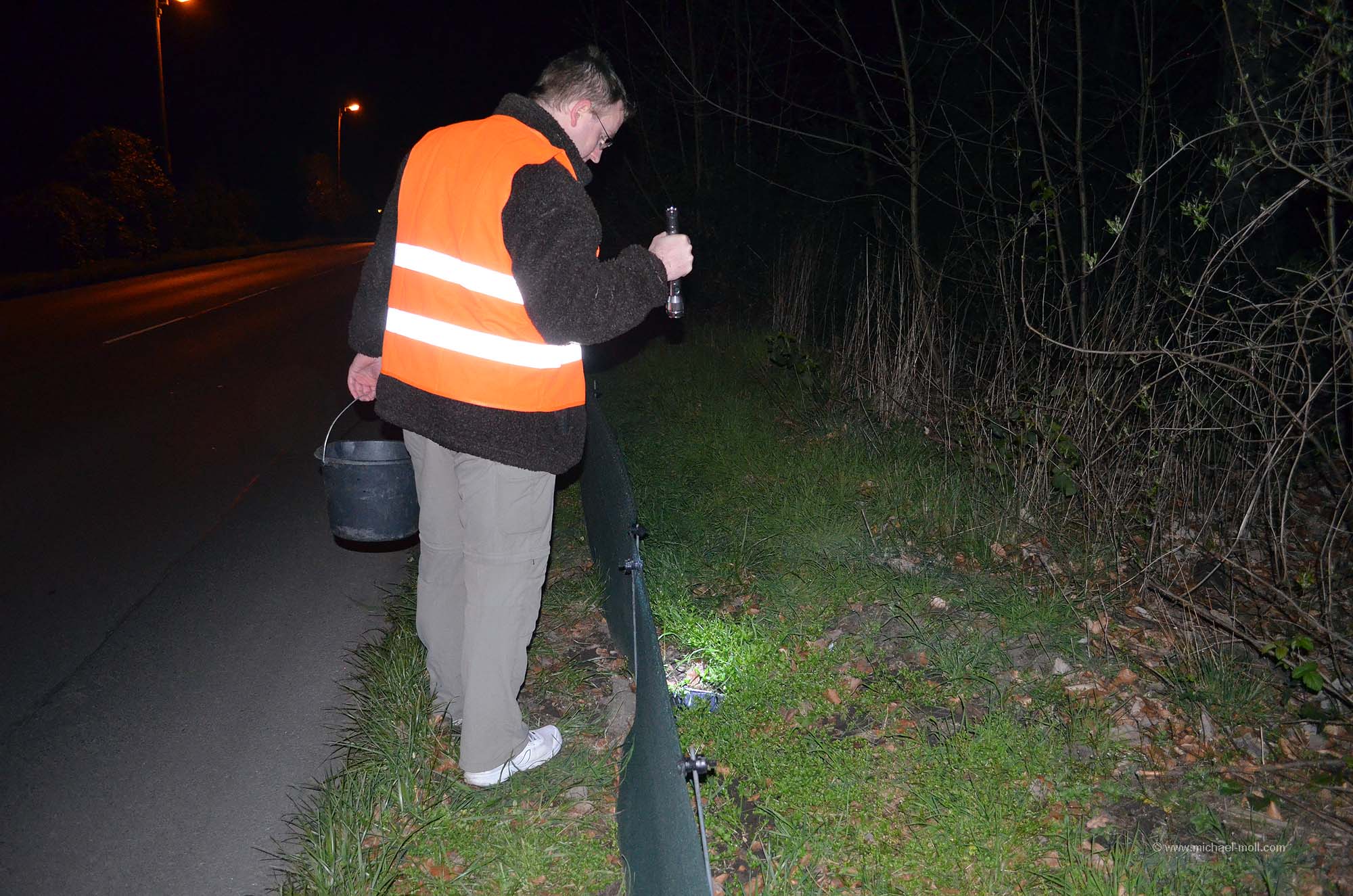 Die Helfer vom NABU hatten bereits auf einer Seite der Straße eine rund 30 cm hohe Folienwand augestellt, die die Kröten auf ihrem Weg vom Winterquartier zum Laichgewässer ausbremst und vor dem Verkehrstod bewahrt. An der unüberwindlichen Barriere wandern die Kröten nun entlang, bis sie auf eine Haltestelle in Form eines Plastikeimers stoßen. Dieser ist im Erdboden eingegraben, sodass die Tiere sich nur hineinfallen lassen müssen. Die Aufgabe der Bediensteten des Krötennahverkehrs besteht nun darin, die Kröten aus dem Eimer zu nehmen und über die Straße zu einem Ablageplatz zu bringen, wo sie die restlichen Meter zu ihrem Laichplatz alleine krabbeln.