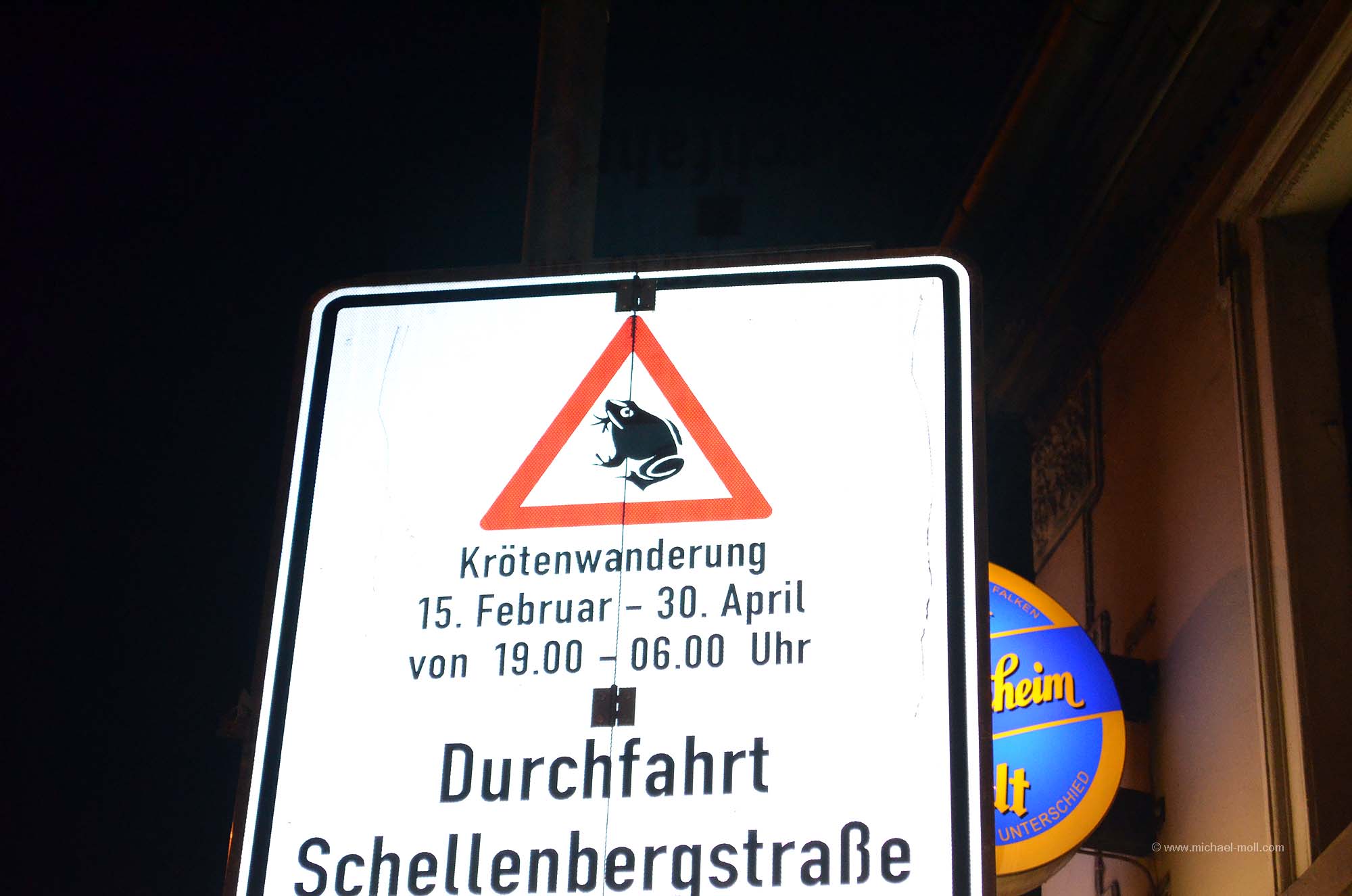 Außerdem sollen die Tiere natürlich noch für die Statistik gezählt werden. Das war bei mir der einfachste Teil, denn an allen Abenden, an denen ich mich für den Dienst eingetragen hatte, war es den Kröten zu kalt und es kam keine einzige zu dem Schutzzaun. An fast allen anderen Abenden kamen teilweise über 30 Kröten zusammen – nur eben bei mir nicht. In tiefster Verbitterung über diesen Umstand war ich bereits im Begriff, eine Verschwörungstheorie zu entwickeln, bis ich dann gestern Abend auch endlich meine erste Kröte retten durfte. Nur: Sie rannte in die falsche Richtung und ich kam gerade mit dem Auto an, als das Tier über die Straße krabbelte. Welch tragisches Schicksal hätte das werden können: Der Krötenretter überfährt die einzige Kröte, als er gerade am Einsatzort ankommt.