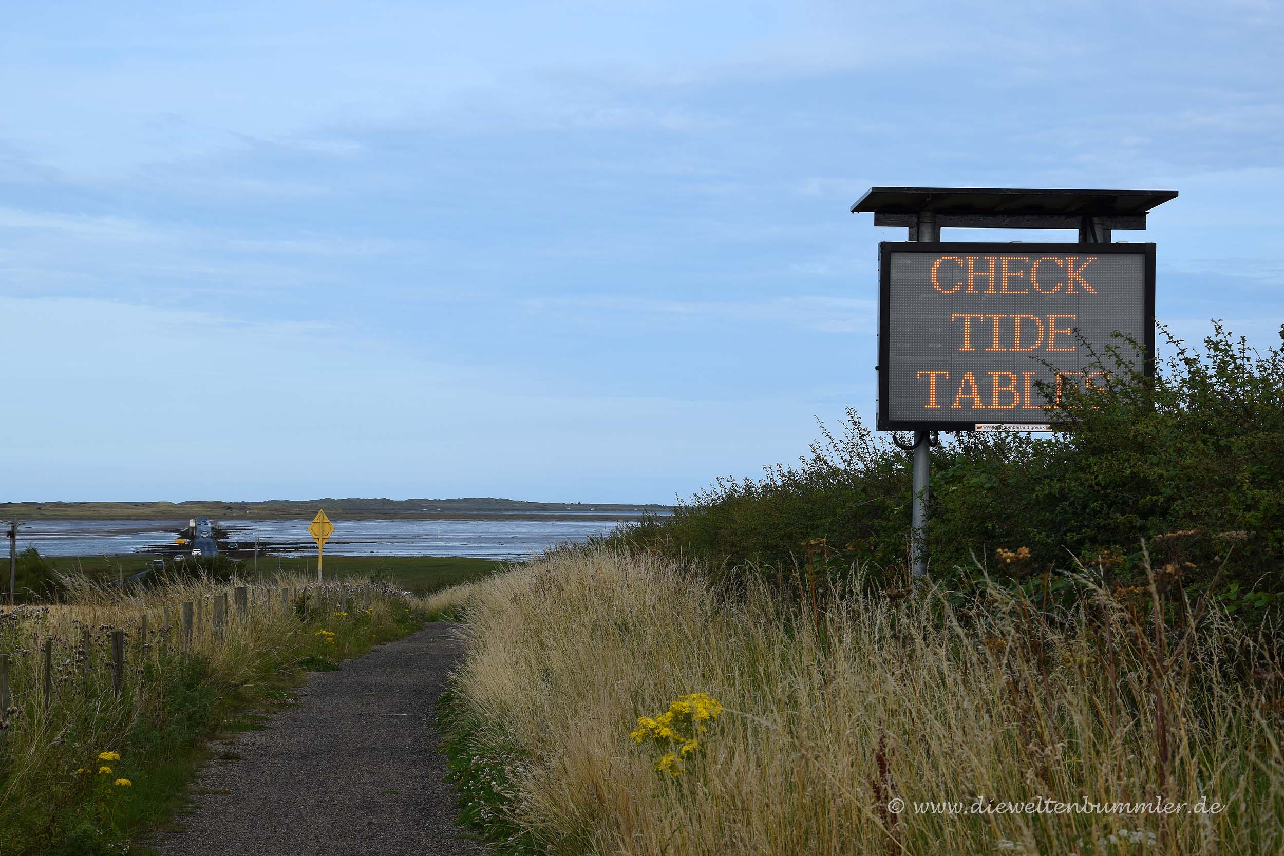 Holy Island ist aber eine Insel, die bei Ebbe mit dem britischen Festland verbunden ist. Sie ist also eine sogenannte Gezeiteninsel. Sobald die Flut verschwunden ist, offenbart sich auf dem Meeresboden eine vollkommen intakte Fahrspur aus Asphalt. Am Ufer des Festlands wird man mittels Digitalanzeige auf die Gefahren solch einer Straße aufmerksam gemacht und darauf hingewiesen, dass man sich doch bitte schön den Tidenzeiten widmen soll, die am Wegesrand aufgestellt wurden.