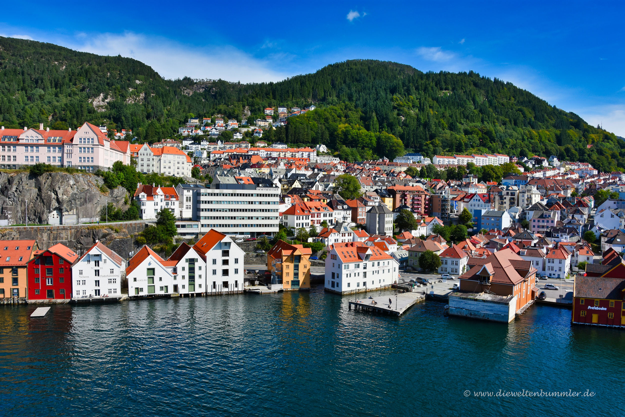 Bergen liegt auf gleicher Höhe wie die Shetland-Inseln und nur geringfügig höher als die norwegische Hauptstadt Oslo. Die Stadt befindet sich inmitten der tollen norwegischen Fjordlandschaft und ist von der Fläche her gar nicht so groß. Daher halte ich mich eigentlich auch selten lange in der Stadt auf. Bei einem Landgang hat man ja ohnehin nicht so viel Zeit, aber auch bei einer Reise mit dem Wohnmobil durch Norwegen, habe ich bisher nicht den Ansporn gehabt, in Bergen zu übernachten.