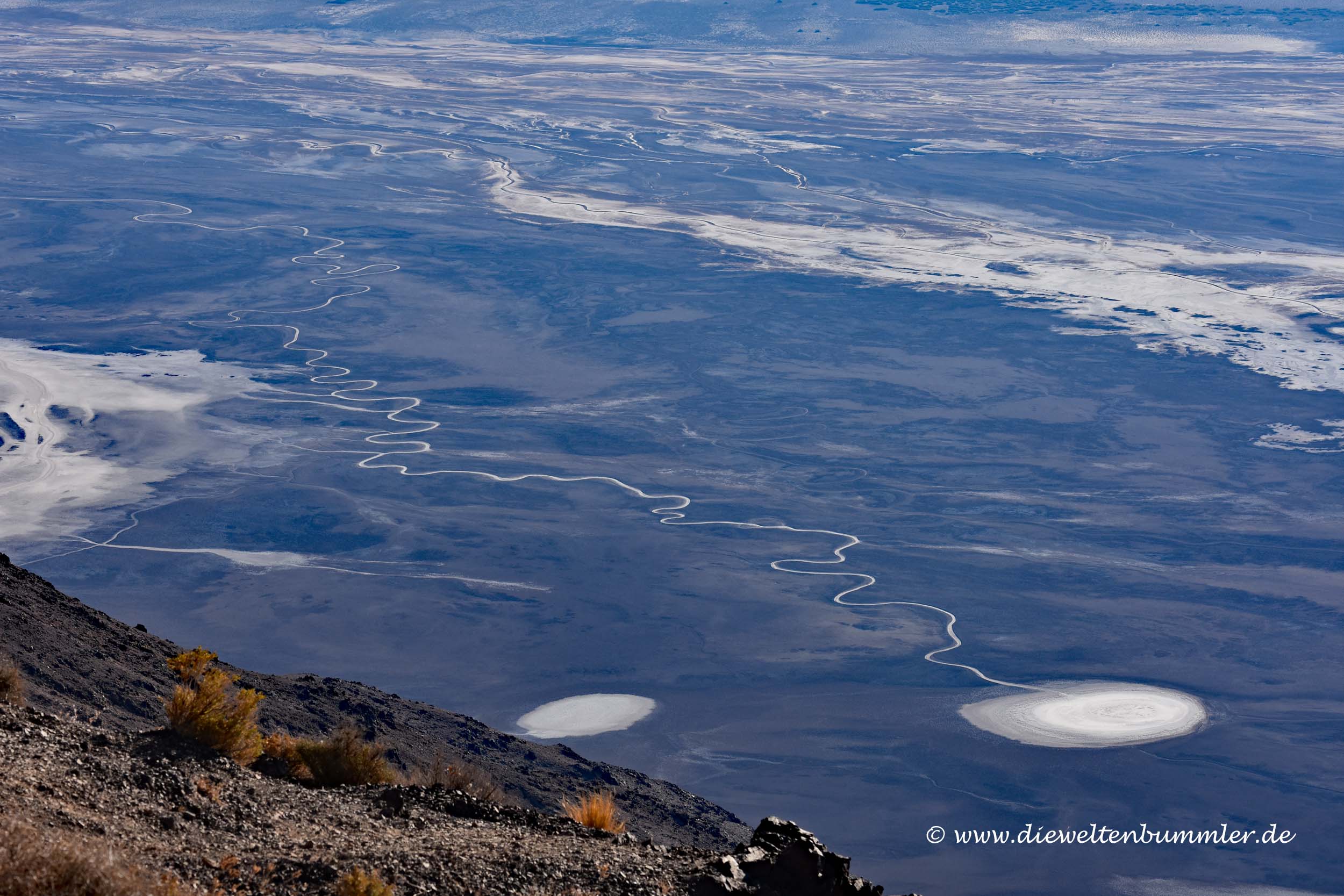 Am Badwater Basin hat man die Möglichkeit, weit in die Salzpfanne des Tals hinein zu gehen, die sich hier vor langer Zeit gebildet hat. Sehr interessant und unbedingt sehenswert. Aber die wahre Größe dieser Salzfläche sieht man wirklich erst von oben, von Dante’s View aus.