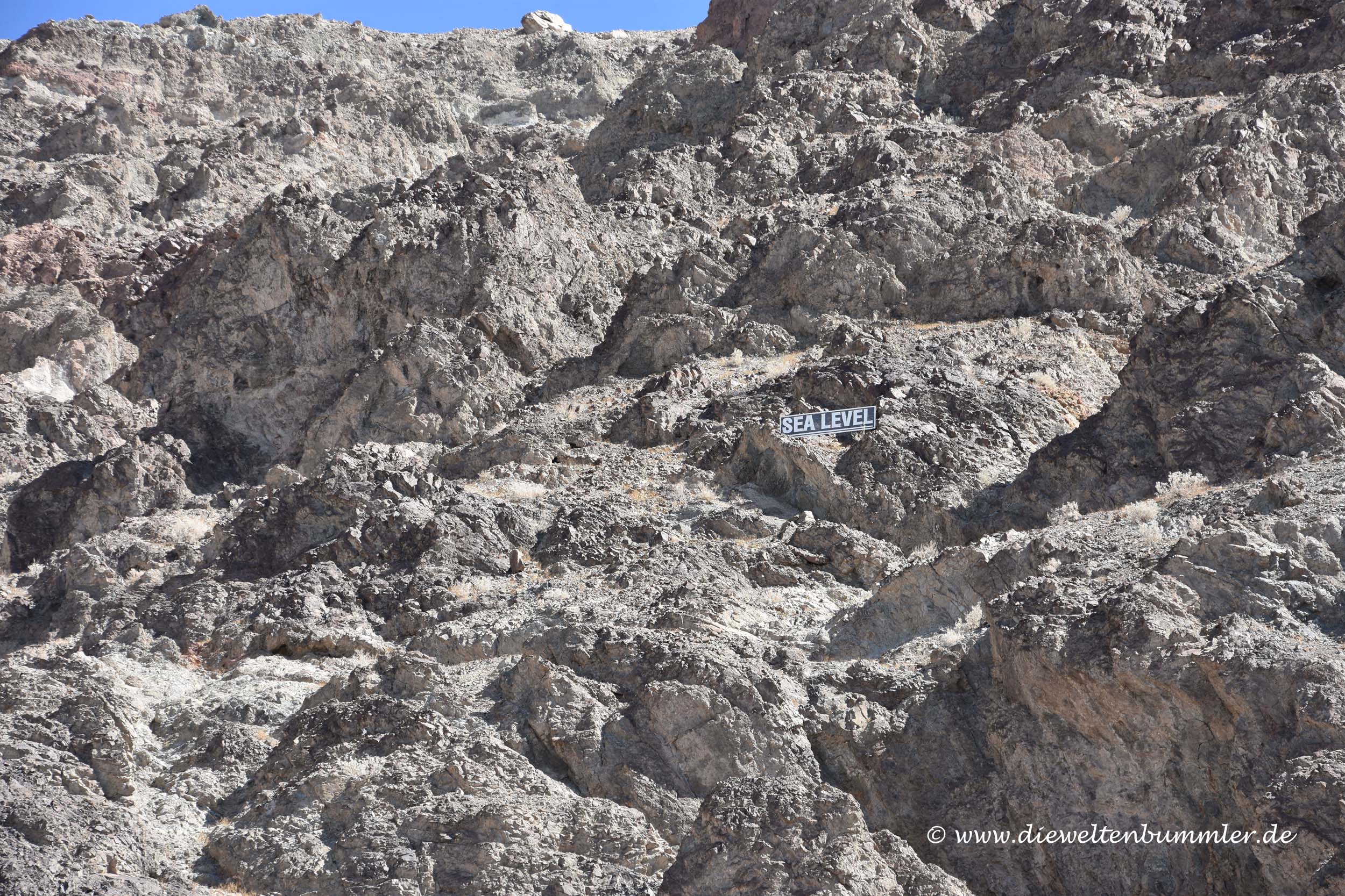 Denn unser erstes Ziel sollte das Badwater Basin sein. Dabei handelt es sich um den tiefsten Punkt der USA. Exakt 85,5 Meter steht man hier unter dem Meeresspiegel. Auf der anderen Seite der Straße ragt eine Felswand steil aufwärts. Wer hier genau hinsieht, der erkennt irgendwo in der Höhe zwischen den Felsen ein kleines Schild, das auf den Meeresspiegel hinweist. Diese Felswand ist übrigens rund 1.600 Meter hoch und beherbergt weiter oben Dante’s View, von wo aus man Badwater wunderbar von oben sehen kann. Doch dazu später mehr.