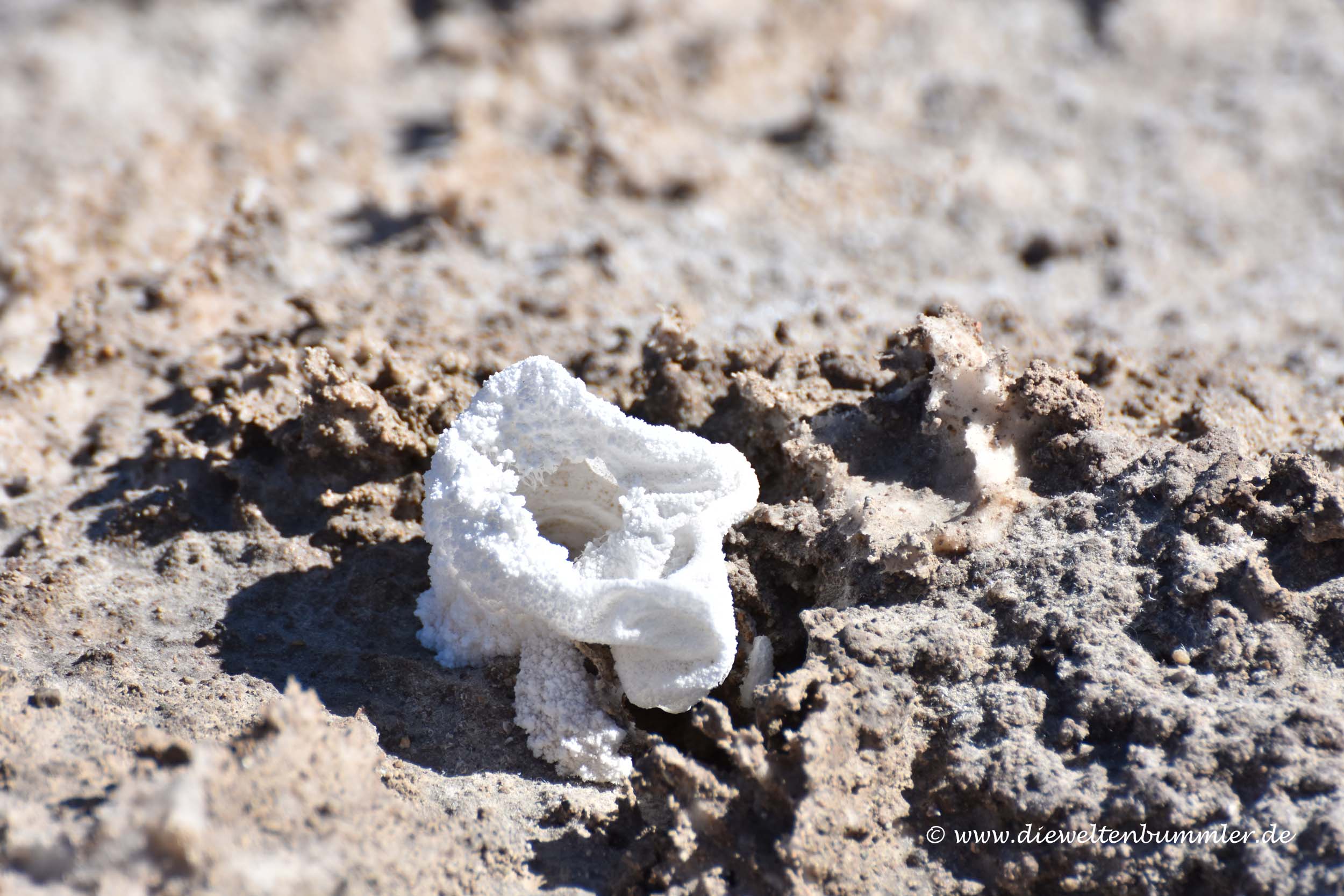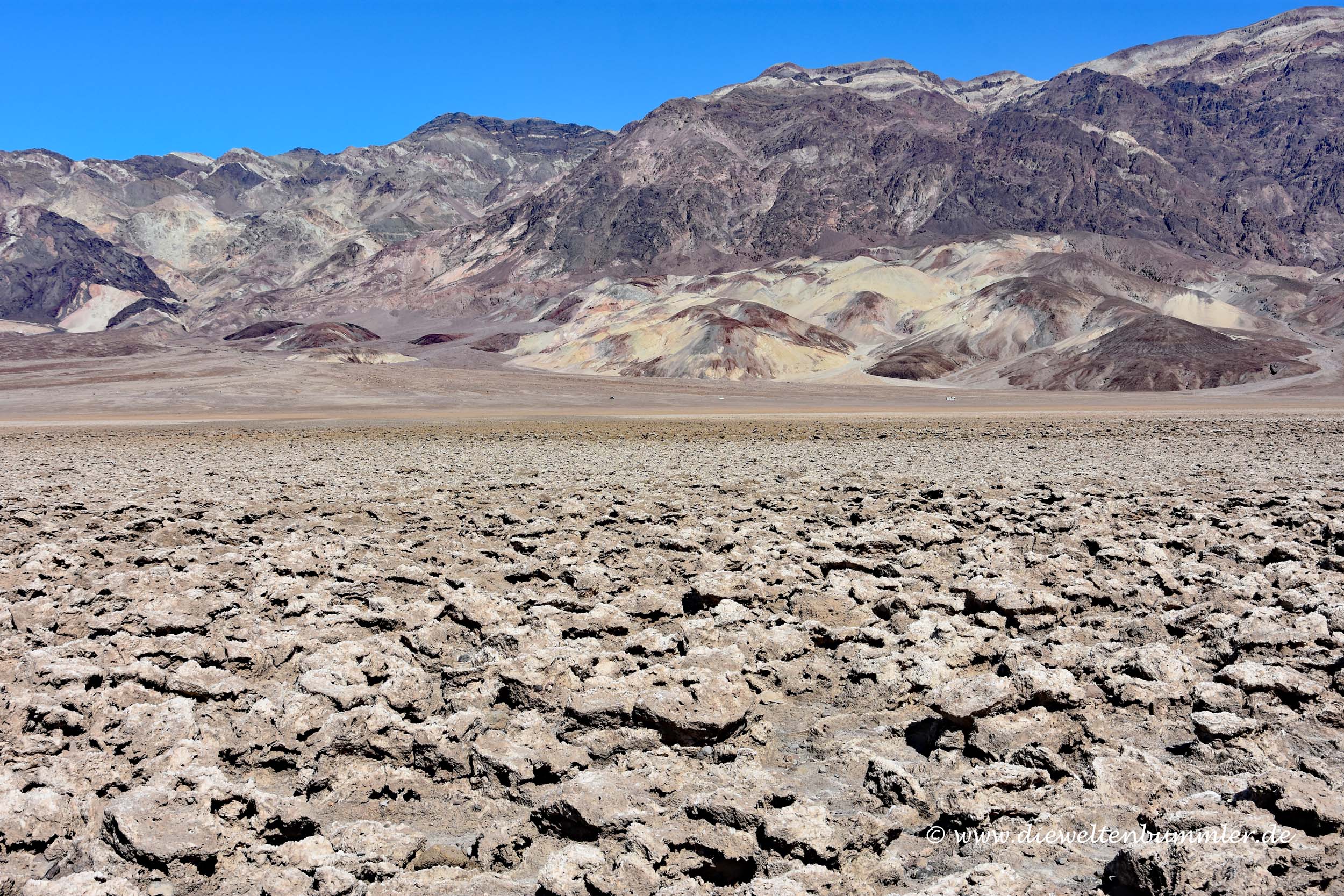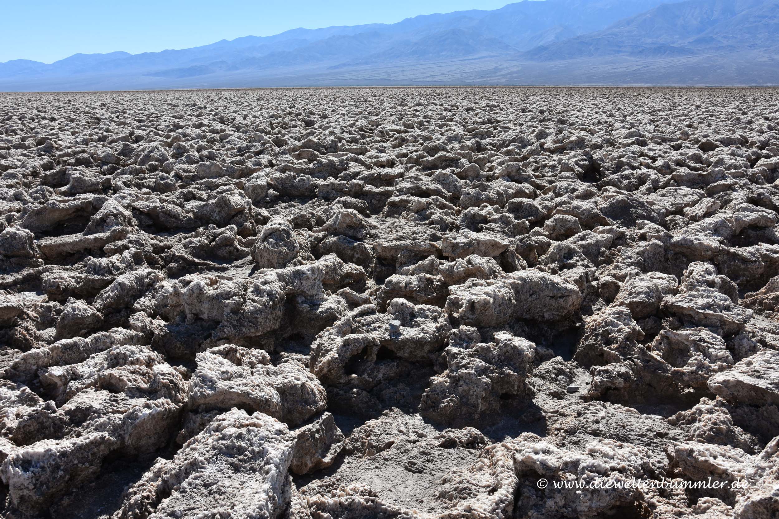Nicht weit vom Badwater Basin liegt der sogenannte Devil’s Golf Course. Hier ist es mit dem Laufen nicht ganz so einfach. Stark zerklüftete und scharfkantige Salzstrukturen ragen teilweise bis auf Kniehöhe auf und können ganz schnell Schmerzen verursachen. Wir haben das ein wenig mit den bekannten Seepocken im Wattenmeer der Nordsee verglichen, die auch sehr scharfkantig sein können. Stolpert man dort, hat man sich in der Regel mindestens einige Kratzer zugezogen. So eben auch am Devil’s Golf Course. Daher blieben wir hier nicht länger. War aber nett zu sehen.