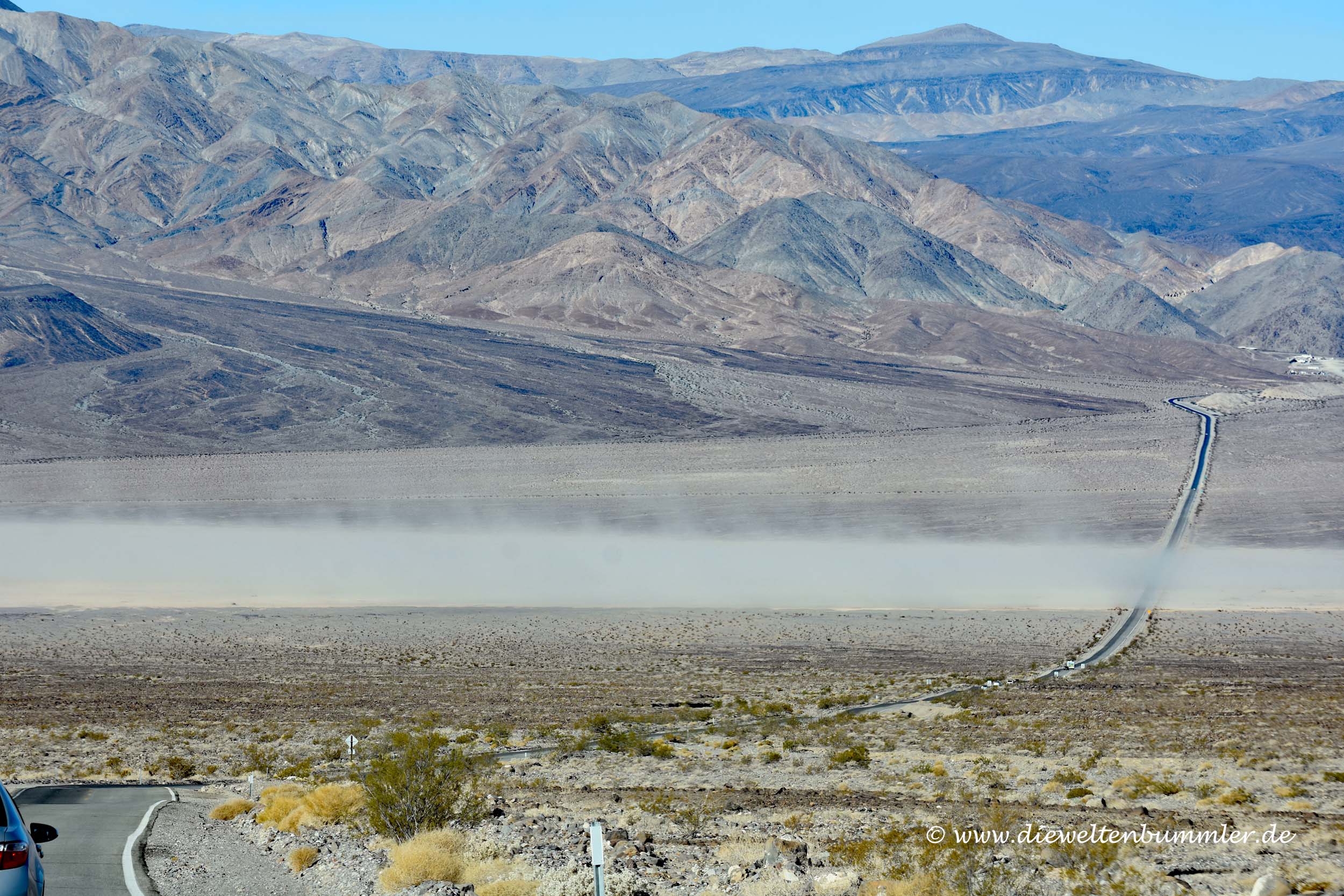 Das eigentliche Tal ist ziemlich breit, ich würde schon fast sagen, es ist eine weite Ebene, die irgendwo an den Seiten von Bergmassiven flankiert wird. Wie das halt in den USA so ist, alles ist etwas größer. Man darf sich das Death Valley auf keinen Fall als enges Tal vorstellen.