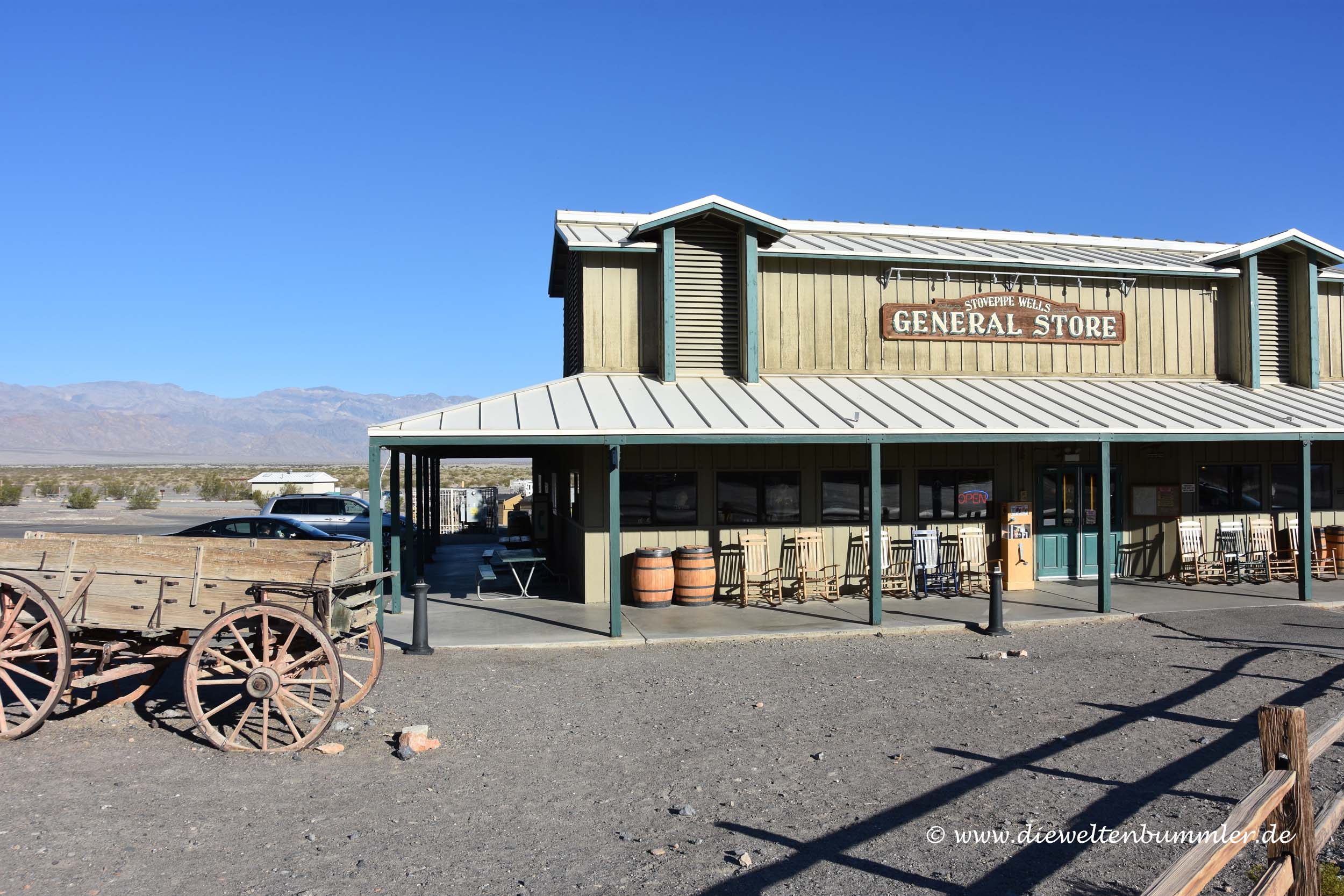 Gleich hinter dem Towne Pass gelangt man zum Stovepipe Wells. Dieser Ort, wenn man ihn so nennen kann, besteht aus einem Campingplatz, einer Landebahn, einer Tankstelle mit Souvenirshop und einem Motel, dass sich ein wenig im Westernstil präsentiert. In diesem Motel sind wir für eine Nacht untergekommen und haben es trotz der hohen Kosten nicht bereut.