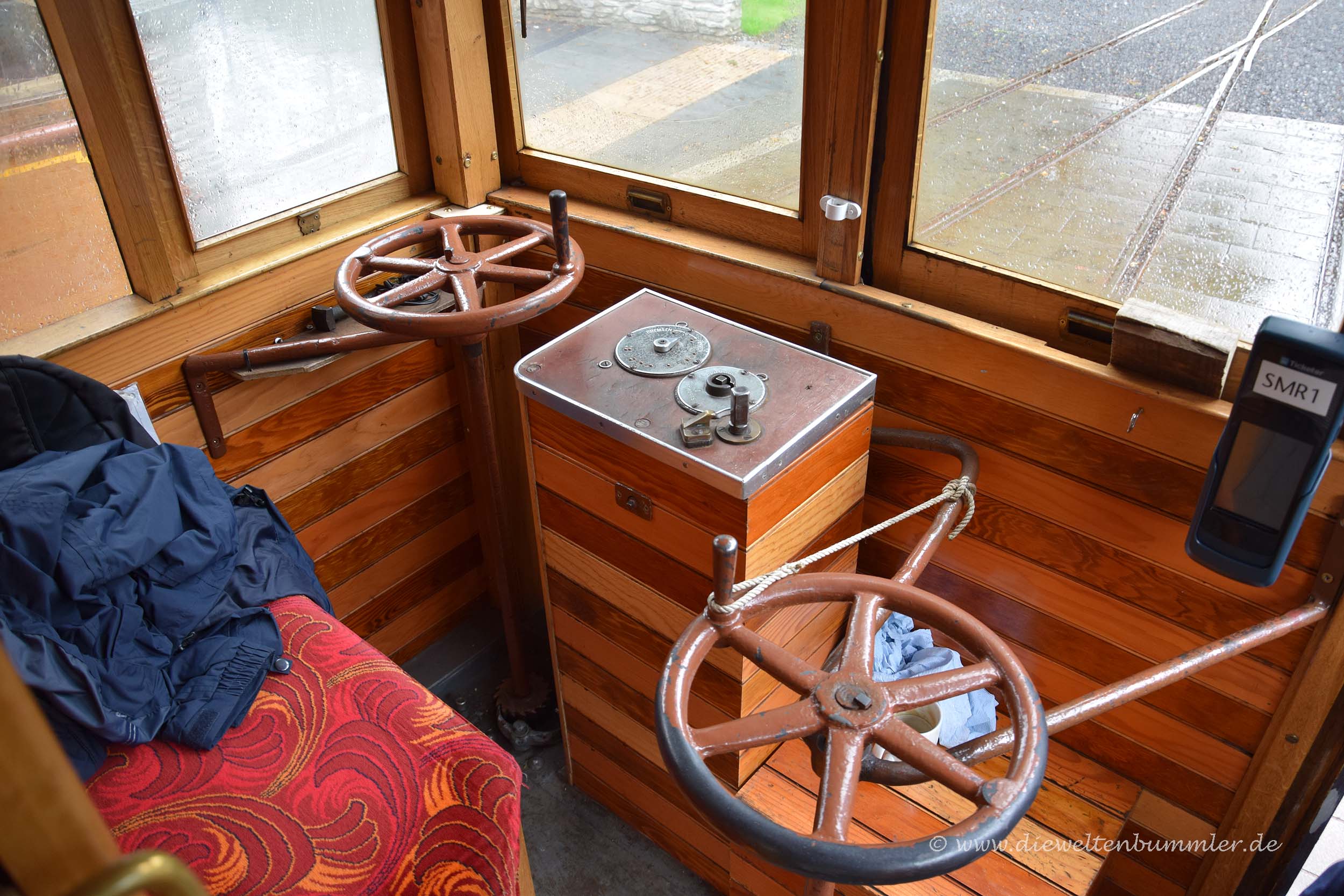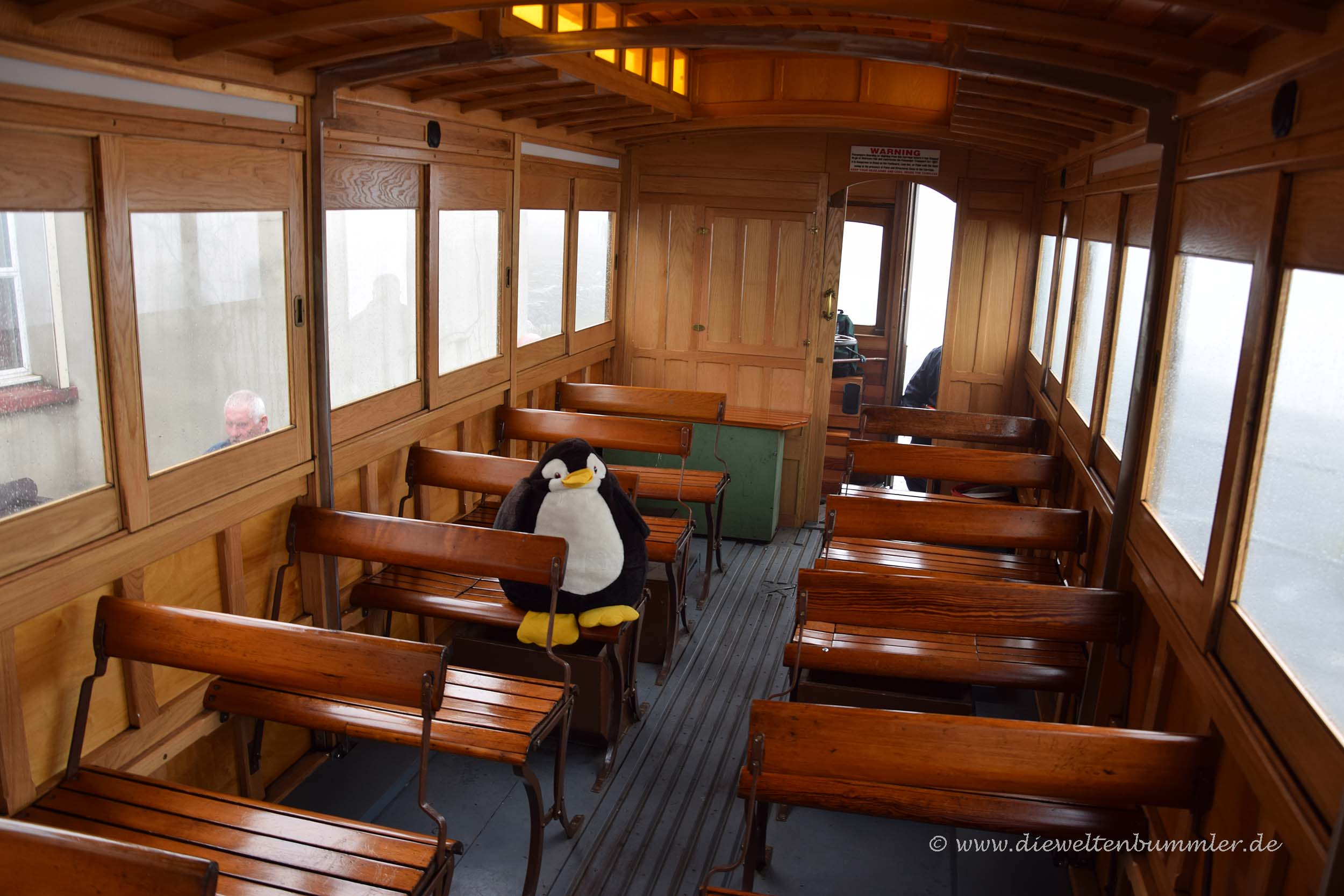 Also ließen wir uns hinauf- und auch wieder hinabtransportieren. Wenn die kleine holzvertäfelte Bahn den ebenso kleinen Bahnhof von Laxey verlässt, muss sie zunächst die Landstraße überqueren, wo zum ersten Mal ausdauernd ihre Klingel zu hören ist.