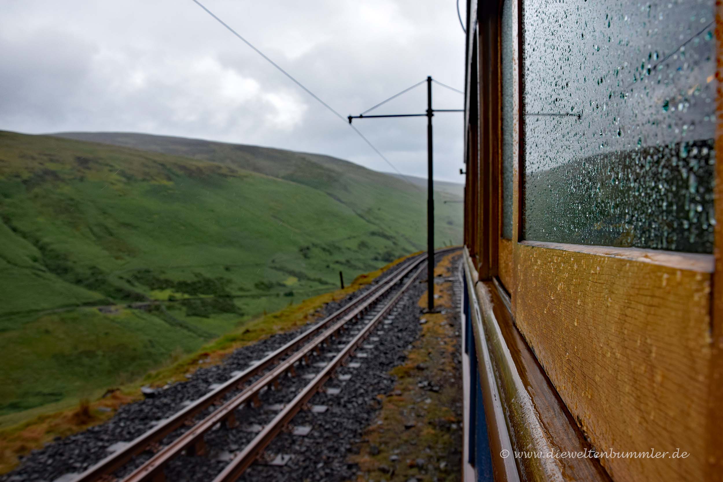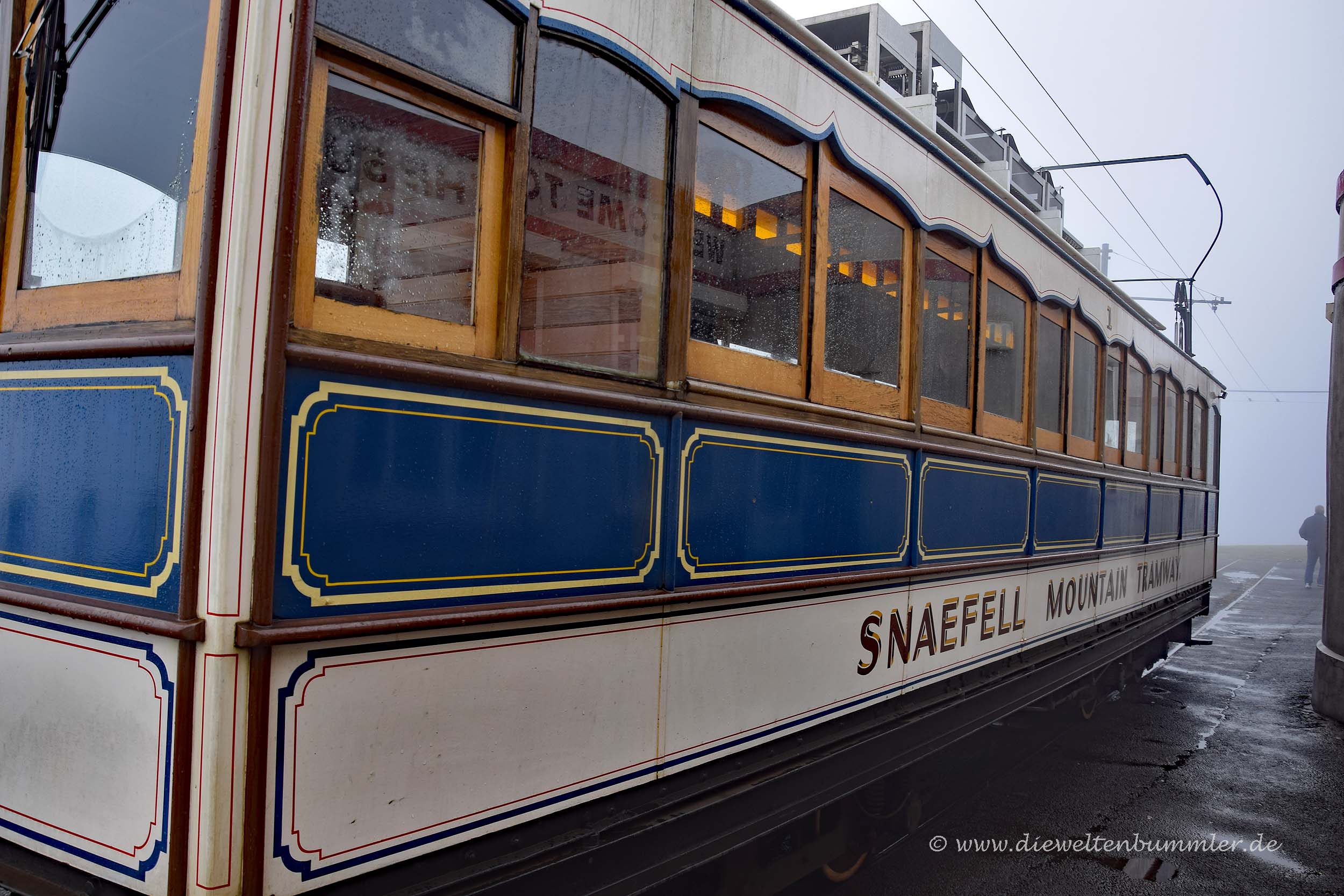 Mit der Snaefell Mountain Railway stellt das Erreichen des Gipfels keine Herausforderung dar. Eigentlich hatten wir auf eine kleine Wanderung gehofft, die wir mit der Bahn kombinieren könnten. So machten wir es ja auch einst mit der Zahnradbahn in Wales, die auf den Snowdon fährt. Doch hier auf der Isle of Man war das Wetter einfach zu schlecht und es hätte nur wenig Spaß gemacht, durch dichte Wolken durch den Regen zu stapfen und ohnehin nichts zu sehen.