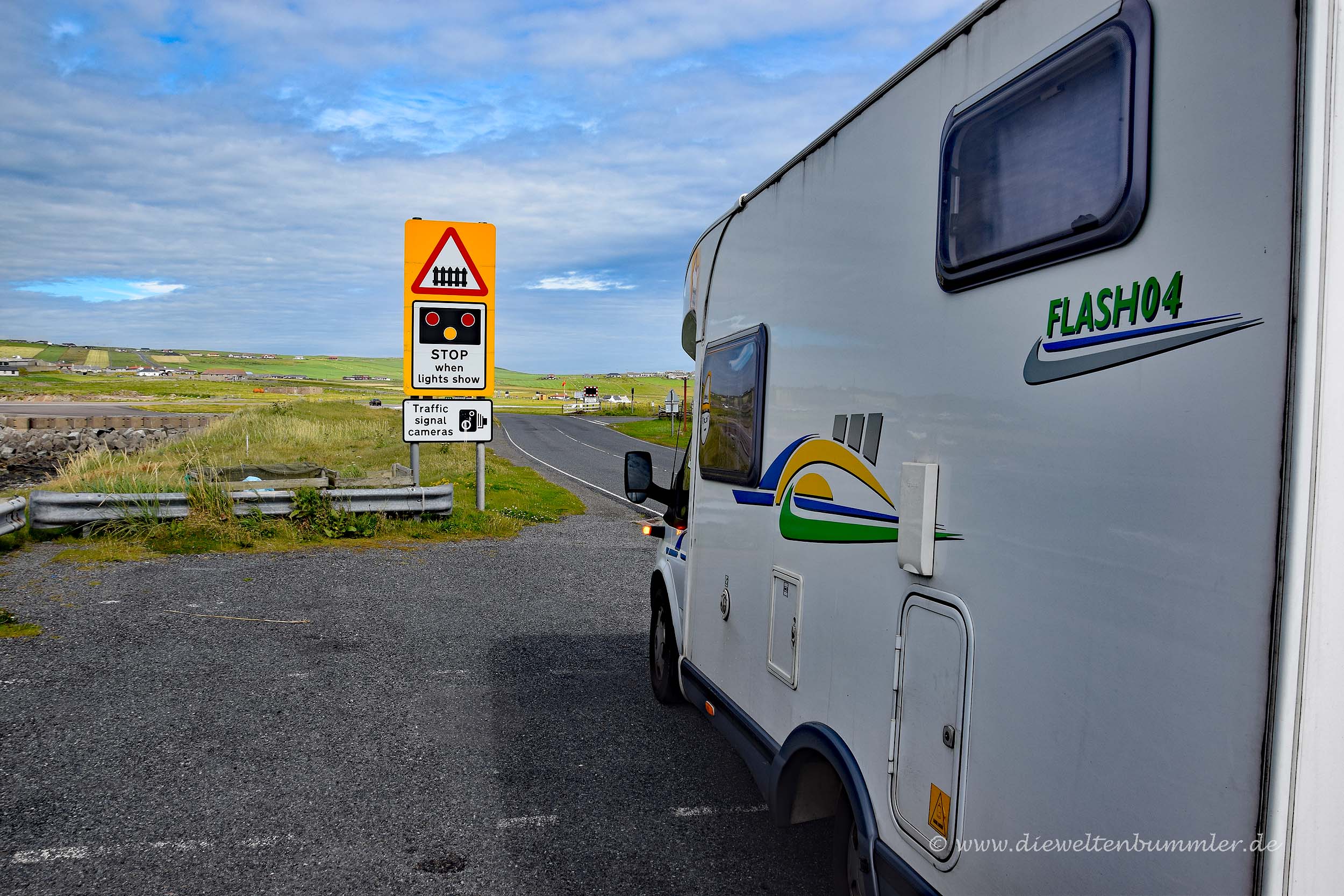 Um zum Jarlshof zu gelangen folgt man der A970, die eine weitere Besonderheit aufweist. Sie überquert nämlich ganz nebenbei die Start- und Landebahn des Inselflughafens. Landet also ein Flugzeug, muss man logischerweise erst einmal abwarten. Aber auf dem Flughafen ist nicht ganz so viel los. Uns ist es kein einziges Mal passiert, dass wir einem Flieger die Vorfahrt gewähren mussten.