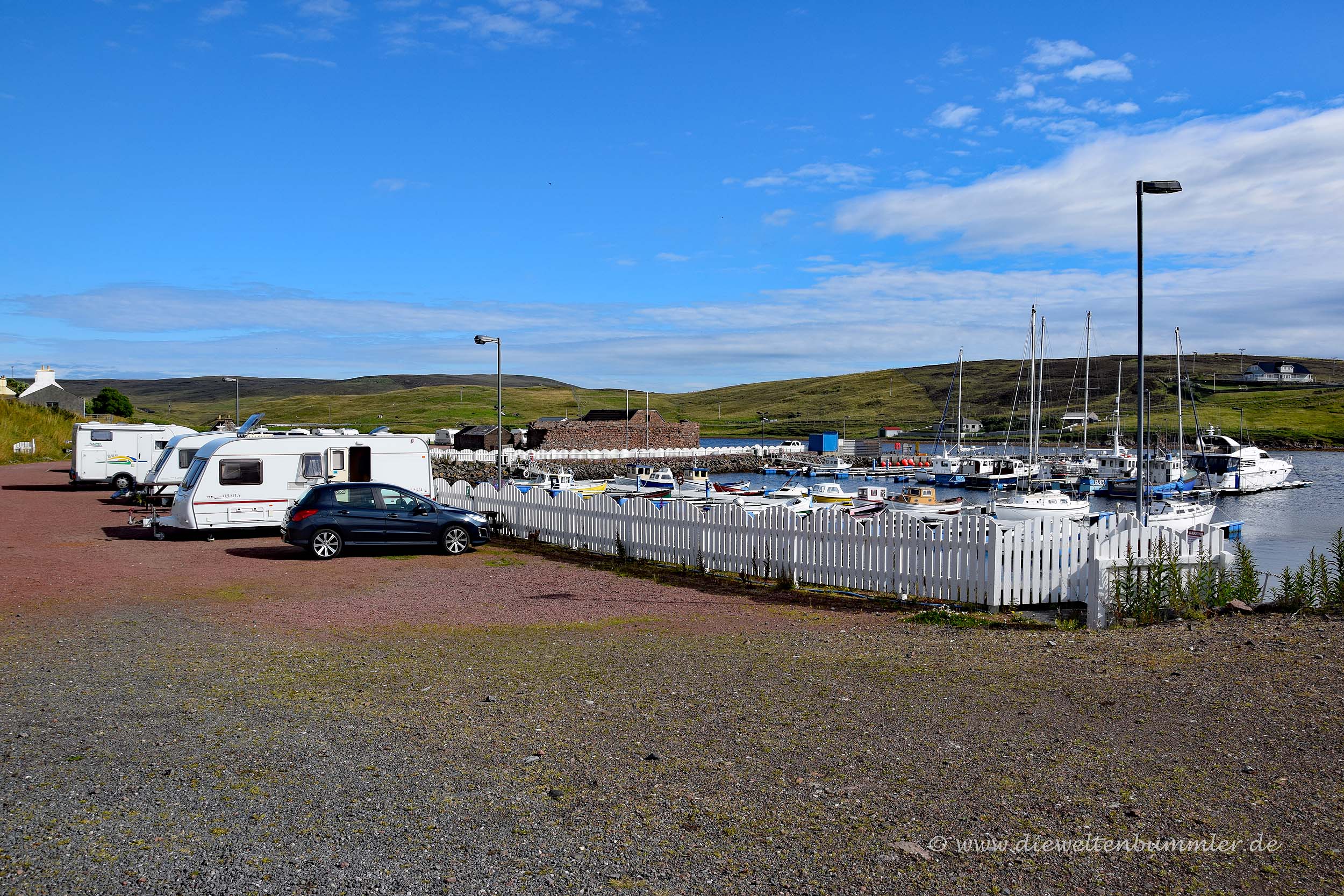 Auch auf Unst besteht die Möglichkeit, mit dem Wohnmobil wunderbar zu stehen. Im Süden, in der Bucht von Uyea, genau gegenüber der gleichnamigen kleinen Insel, befindet sich ein offizieller Wohnmobilstellplatz mit fünf Stellflächen inklusive Strom. Mit der Motorhaube ist man dort ganze sechs oder sieben Meter vom Meer entfernt. Einfach traumhaft, so wie die Shetland-Inseln allgemein.