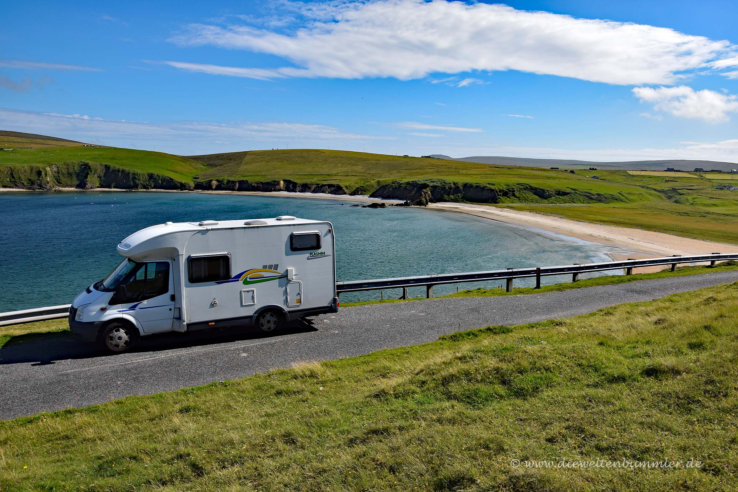 Etwas weiter südlich findet man bei Scousburgh eine weitere schöne Bucht, wo man sogar ganz offiziell mit dem Wohnmobil übernachten darf. Klar, es ist ein Campingplatz, aber ein Campingplatz auf den Shetland-Inseln sieht nun einmal ganz anders aus, als das was man vom europäischen Festland gewohnt ist.