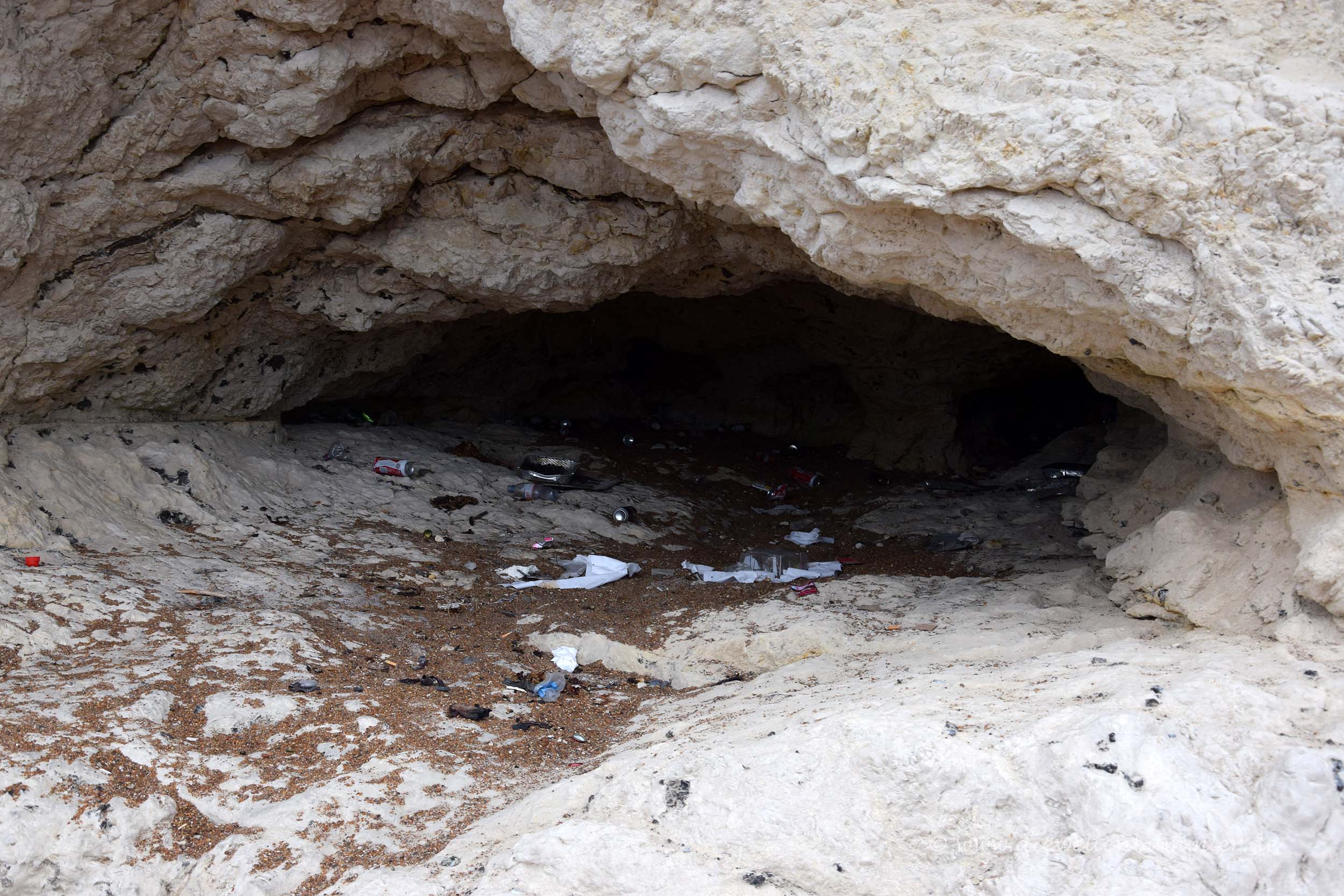 Zwei verschiedene Höhlen an der Jurassic Coast in Südengland. Die Kreidefelsen stehen auf der Liste der Unesco-Weltnaturerben, aber ganz sicher nicht, weil hier offenbar noch Höhlenmenschen leben. Den Zustand der Höhlen erkennt man wohl deutlich auf den Bildern.